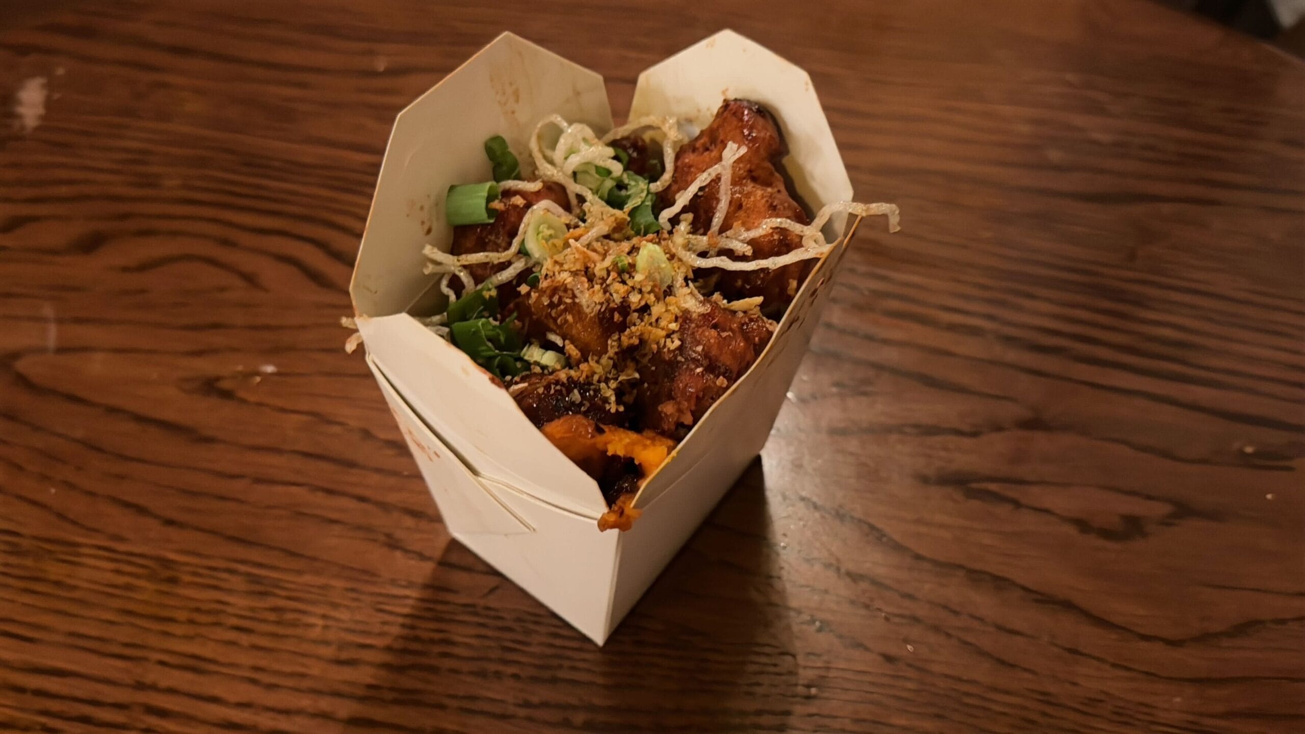 Fried chicken tenders with orange-soy glaze, glass noodles, green onions, and crispy garlic