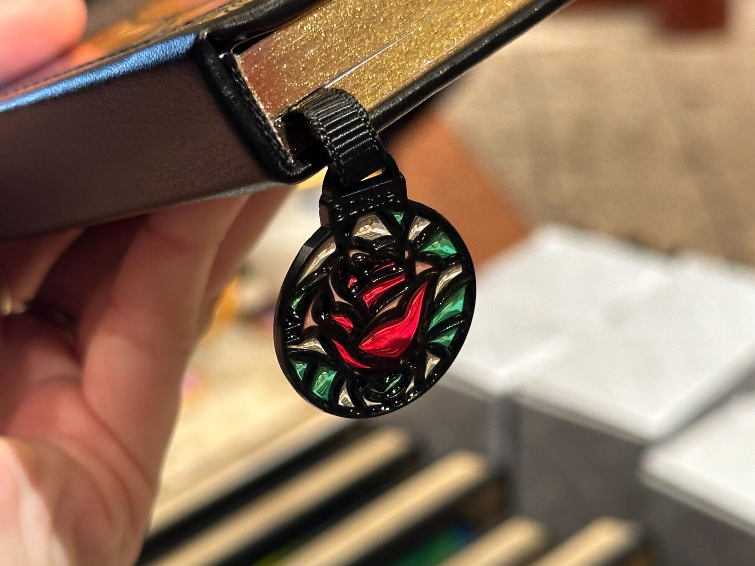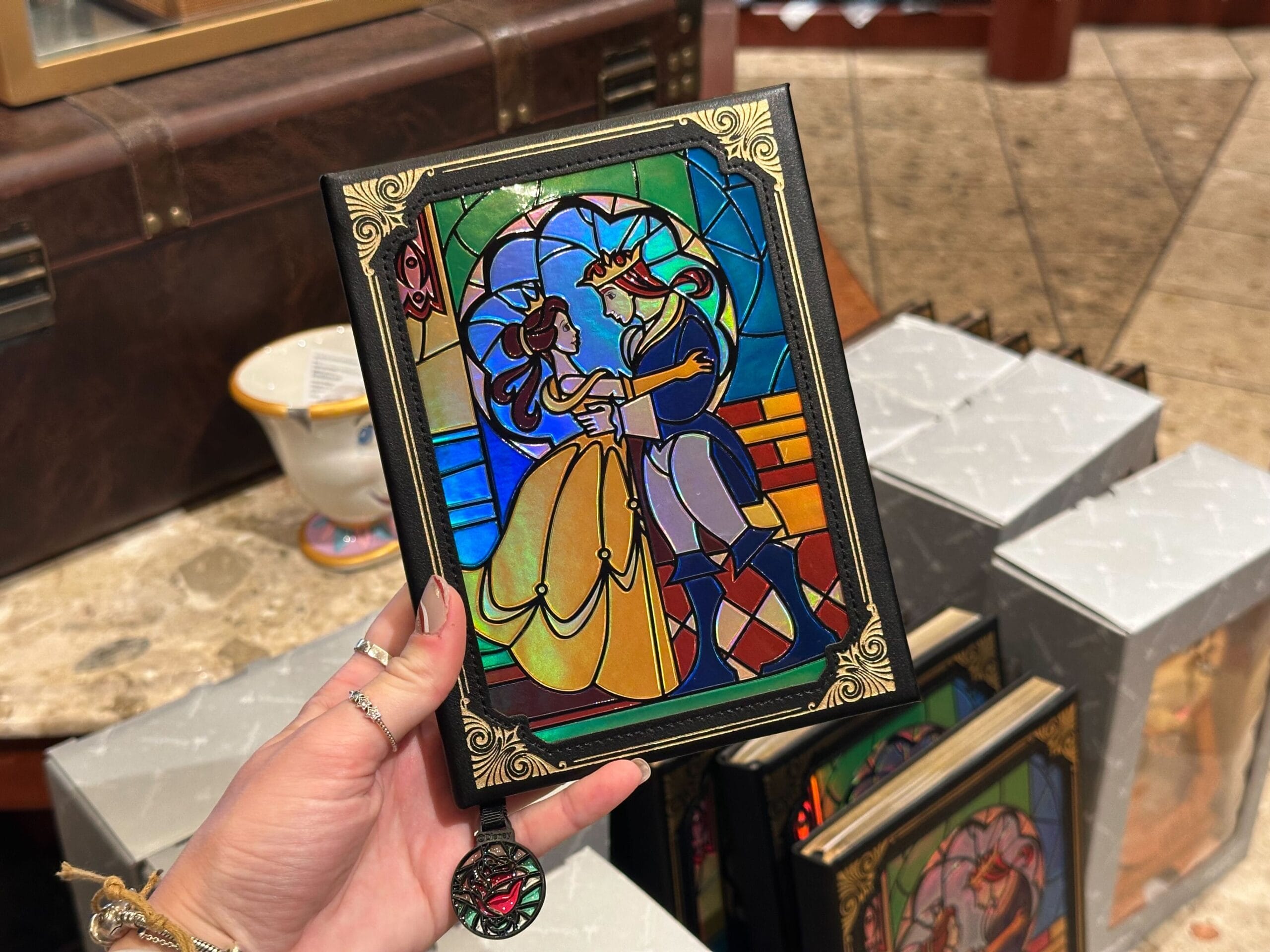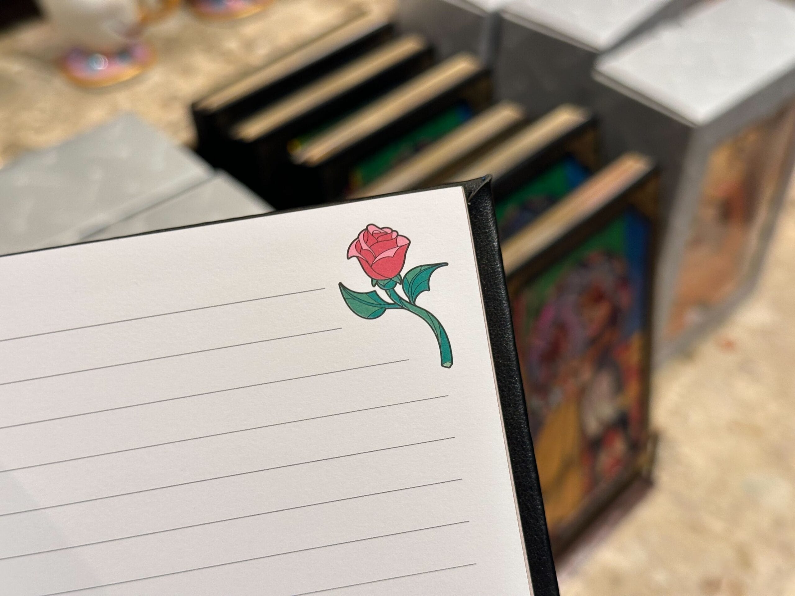 The pages on the right-hand side of the book display the iconic red rose in the upper right corner. The bookmark also has a miniature stained glass emblem of the rose attached to a black ribbon. We found this journal at Once Upon a Time in Disney’s Hollywood Studios.