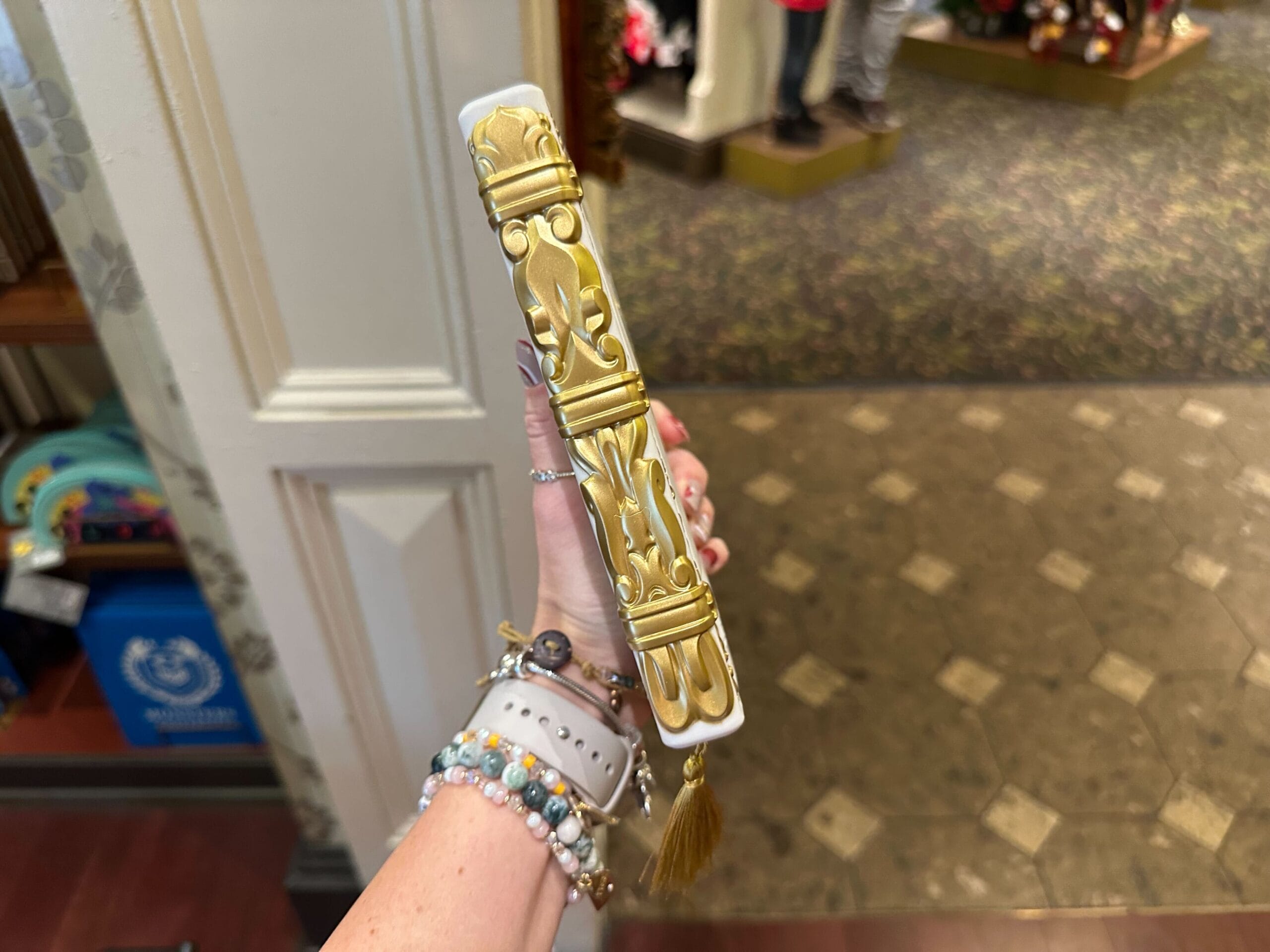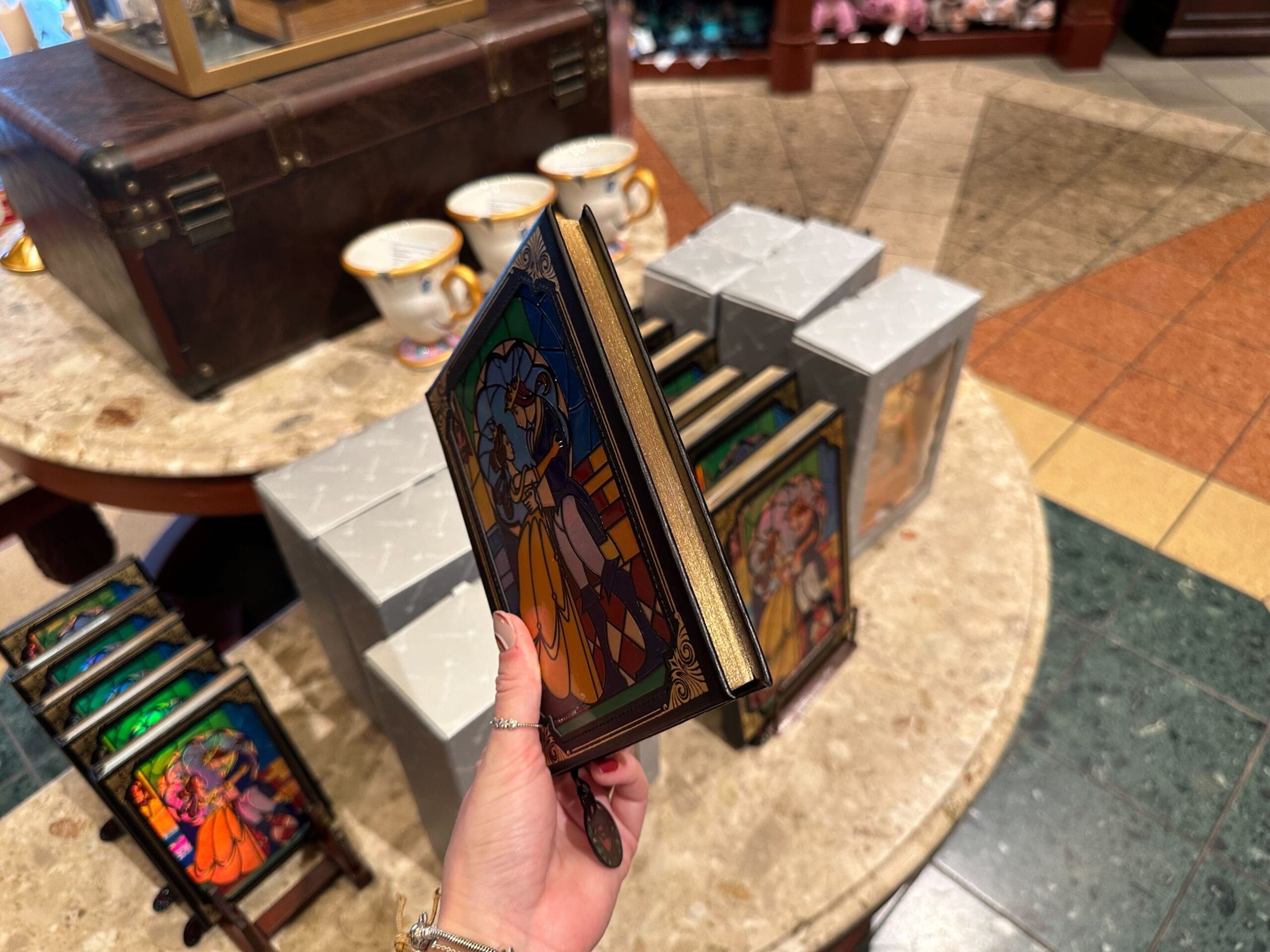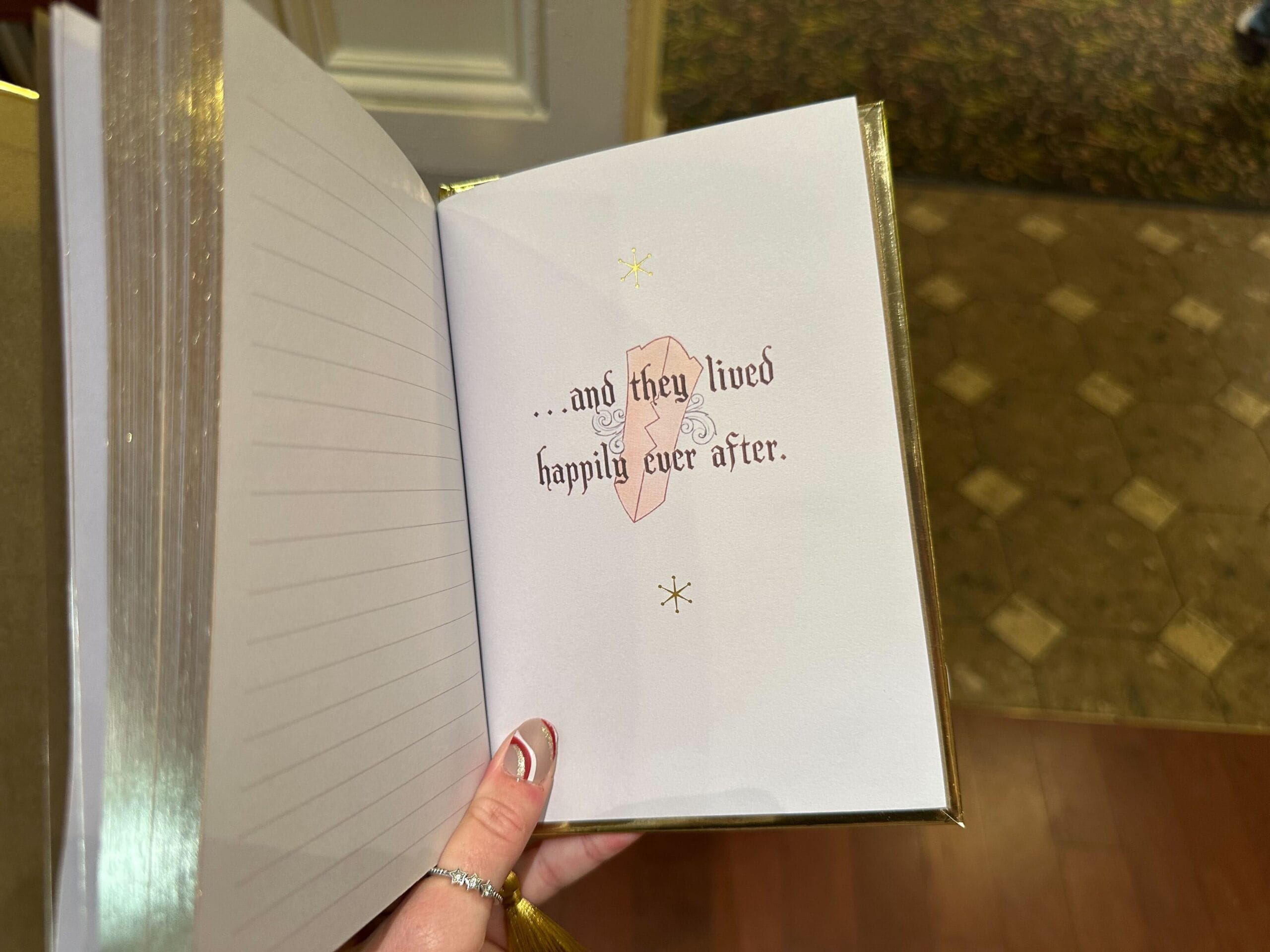 The pages on the right-hand side of the book display the iconic red rose in the upper right corner. The bookmark also has a miniature stained glass emblem of the rose attached to a black ribbon. We found this journal at Once Upon a Time in Disney’s Hollywood Studios.