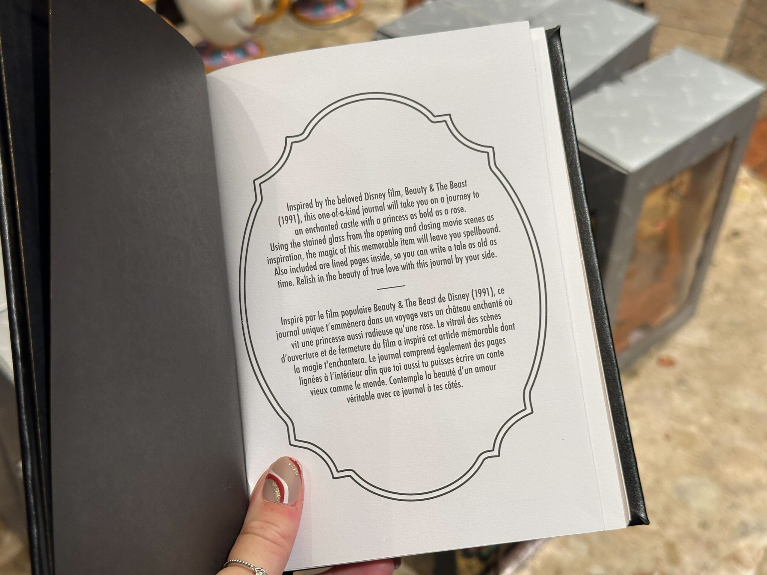 The first page of the journal depicts the “Beauty and the Beast” logo written in gold. Following that is a page of text giving a brief overview of the film and describing the use of stained glass in the opening and closing scenes. It is written in both English and French.