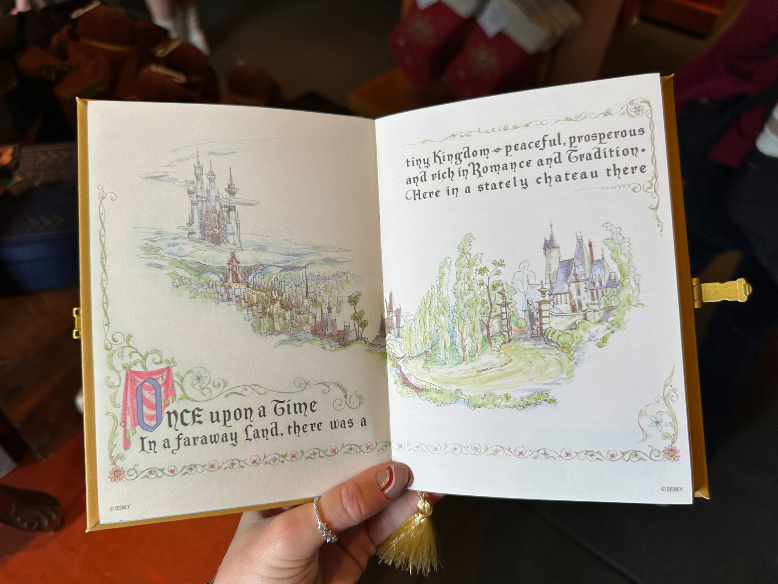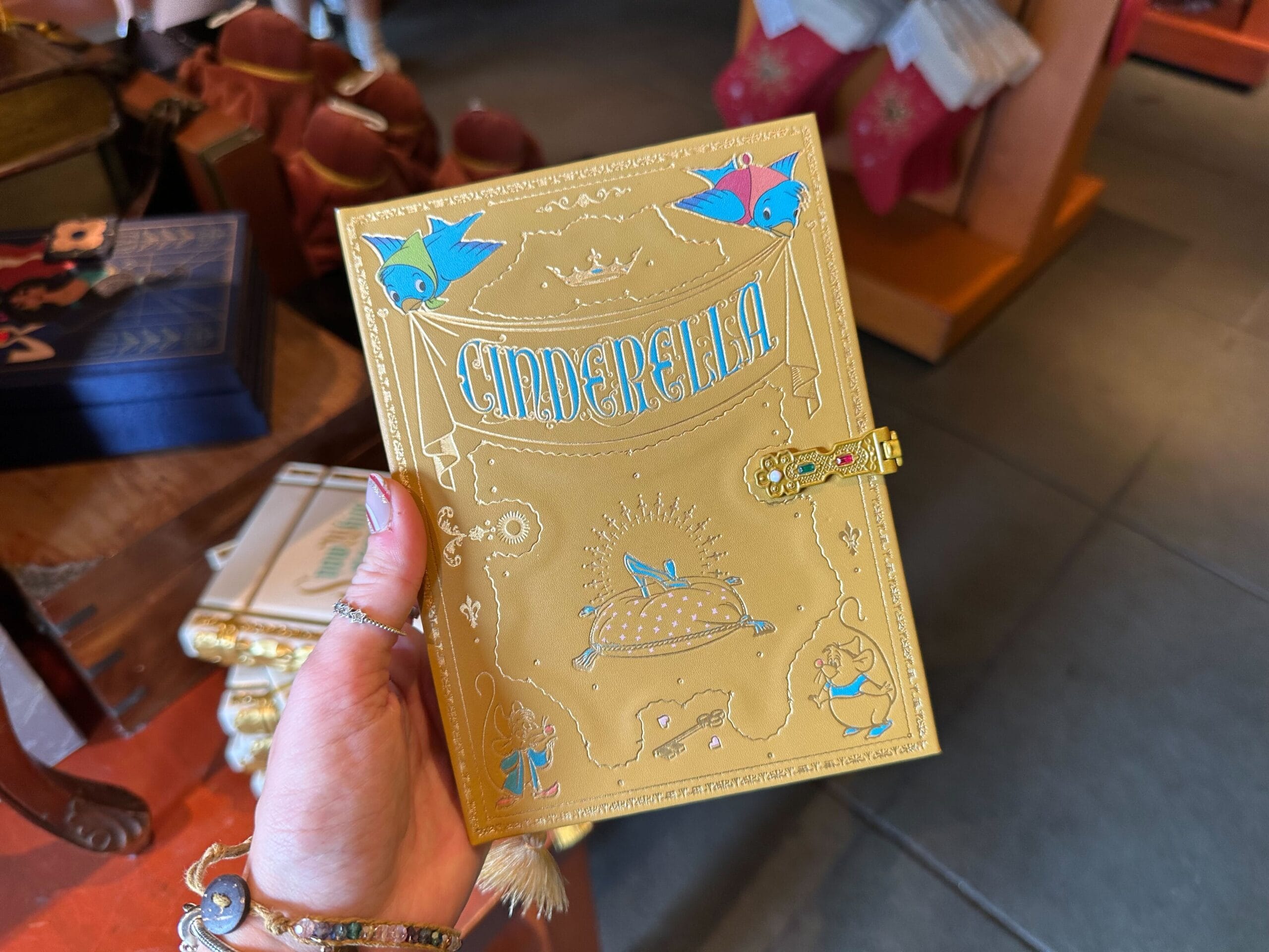 A person holds a decorative Cinderella-themed book with a gold cover featuring birds and embellishments, reminiscent of the Classic Mini Storybook Journals.