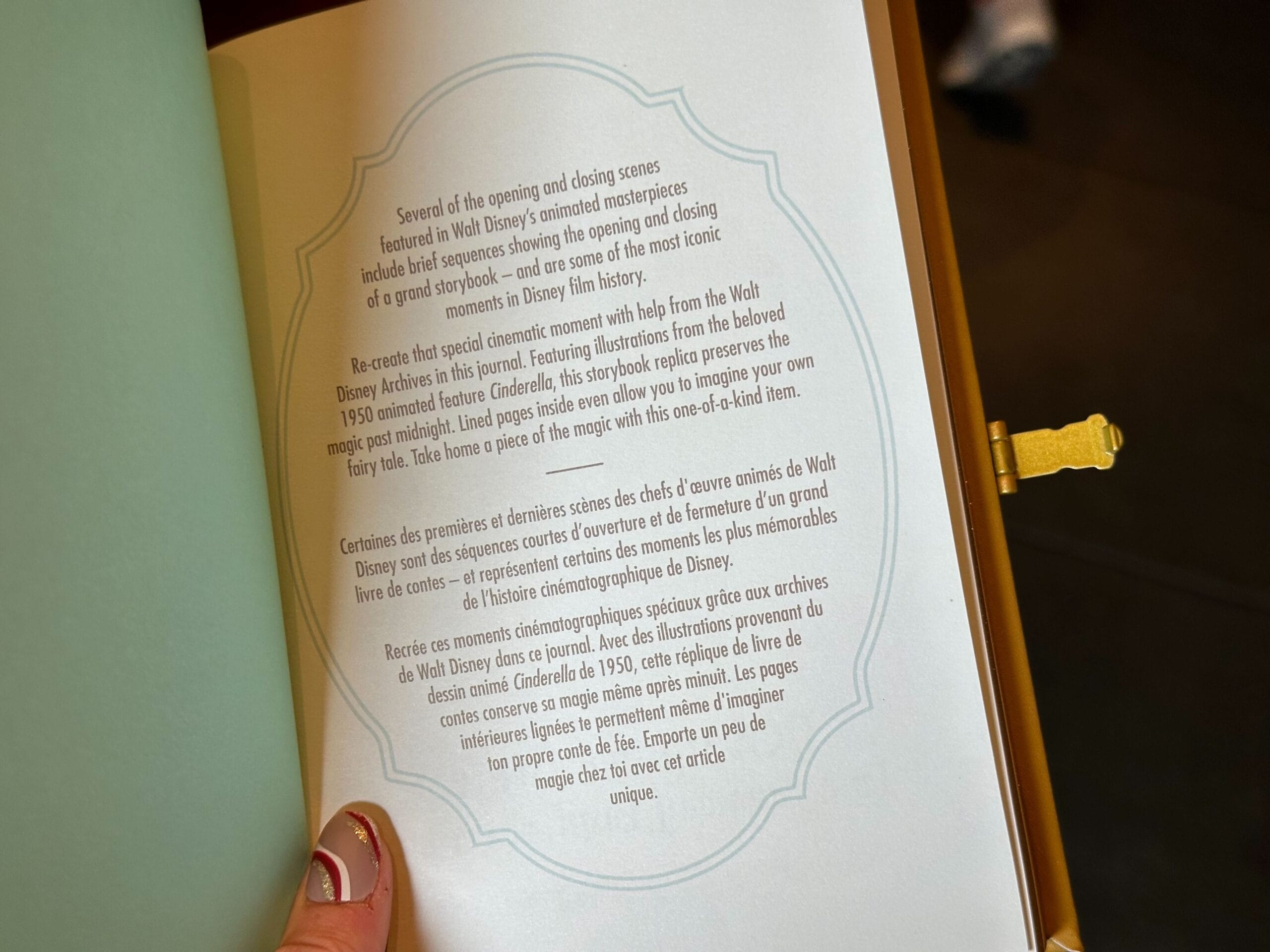 The first page of the journal also features text describing the practice of classic Disney films beginning with storybook openings. The second page has a double-page illustration of Cinderella’s house and castle along with the film’s opening text.