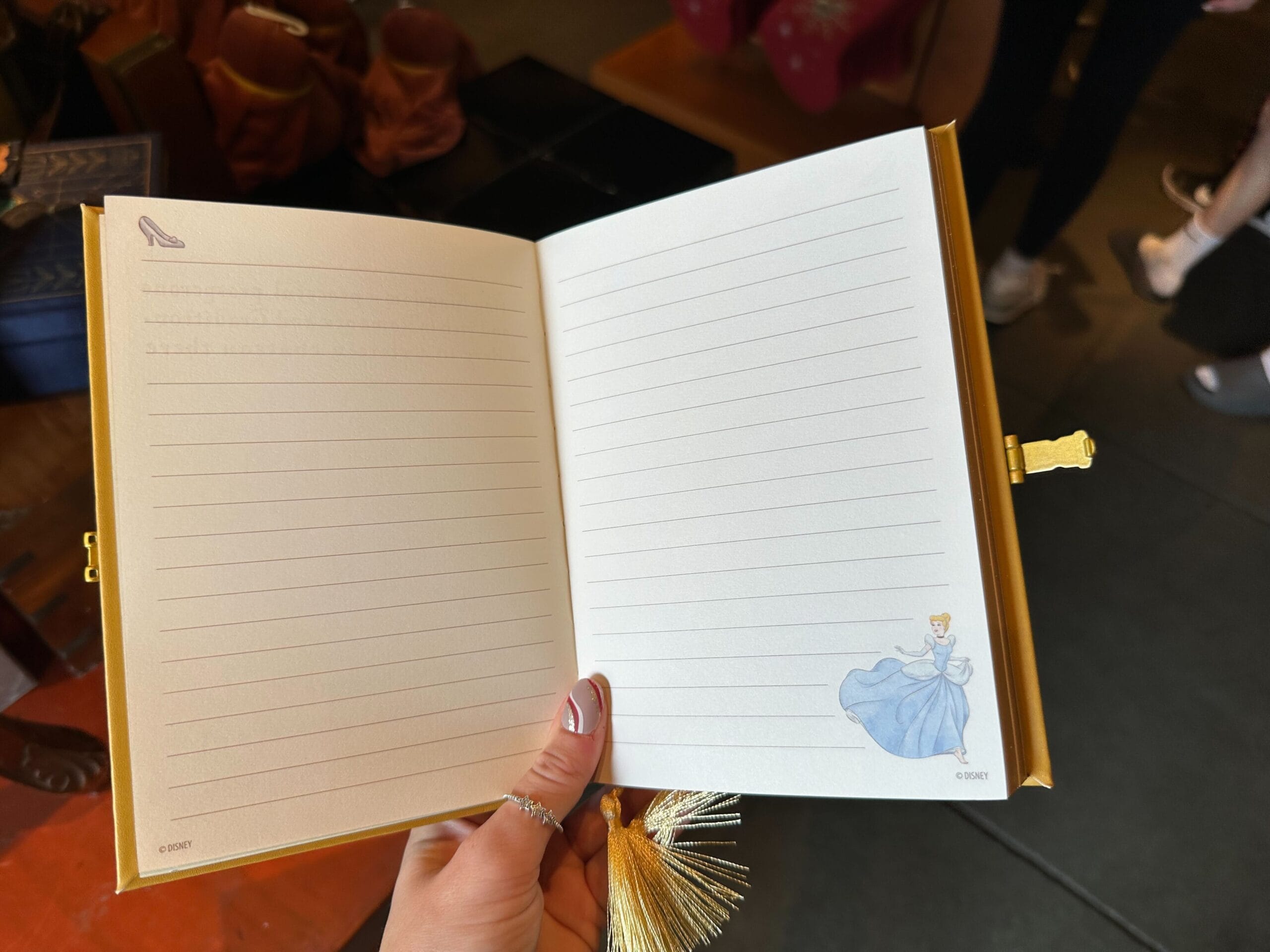 As with the Snow White journal, each interior page has lines for writing and a small image of Cinderella on the bottom right corner of each right-hand page. The final page has an illustration of Cinderella and Prince Charming from their wedding, as seen in the film’s final scene. We found the Cinderella mini storybook journal at Bonjour! Village Gifts in Magic Kingdom.