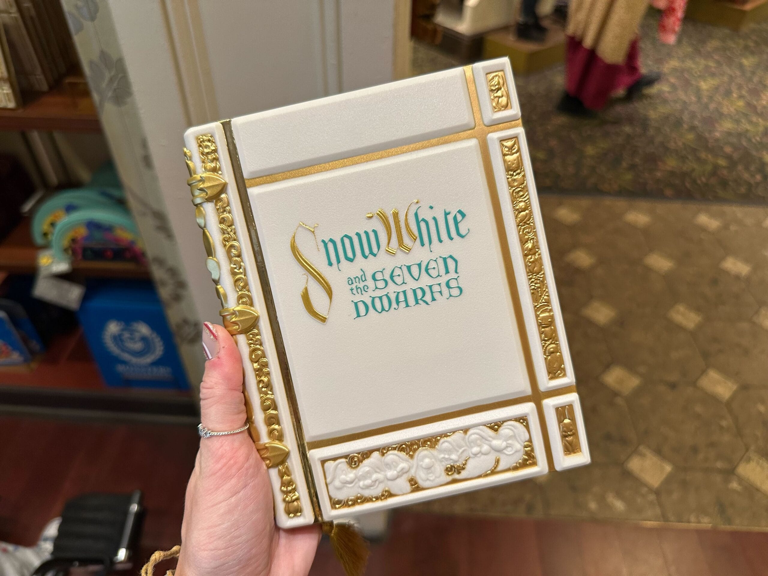 A hand holds a decorative Classic Mini Storybook Journal with the title "Snow White and the Seven Dwarfs" embossed in gold and blue on the cover, reminiscent of enchanting tales from Magic Kingdom Park.