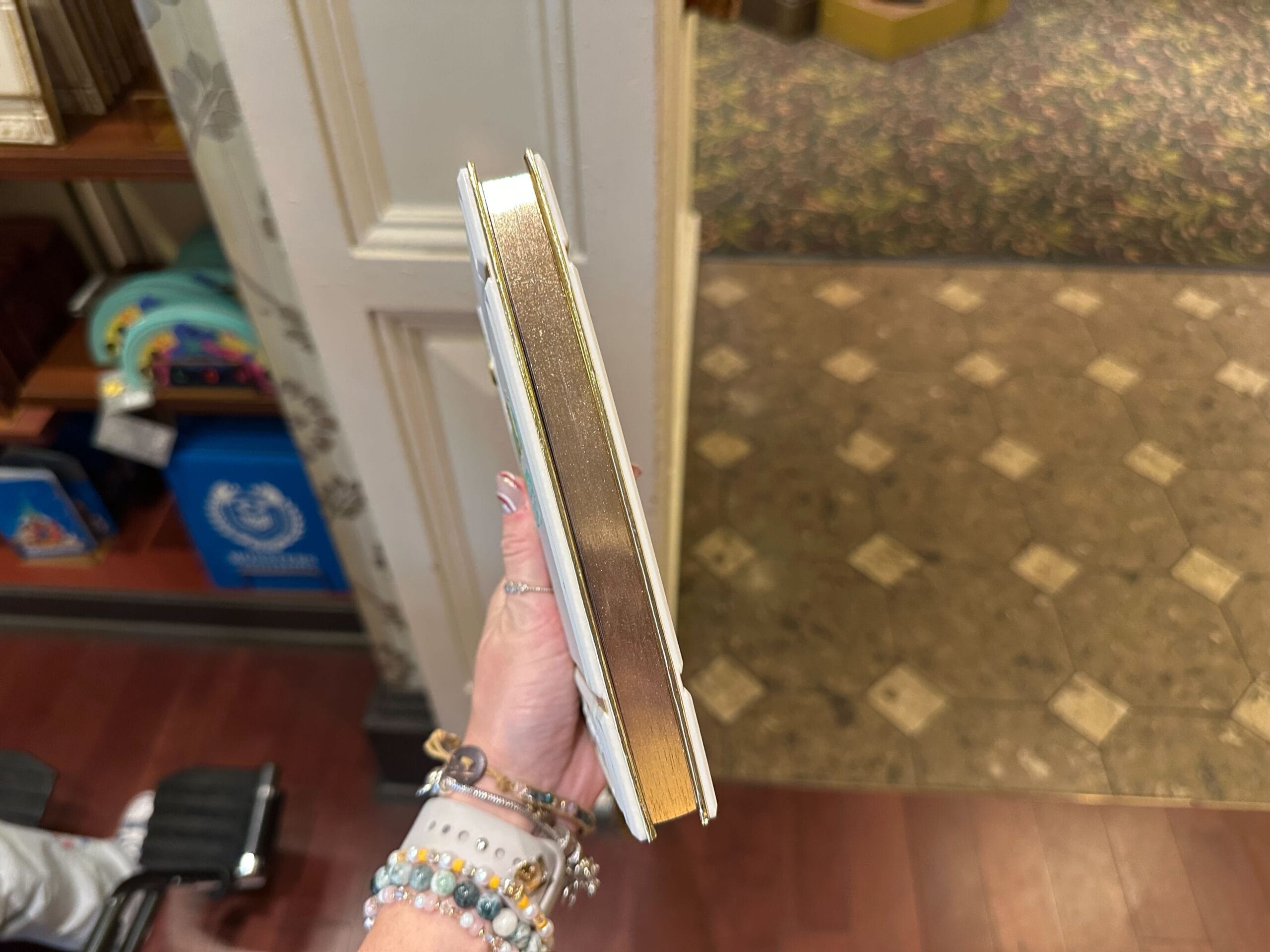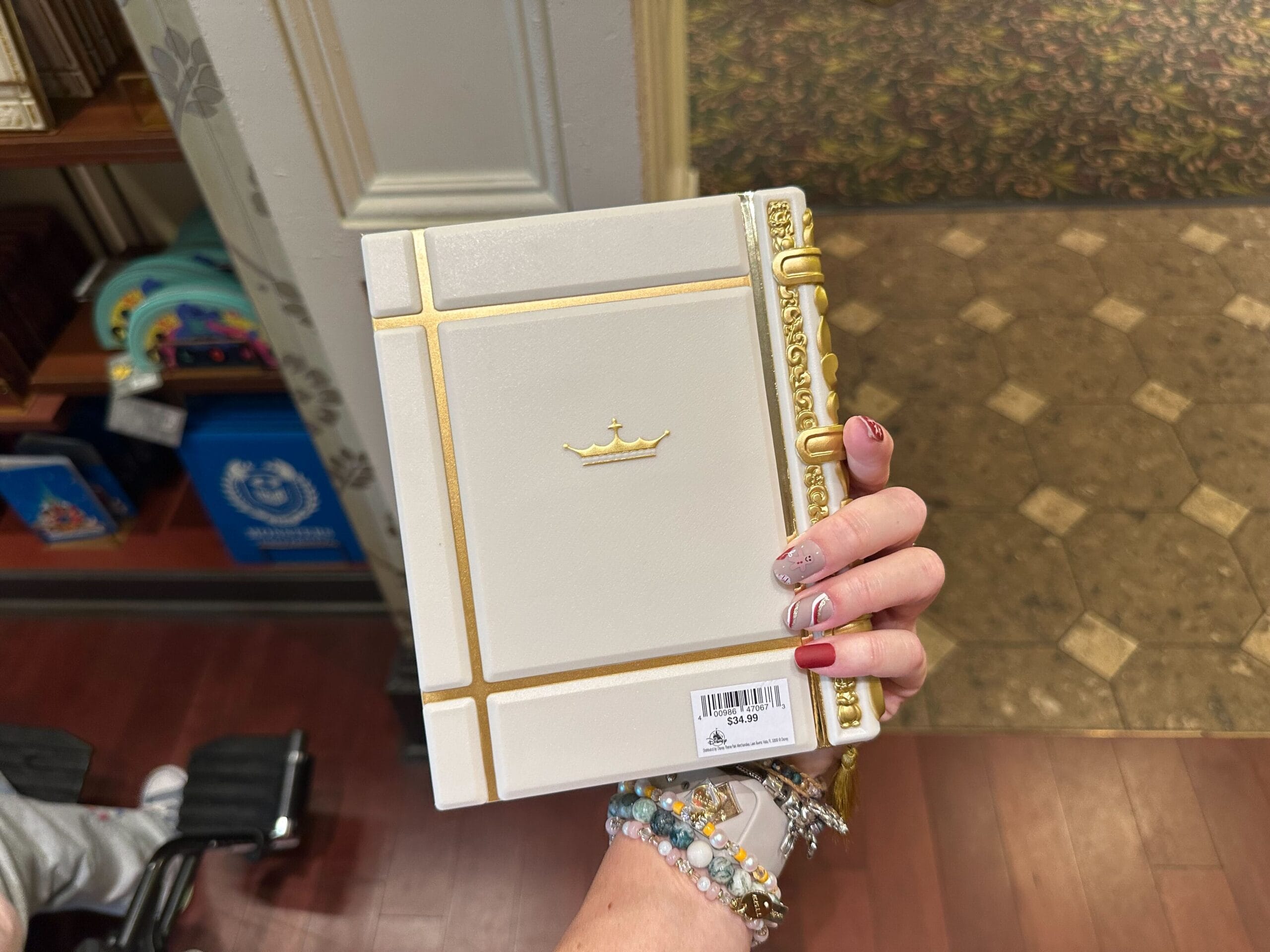 Person holding a decorative white book with a gold crown emblem and gold details, reminiscent of the Classic Mini Storybook Journals, price tag visible.