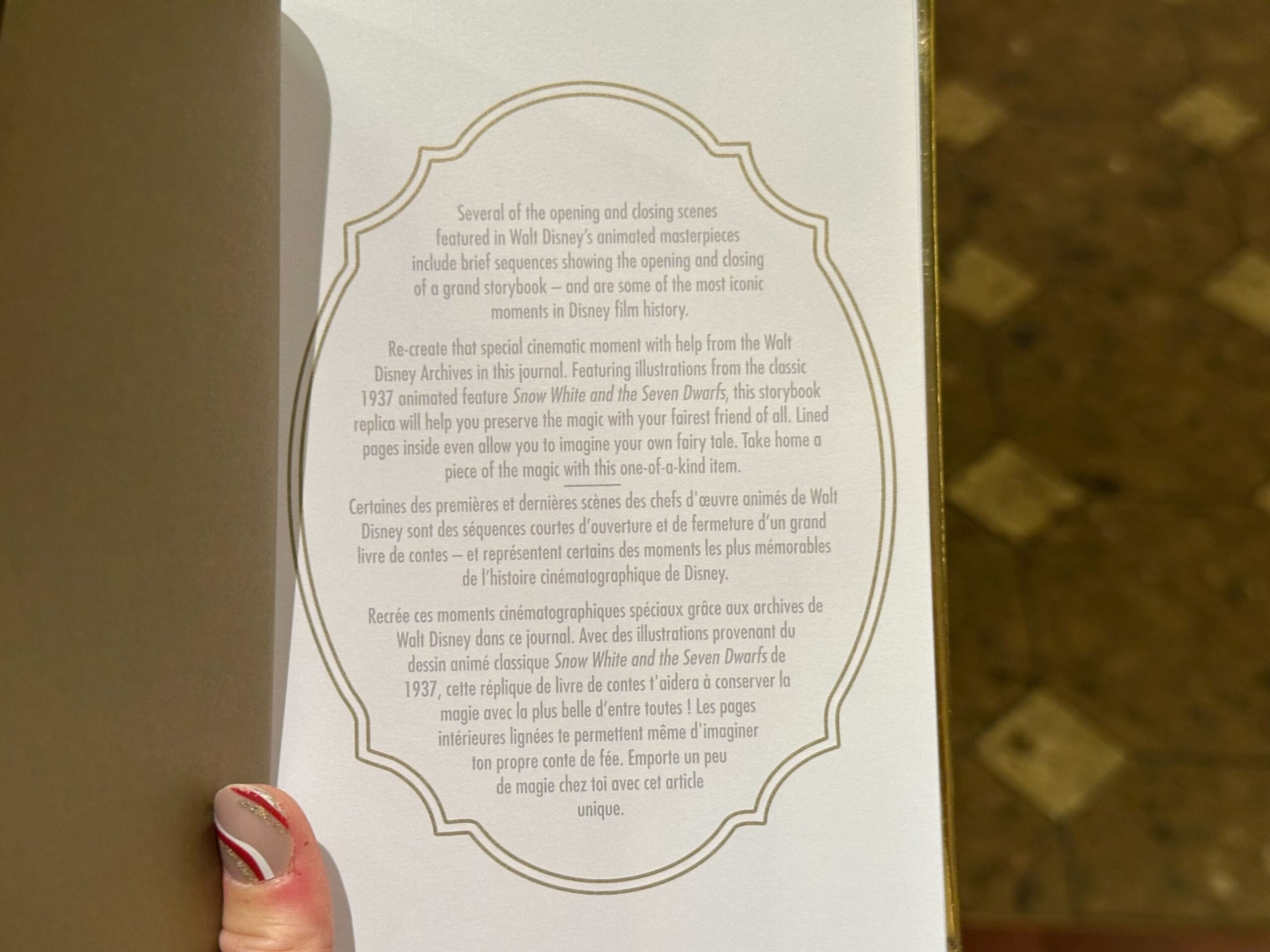 On the first page of the journal, the text explains how several classic Disney films used storybooks in their opening scenes. The text is explained in English and then copied in French. The second page of the book features gothic-style text that exactly copies the opening page from the film.