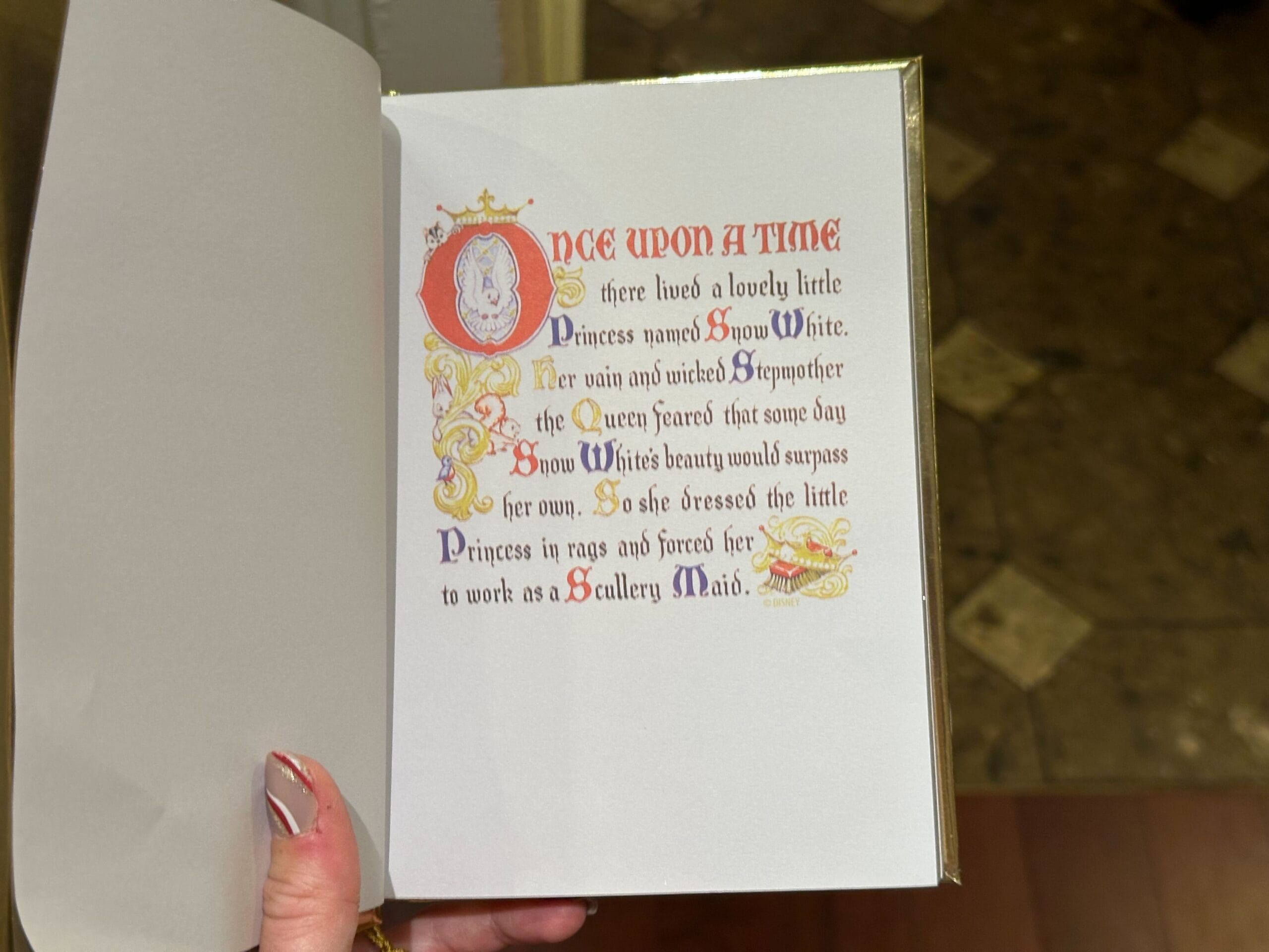 Two decorative book-shaped items, one titled "Snow White and the Seven Dwarfs" in white, and the other "Cinderella" in gold, held by a person. They feature ornate designs and embellishments.