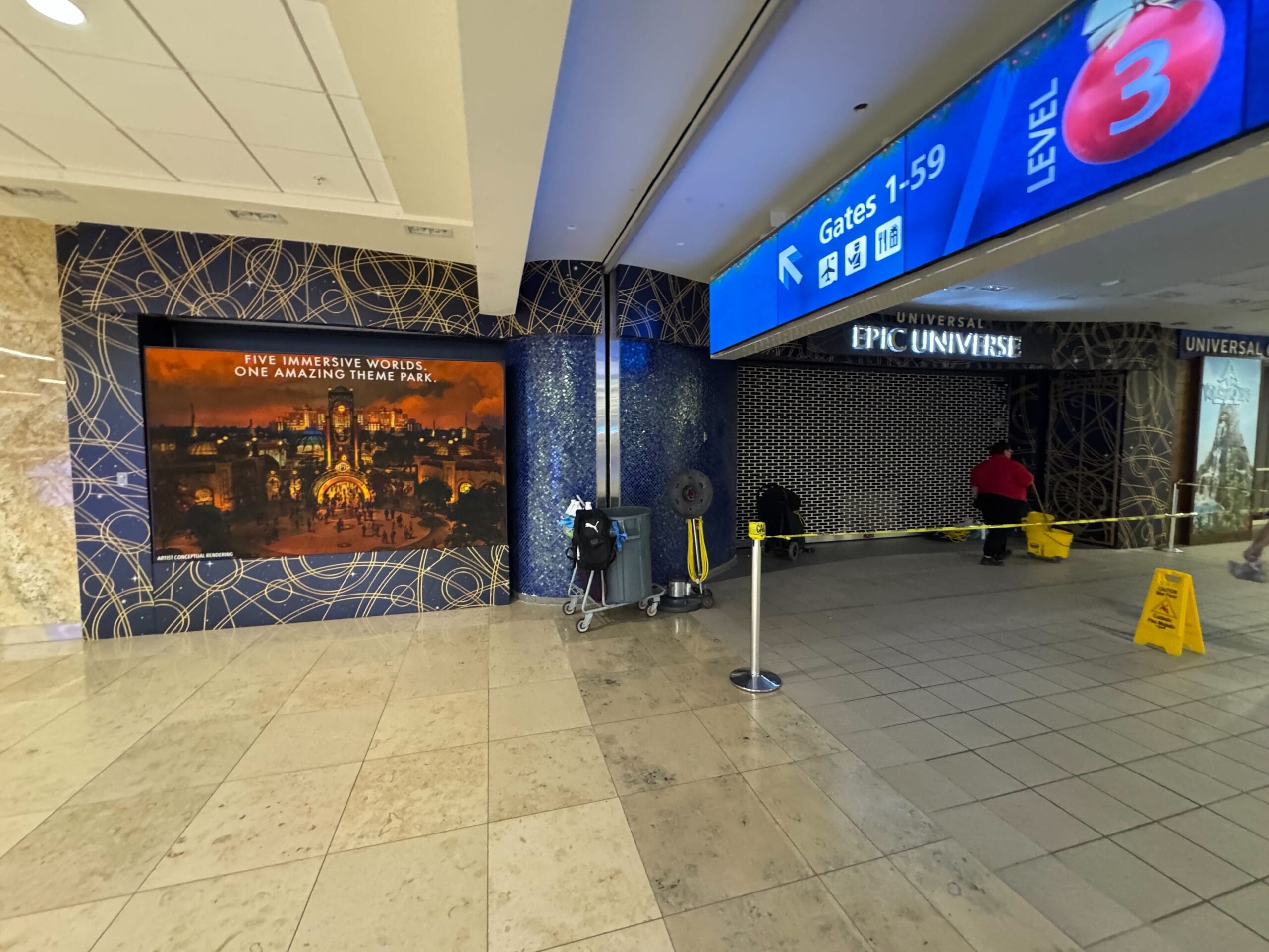 Airport corridor with cleaning equipment, a "Wet Floor" sign, and an advertisement for Universal Epic Universe theme park featuring a nighttime theme park scene.