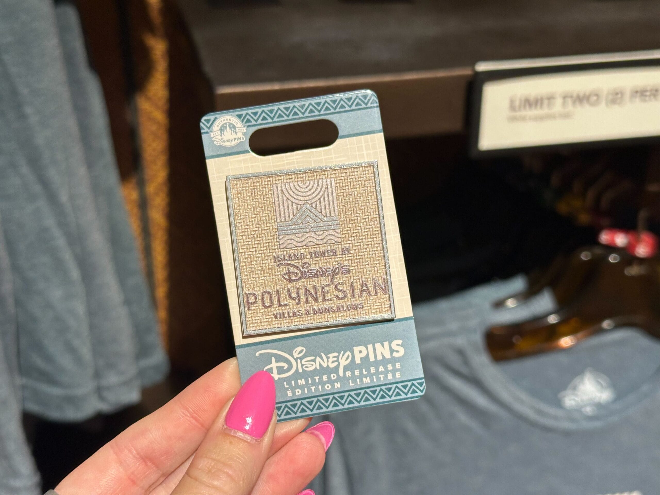 A Disney Trading Pin for the new tower is also available. The pin itself is square-shaped, with a woven pattern behind the tower’s wordmark and icon. The backing card is also themed.