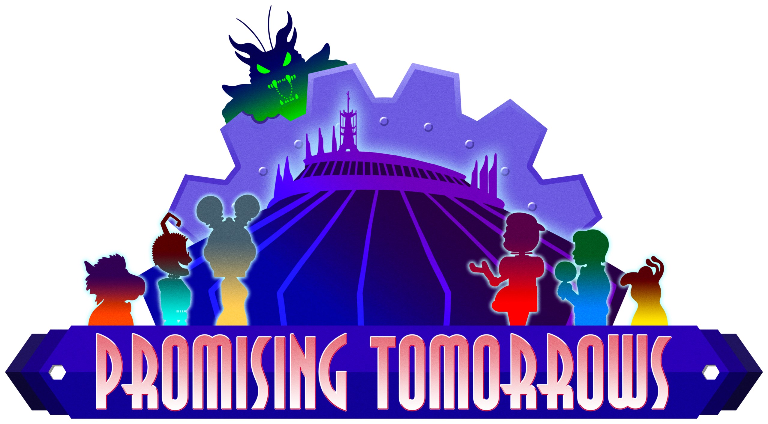 Night view of a futuristic building with spires, labeled "Promising Tomorrows," evoking the magic of Disney Imagineers, featuring colorful silhouettes of people and a roller coaster graphic in the sky.