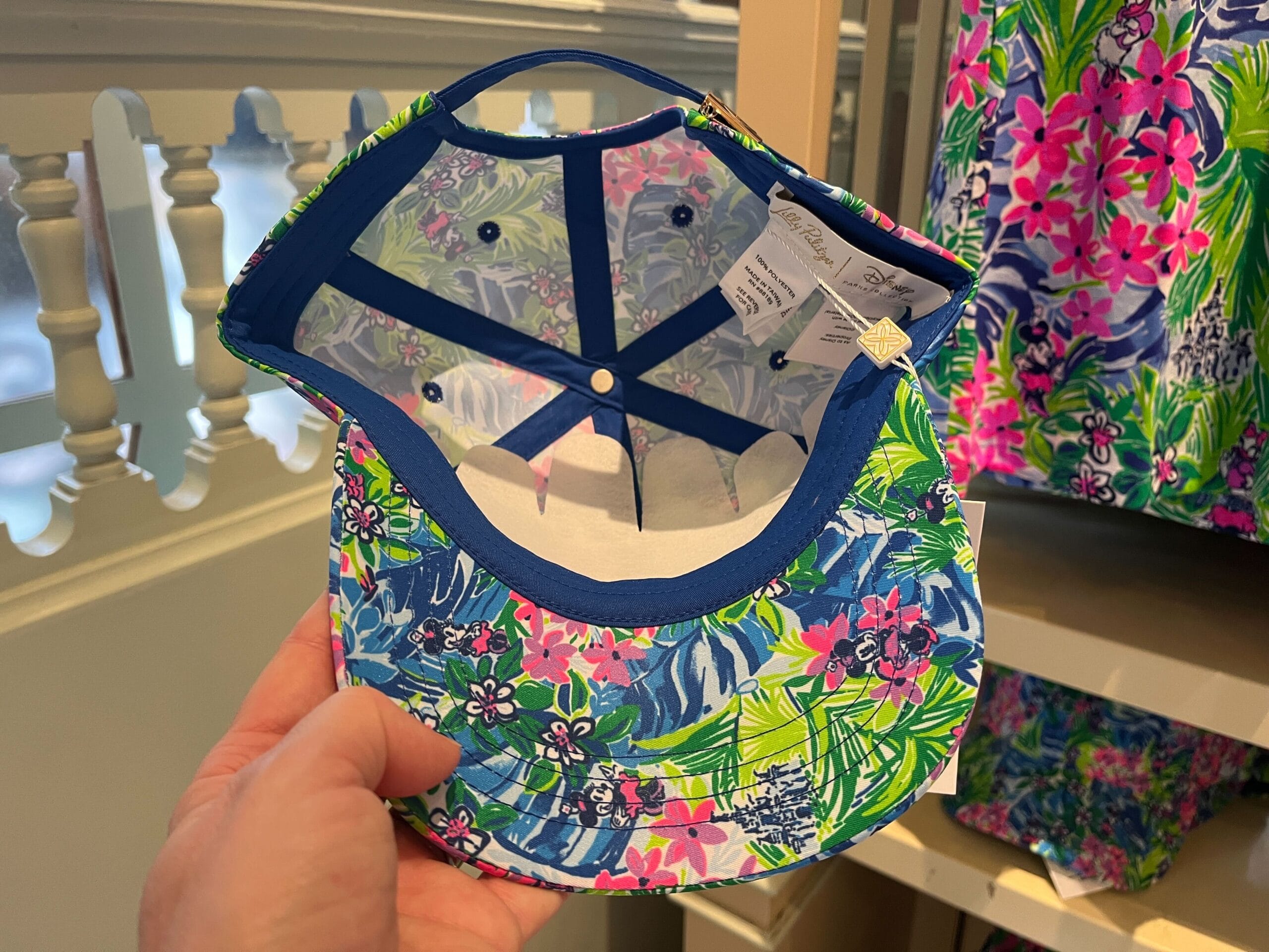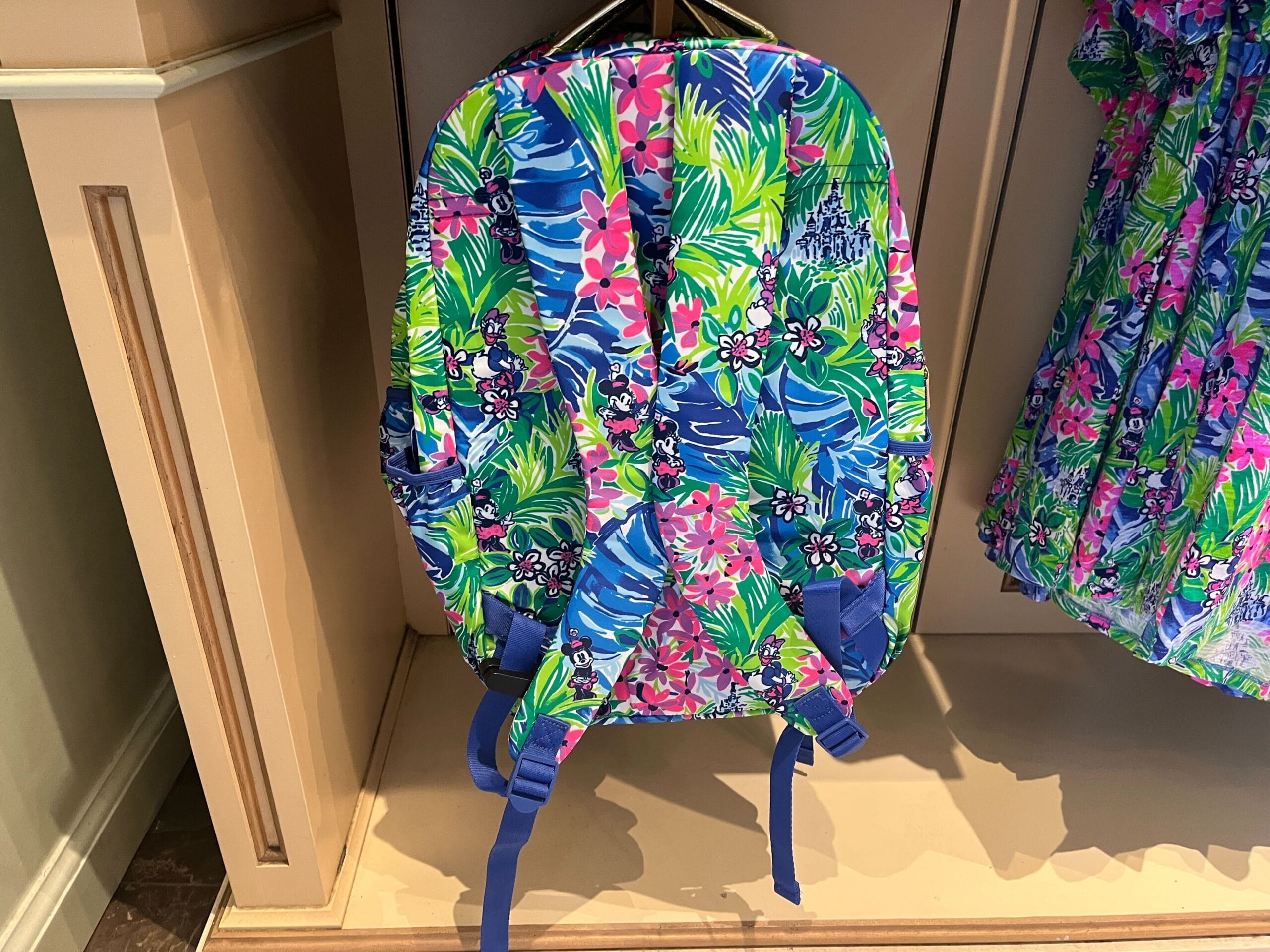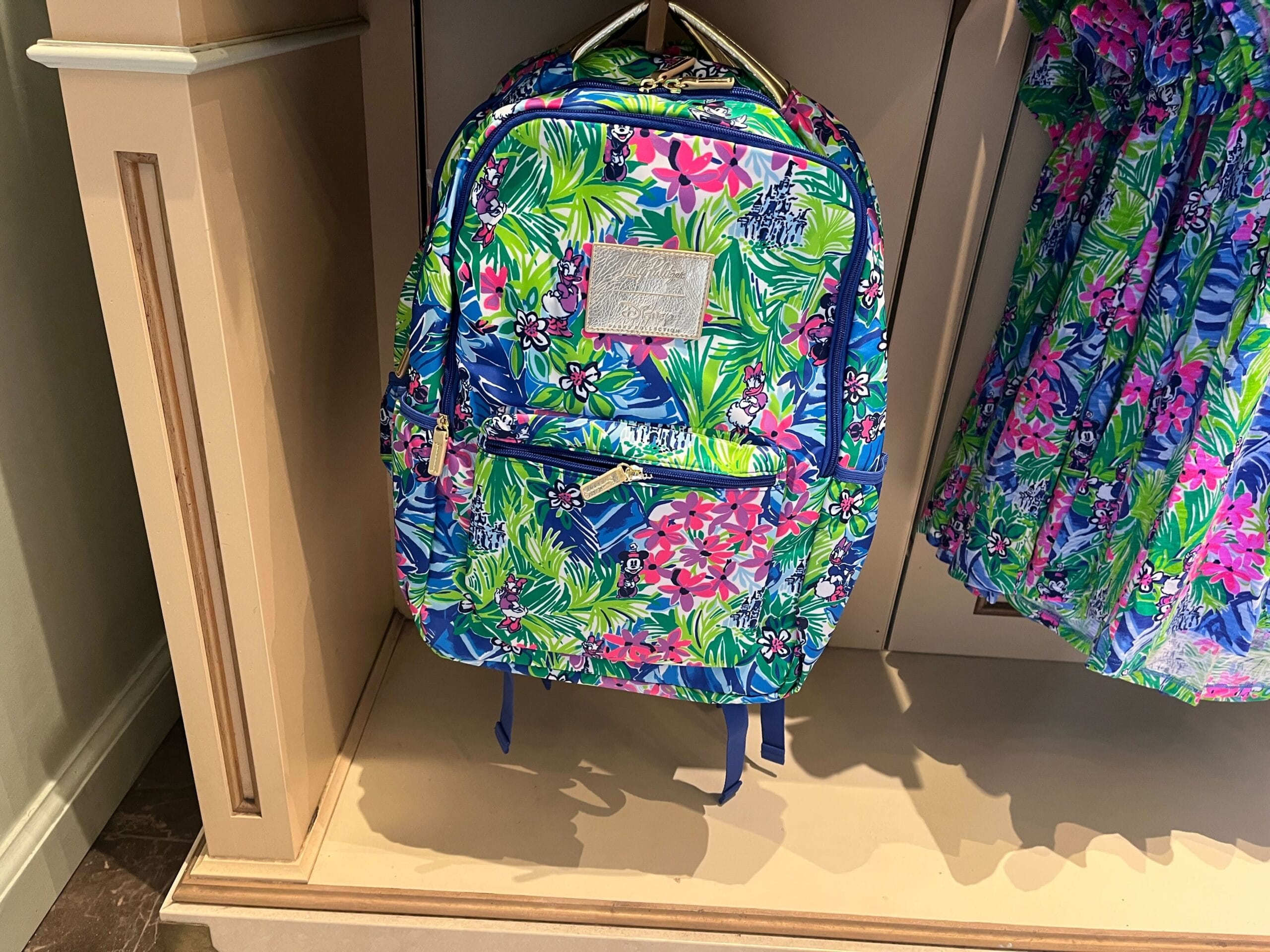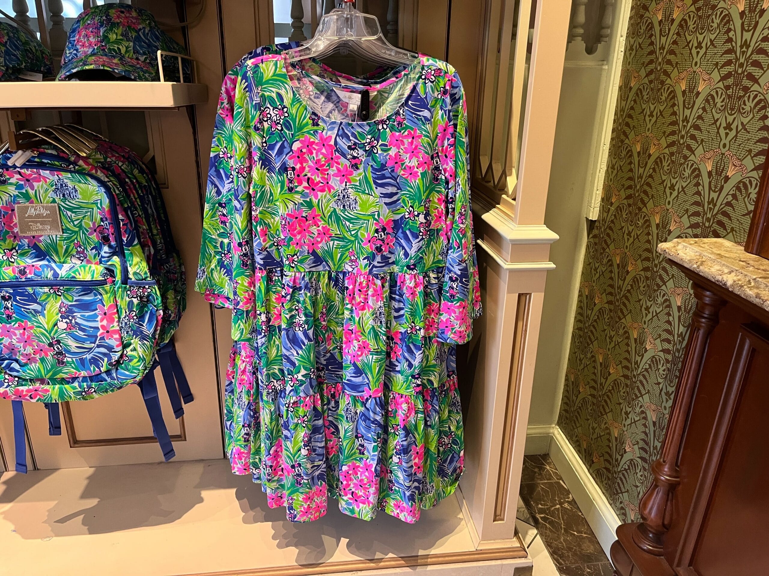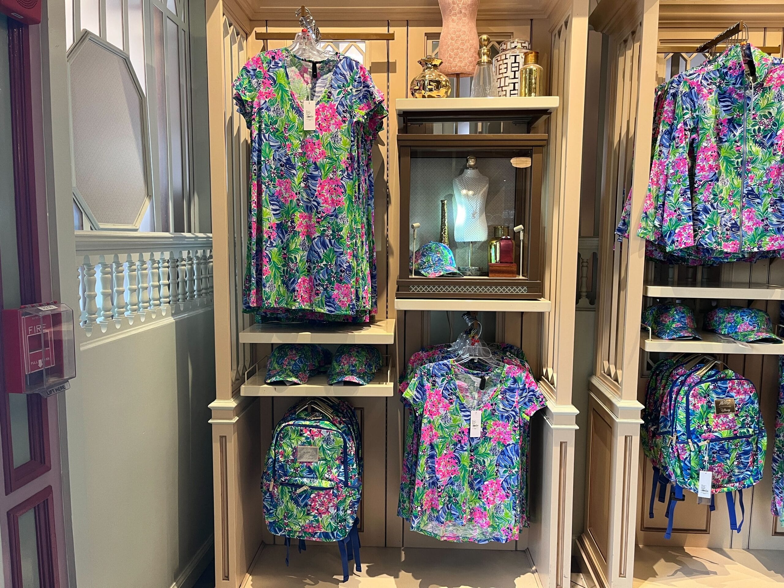 Lilly Pulitzer's floral-patterned dress, cap, and backpack beautifully displayed on shelves and hangers create a vibrant atmosphere in the store setting.