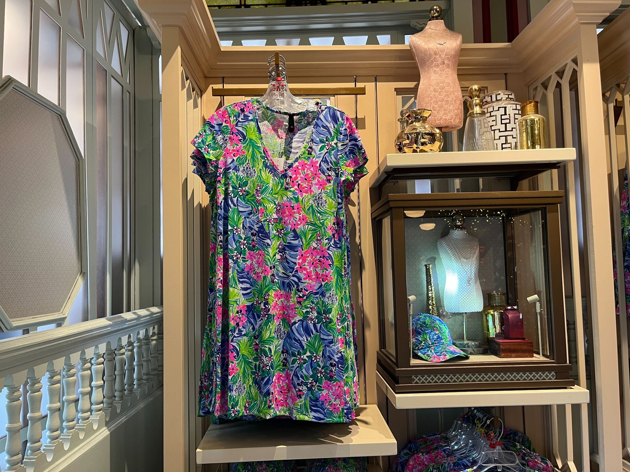 A colorful floral dress on a mannequin in a clothing store, with a display case containing a hat and bottles.