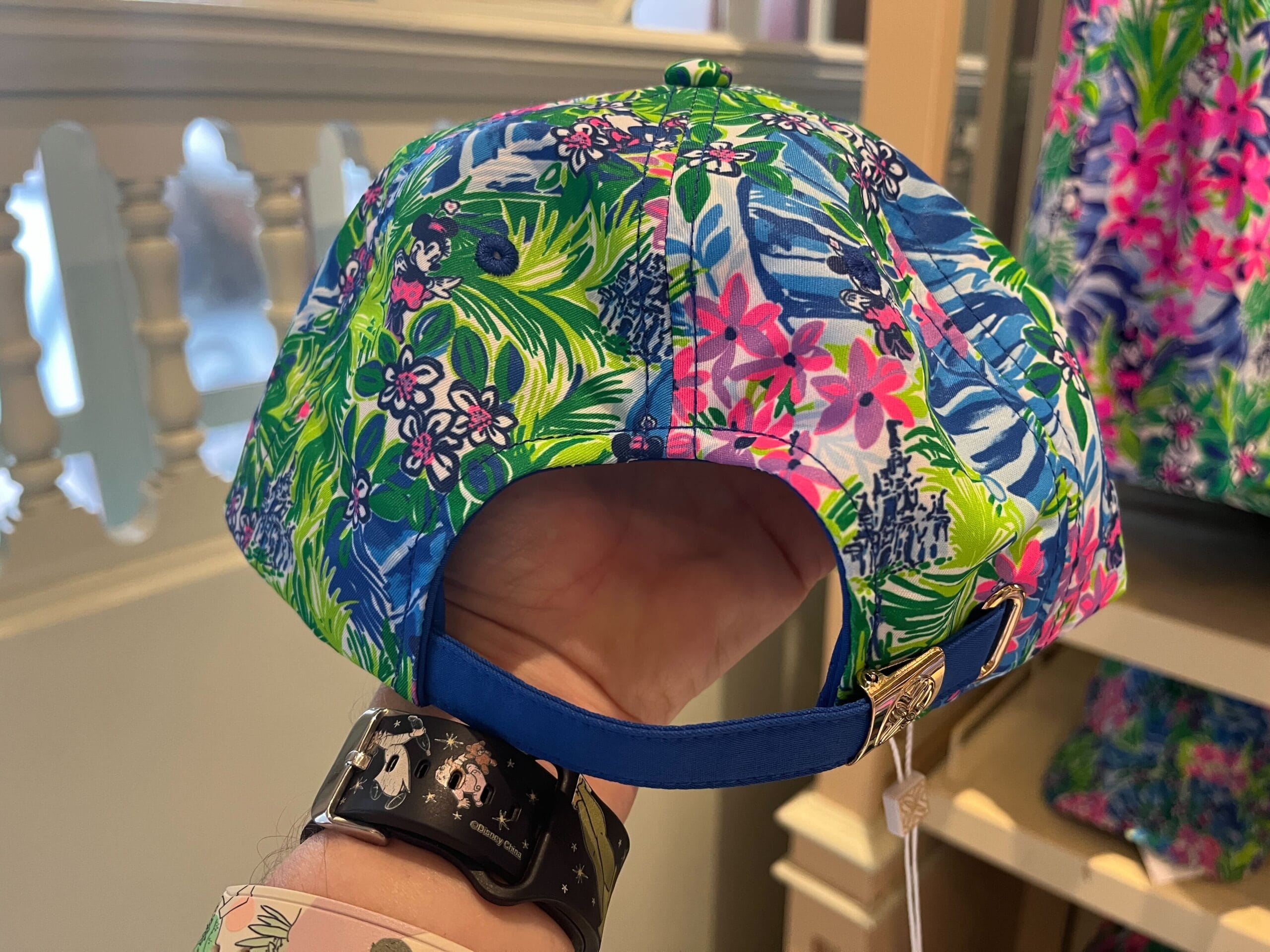 Hand holding a colorful floral-patterned baseball cap with a blue adjustable strap, showcased indoors with shopping displays in the background.