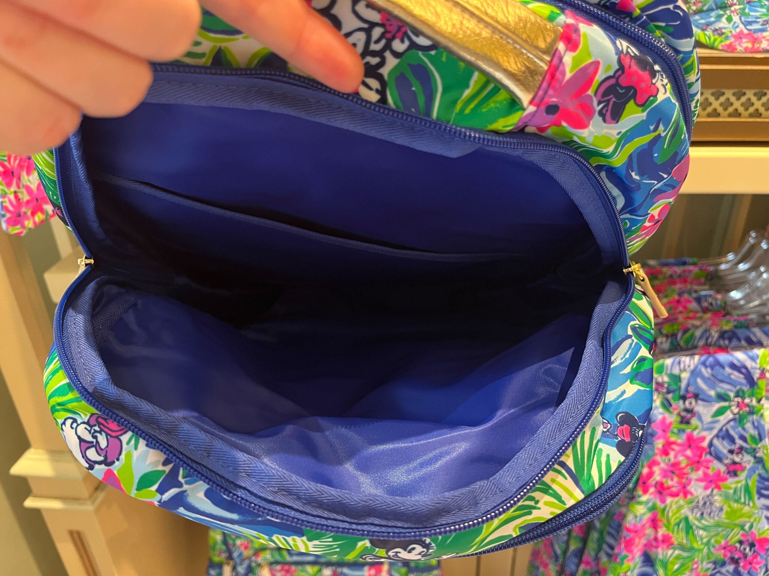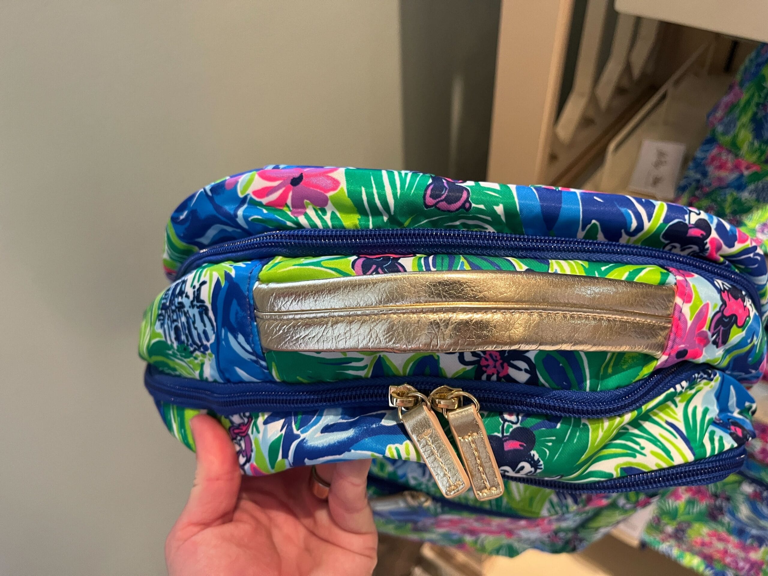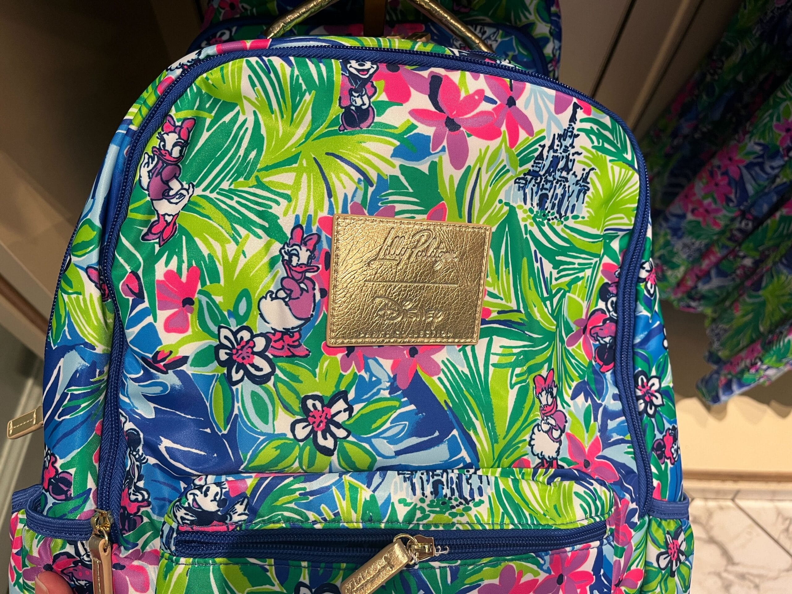 A metallic gold Disney x Lilly Pulitzer pleather patch is on the front, above the small zip pocket. The Lilly Pulitzer logo is also on the metallic pleather zip pulls.