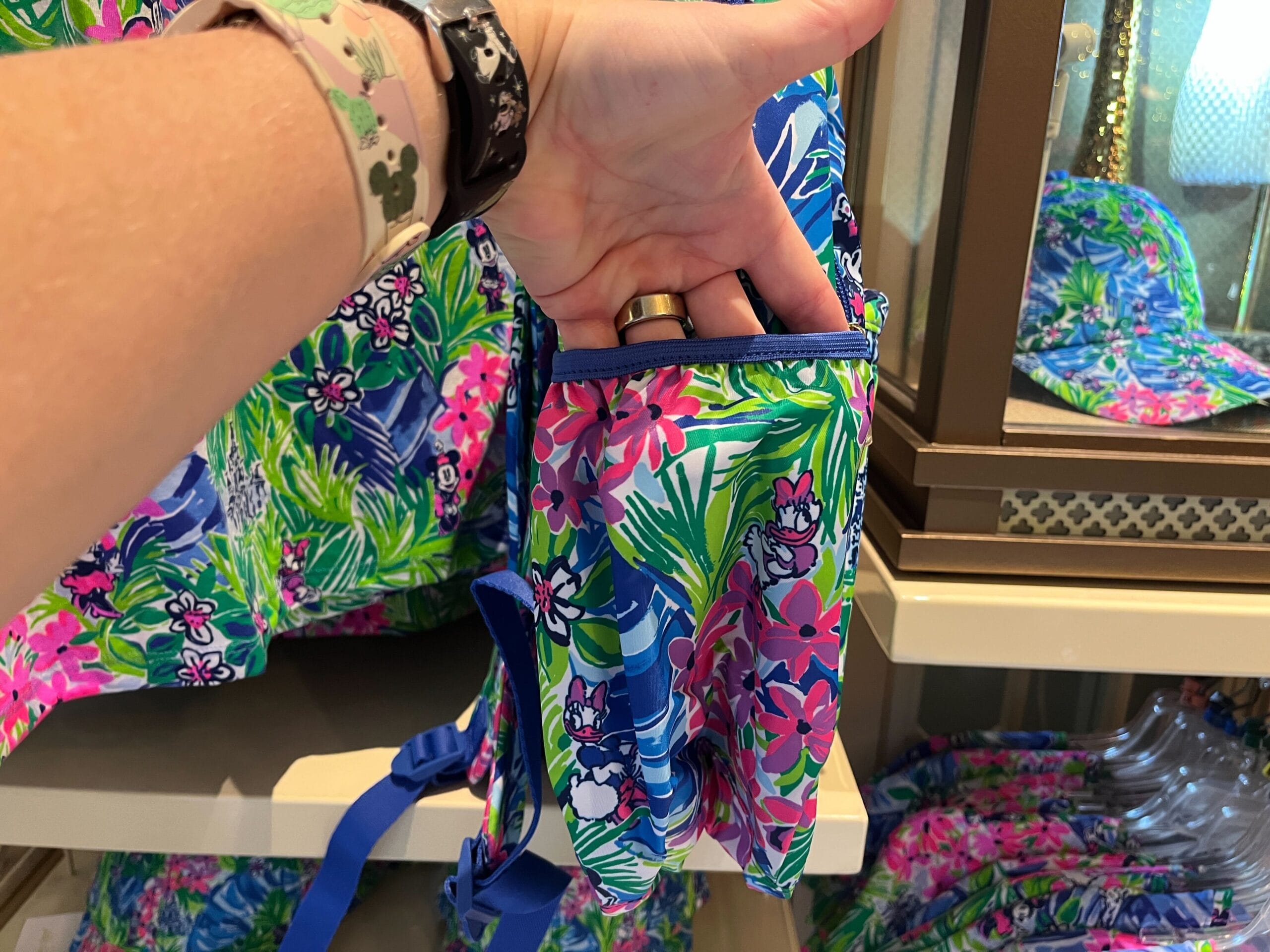 Colorful fabric with tropical leaves, pink flowers, and cartoon characters. A hand is holding a part of the fabric, revealing a pocket.