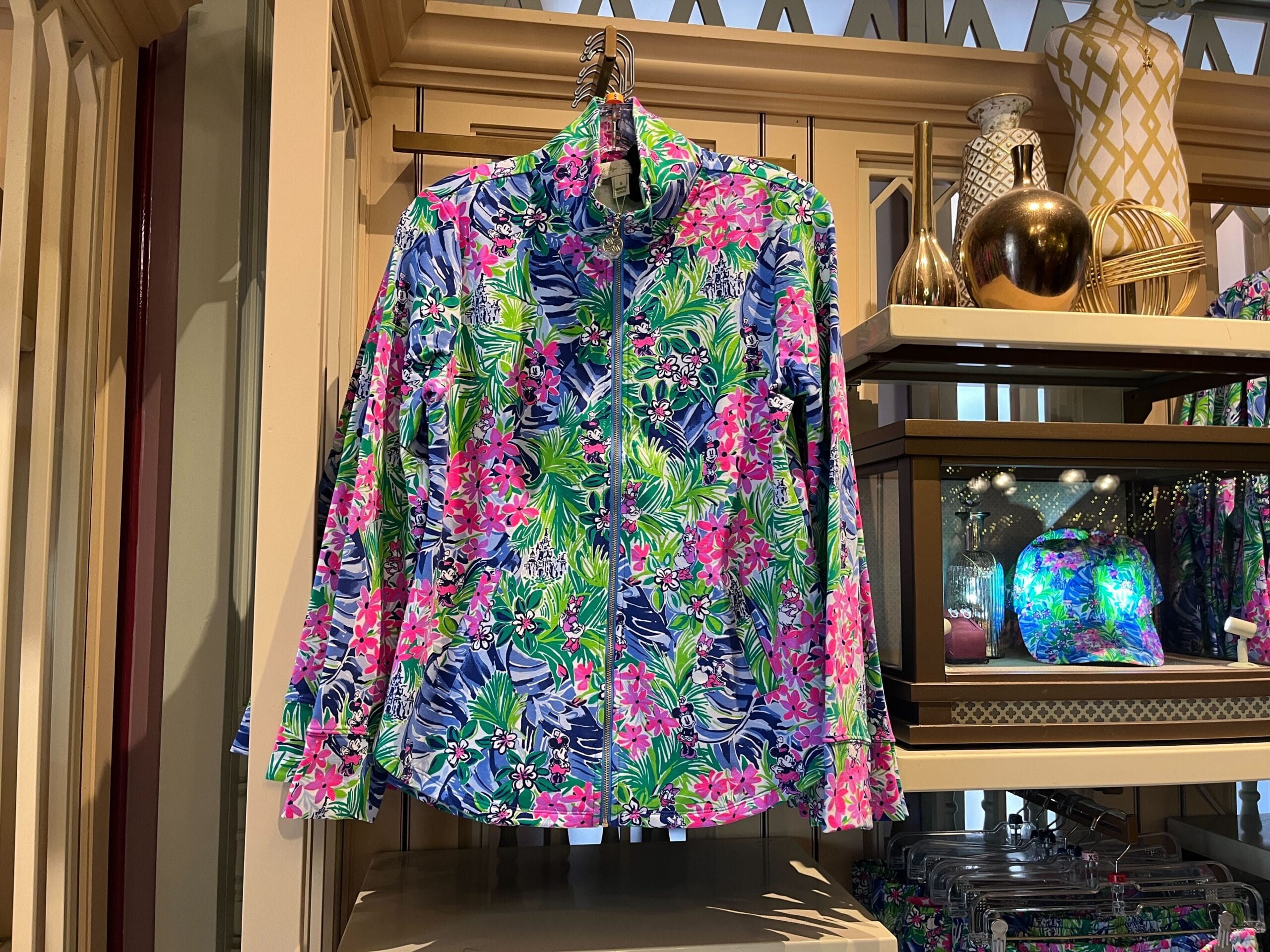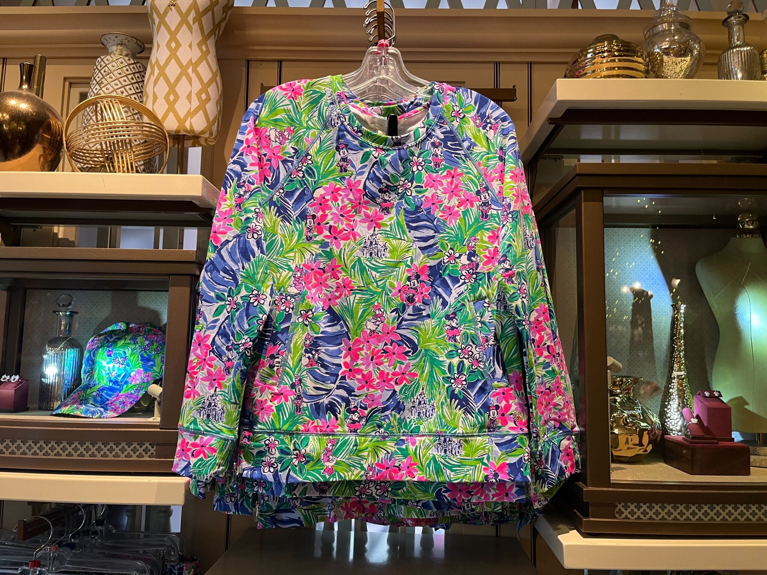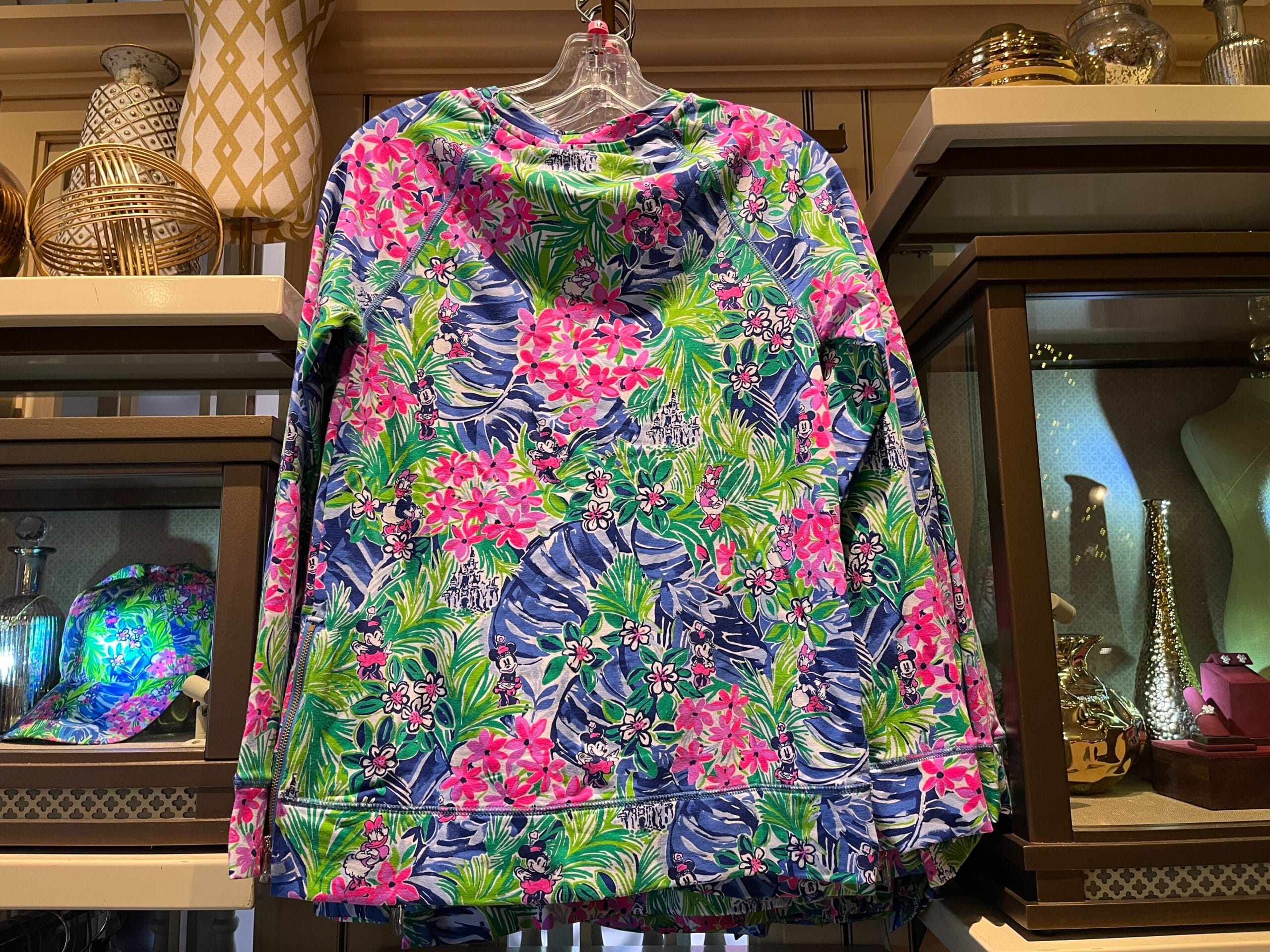 A colorful, floral-patterned hoodie on display in a store, surrounded by decorative items on shelves.