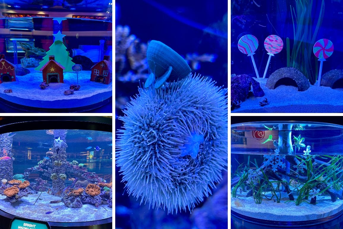 The fish of The Seas in EPCOT have decked the halls of their tanks. The Cuttlefish have small gingerbread houses over their coconut homes and a nice green tree at the back. The Cuttlefish hatchlings have added some decorative lollipops to their home.