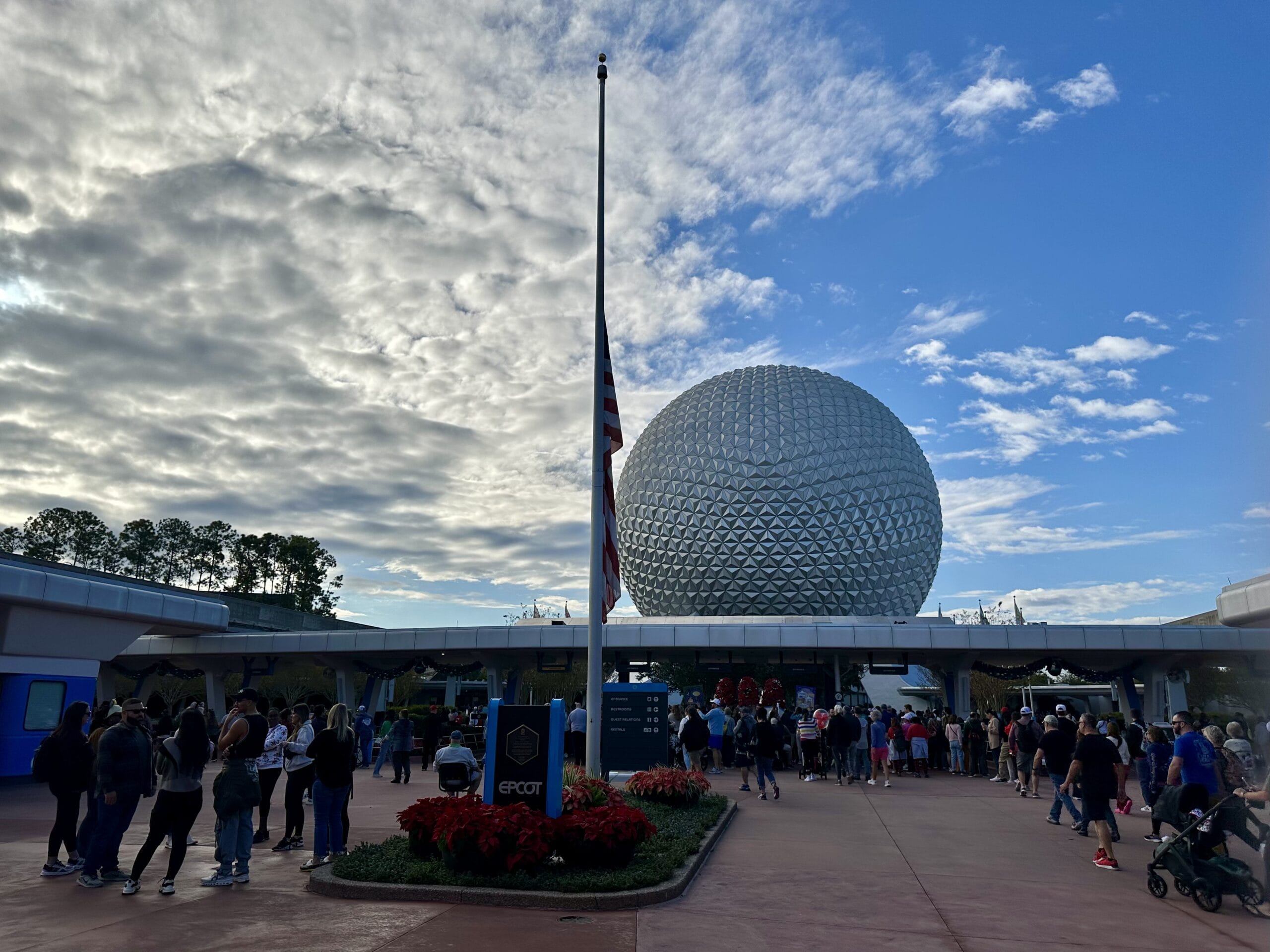 The park was busy, at almost exactly at 9 a.m. crowded lines were already forming at the touch points to enter the park. The flags around Disney World were at half-staff today as well.