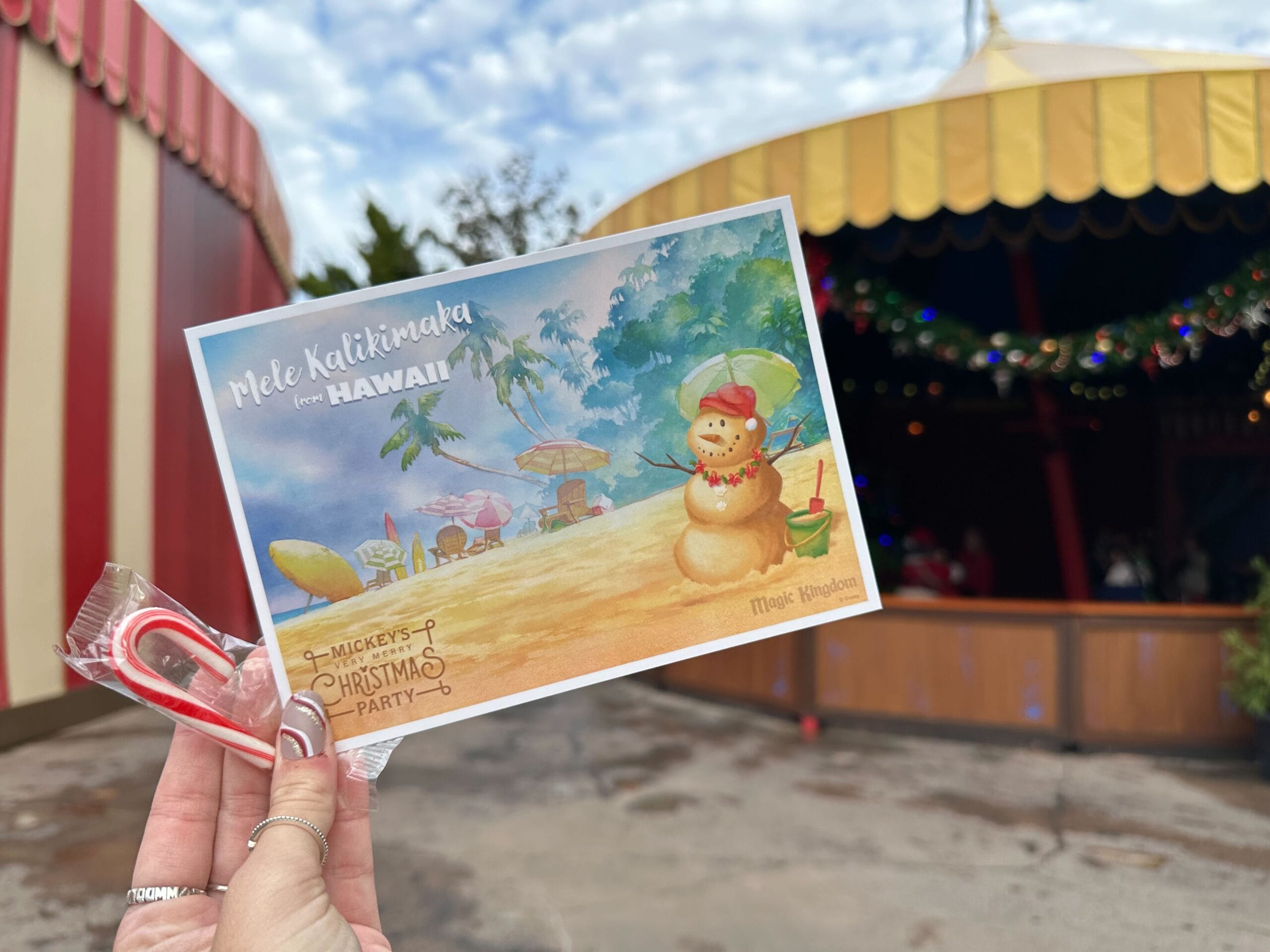 Guests get an autograph postcard wishing them a “Mele Kalikimaka” from Hawai’i. It features the Mickey’s Very Merry Christmas Party wordmark because these were first available during the parties. We also received a candy cane.