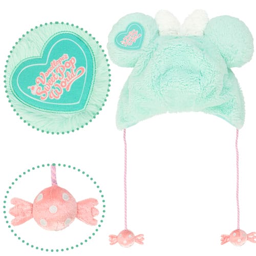 This Mnnie ear cap is a fluffy light green fabric. Two strings dangle from the cap with plush candy pieces at the end/ A white fluffy bow adorns the top and a heart-shaped patch can be seen on the ear that reads “Vanellope’s Sweet Pop World.”