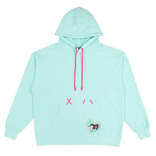 This light green hoodie features Vanellope on the front pocket of the hoodie inside a heart-shaped emblem. Pink strings accent the hoodie along with pink stitch marks above the front pocket.