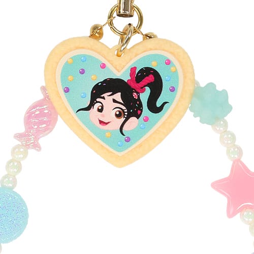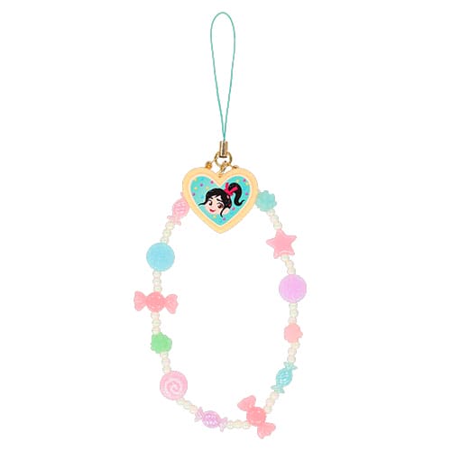 This strap features a heart-shaped charm of Vanellope. The strap depicts smaller candy-inspired charms in various colors. It can be attached to the Sweet Poppin’ Stick shown above.