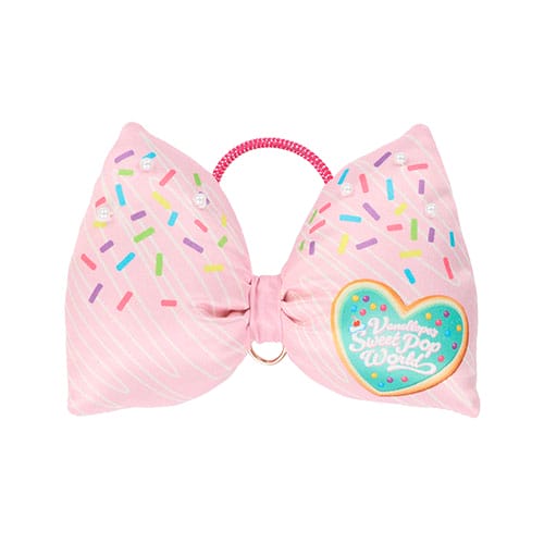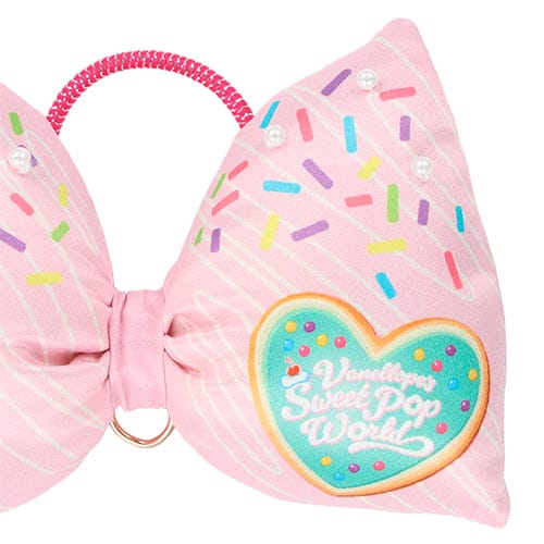 Each of the ribbon hair ties is decorated with a sweets-inspired motif and has a heart-shaped logo in the bottom corner that reads “Vanellope’s Sweet Pop World.”