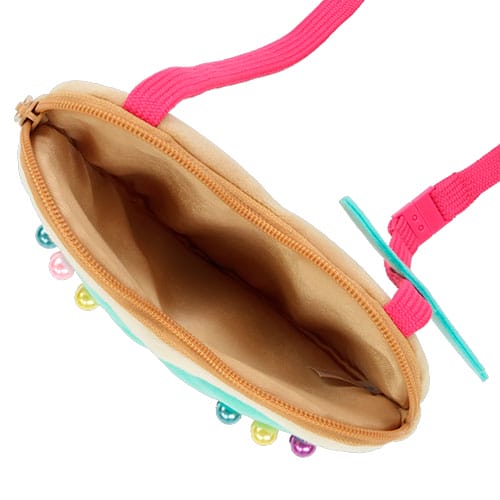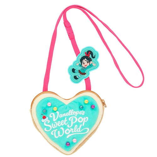 This neck pouch has a heart-shaped cookie motif. Vanellope can be seen on the pink strap of the bag and “Vanellope’s Sweet Pop World” is written on the front of the bag.