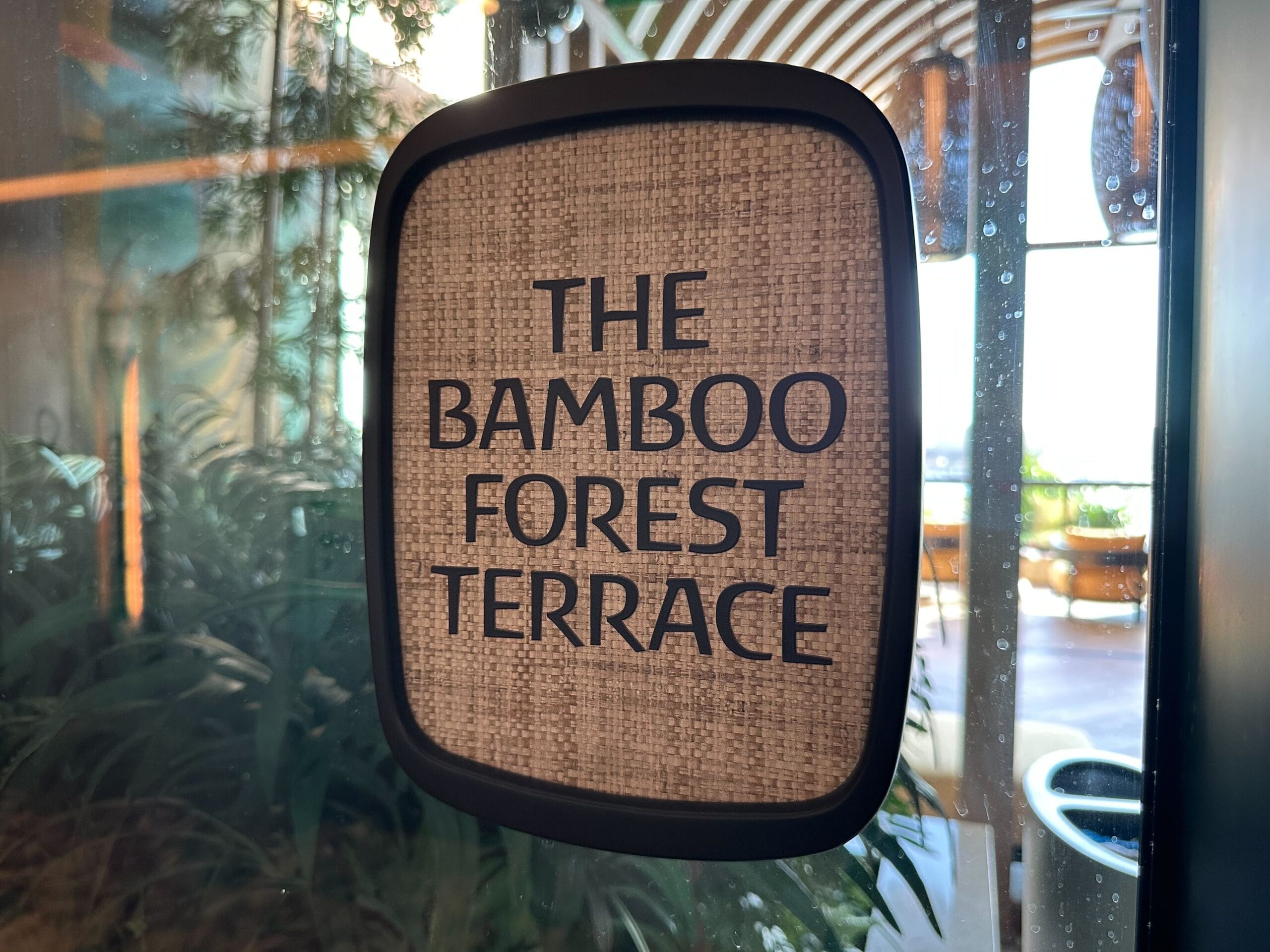A sign reading "The Bamboo Forest Terrace" adorns a glass door, inviting glimpses of surrounding greenery and outdoor seating. Beyond the lush scene, the silhouette of an island tower rises in the distance, enhancing the tranquil ambiance.