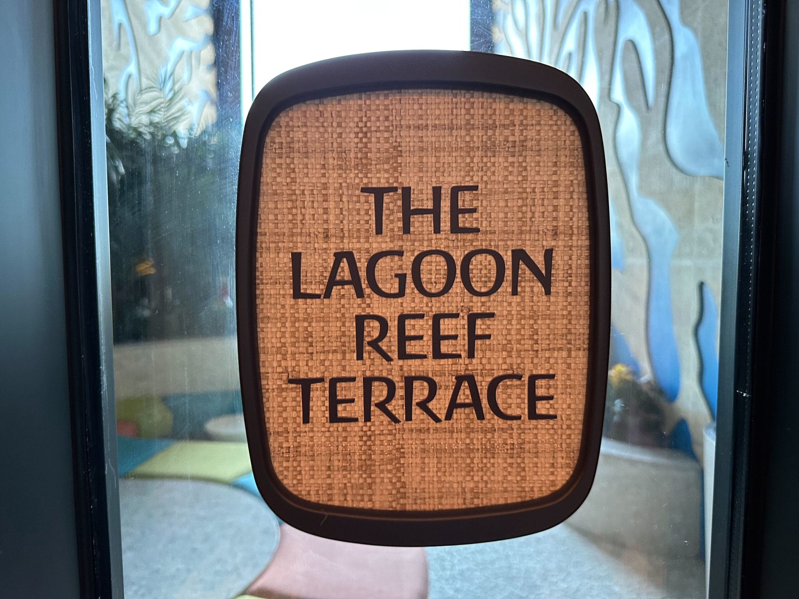 Glass door with a sign reading "The Lagoon Reef Terrace" in bold letters, seen against a patterned background reminiscent of an island tower.