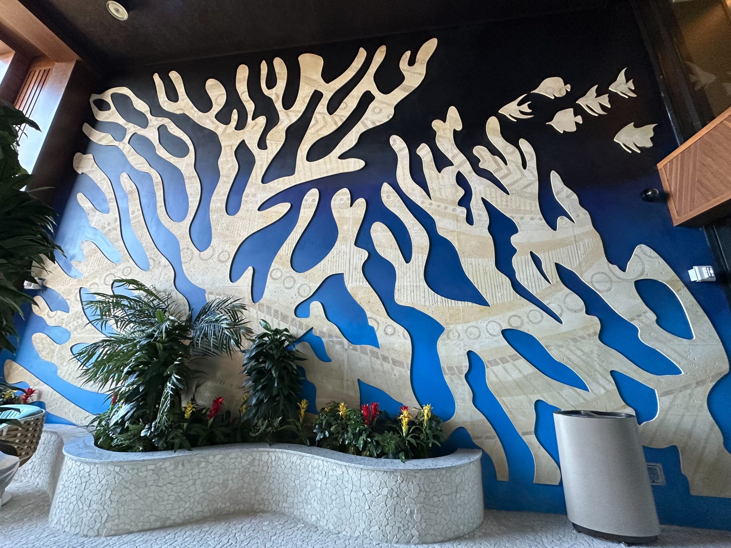 This lounge features tall blue walls with wooden decor cut to look like coral.