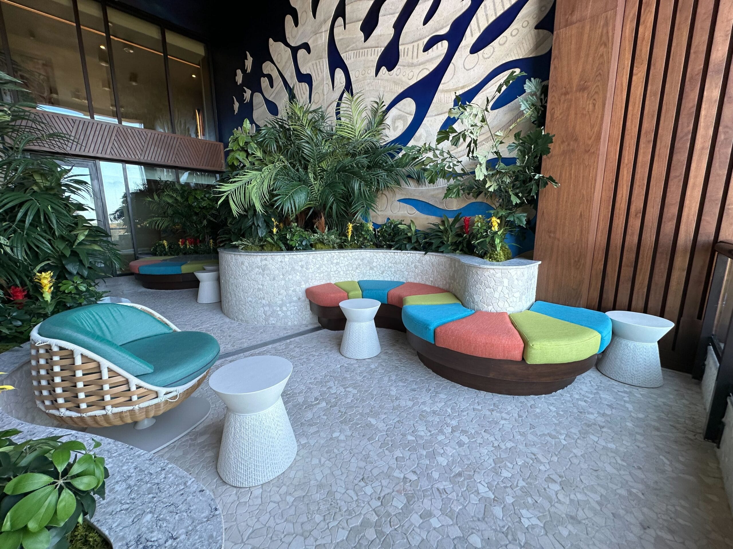 Seating in this terrace lounge includes a snaking bench with blue, coral, and light green seating, white stools, and blue chairs.