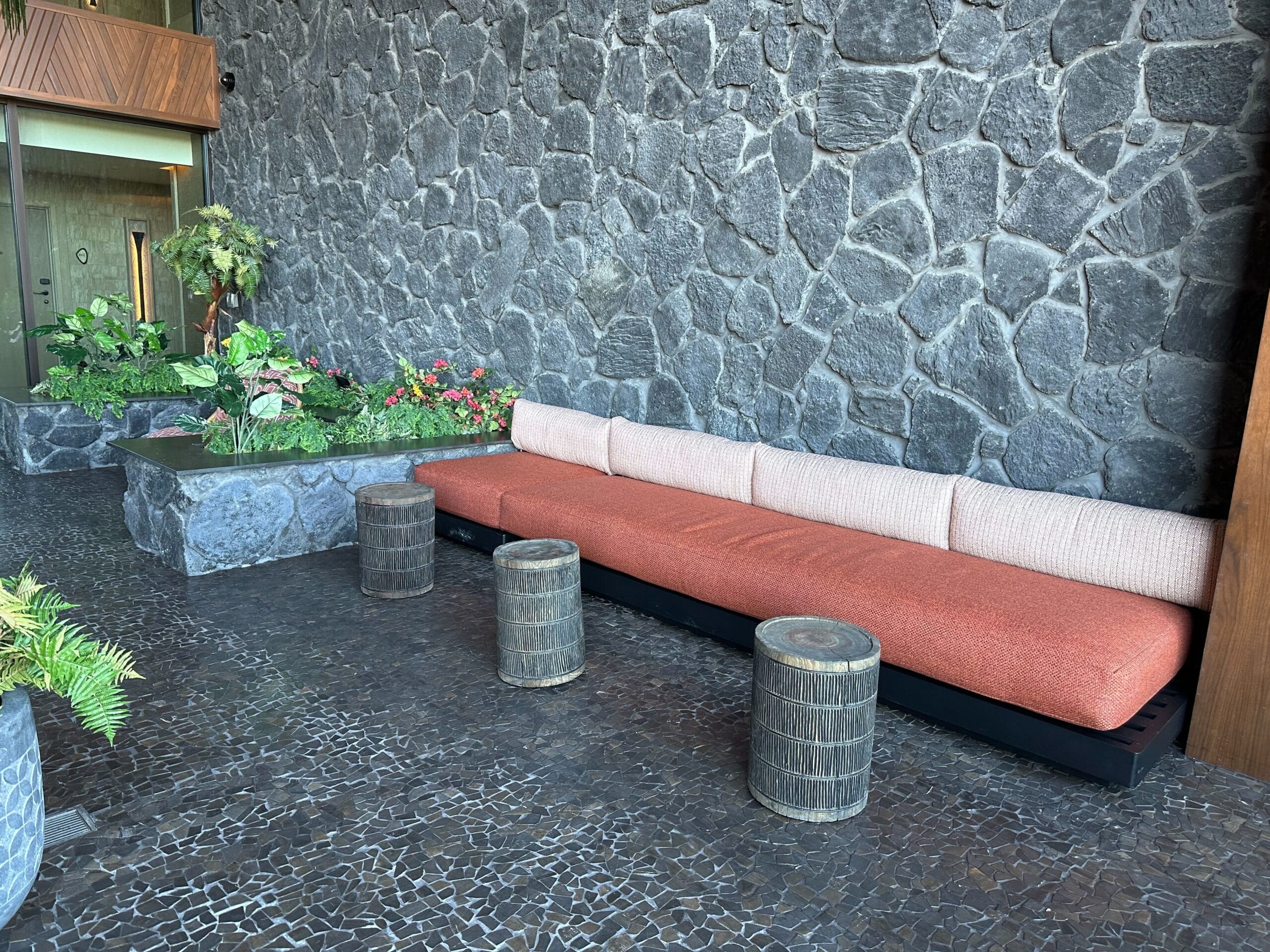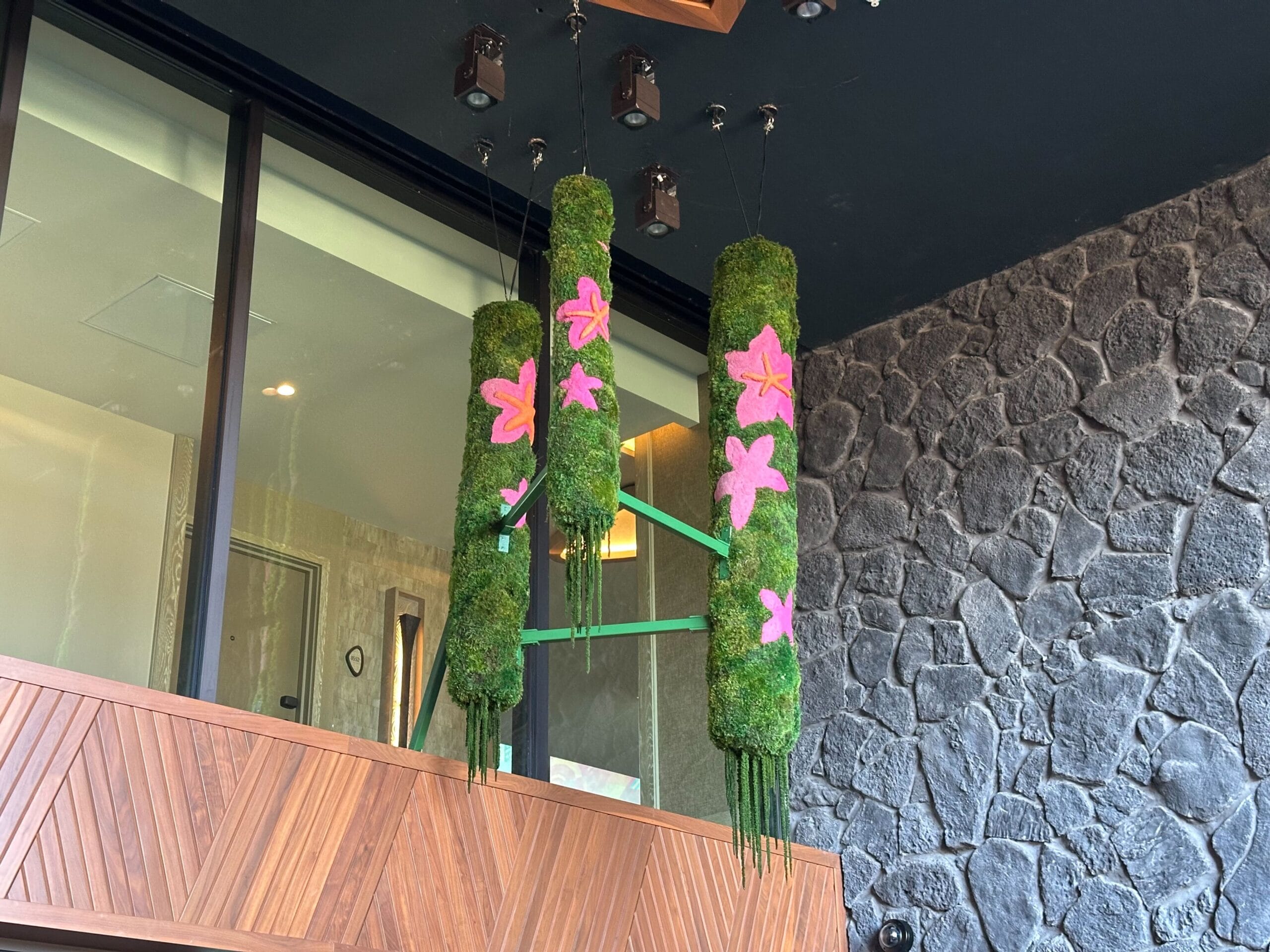 It has a wall of volcanic black rock and several hanging plants. The flooring is dark gray with black rock planters, continuing to reflect the volcanic theme.