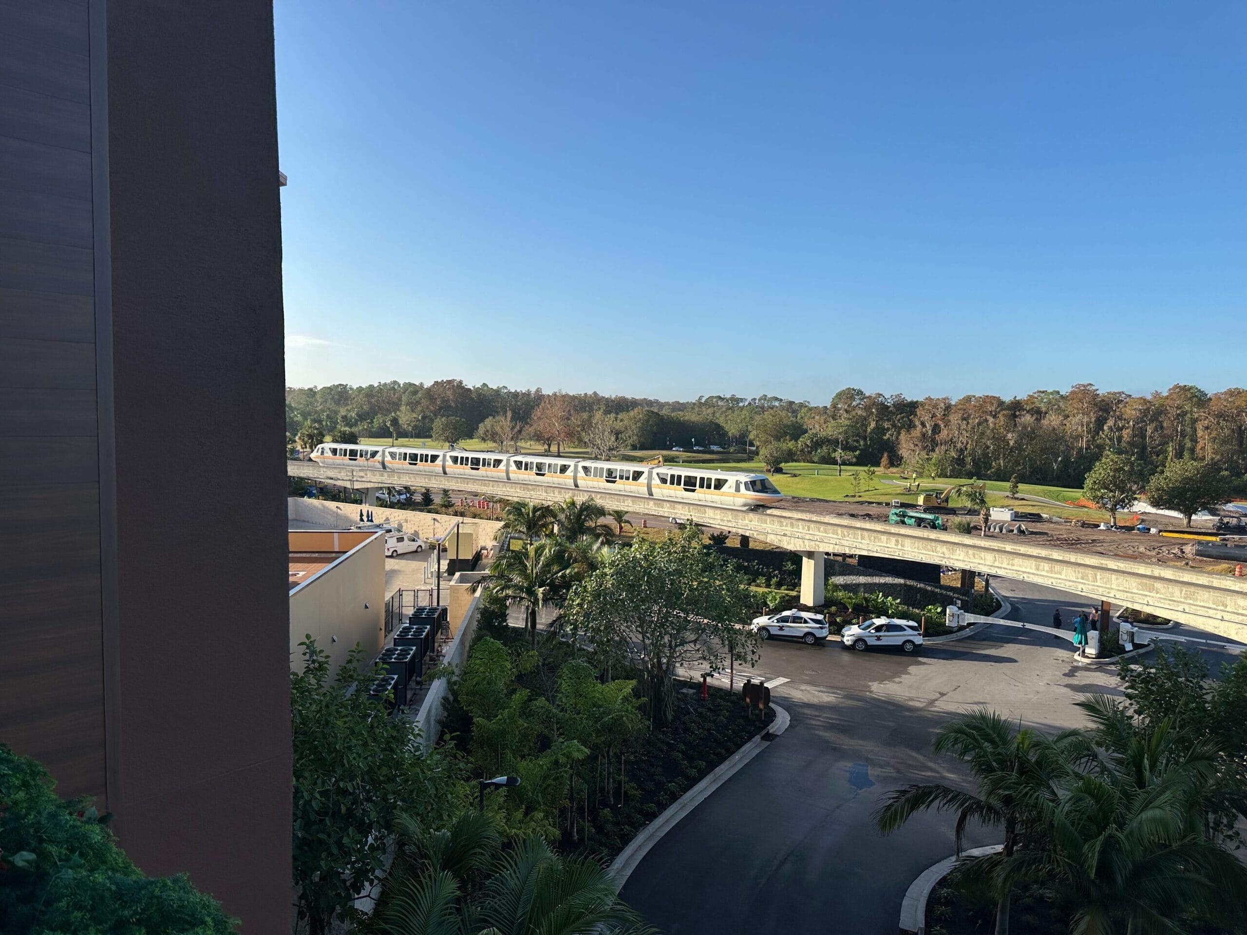 It faces the Monorail track, with views of Disney’s Oak Trail and Magnolia Golf Courses across the street.