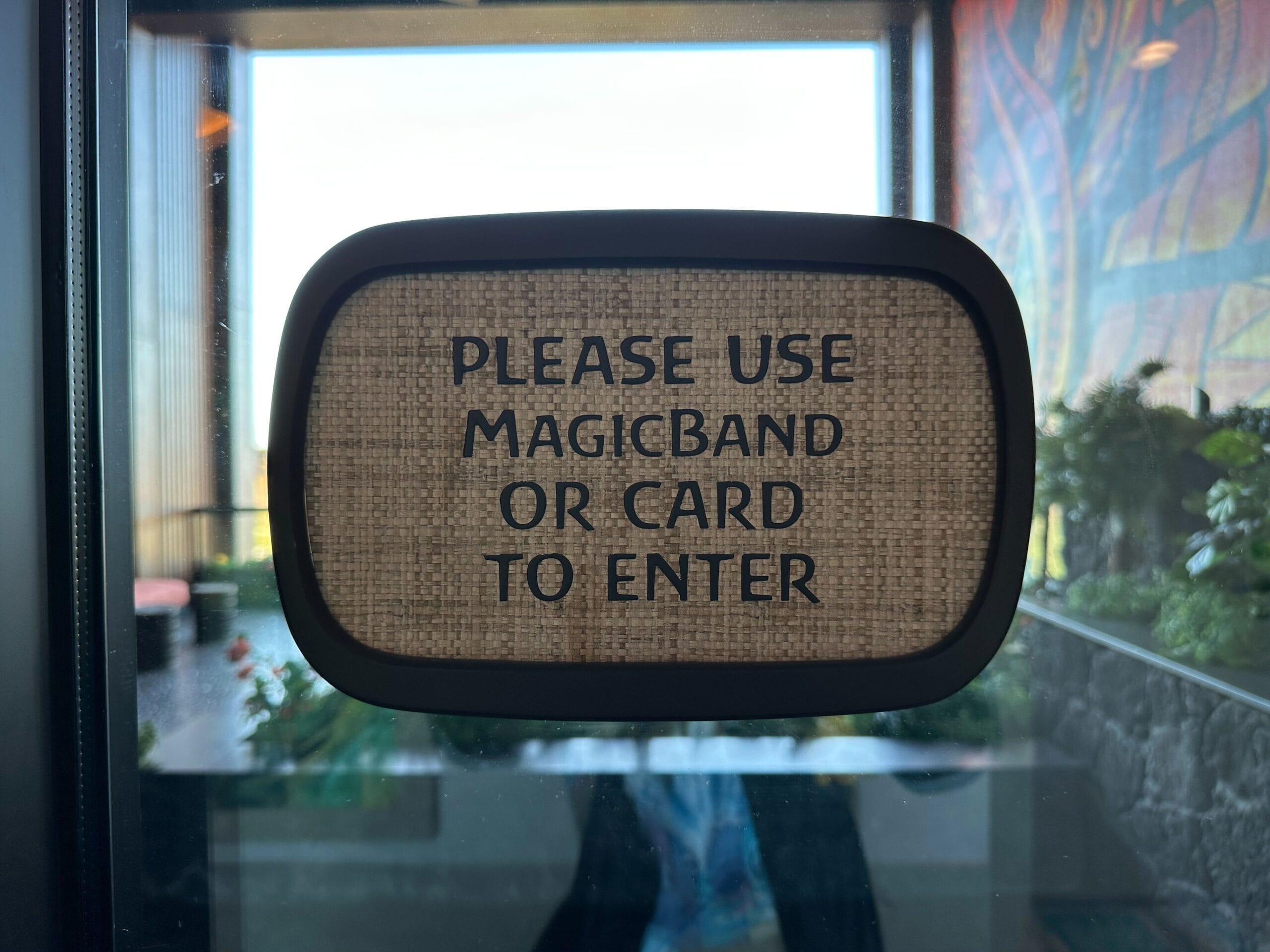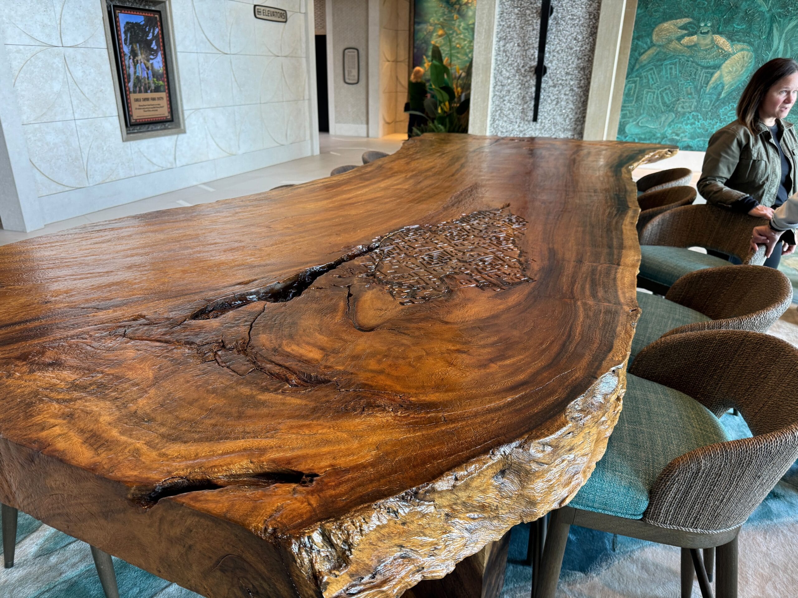 The tower’s color scheme features more blues, representing the ocean, than the rest of Disney’s Polynesian Village Resort. This includes the rugs, which are blue and tan, with ripples like the surface of the ocean.