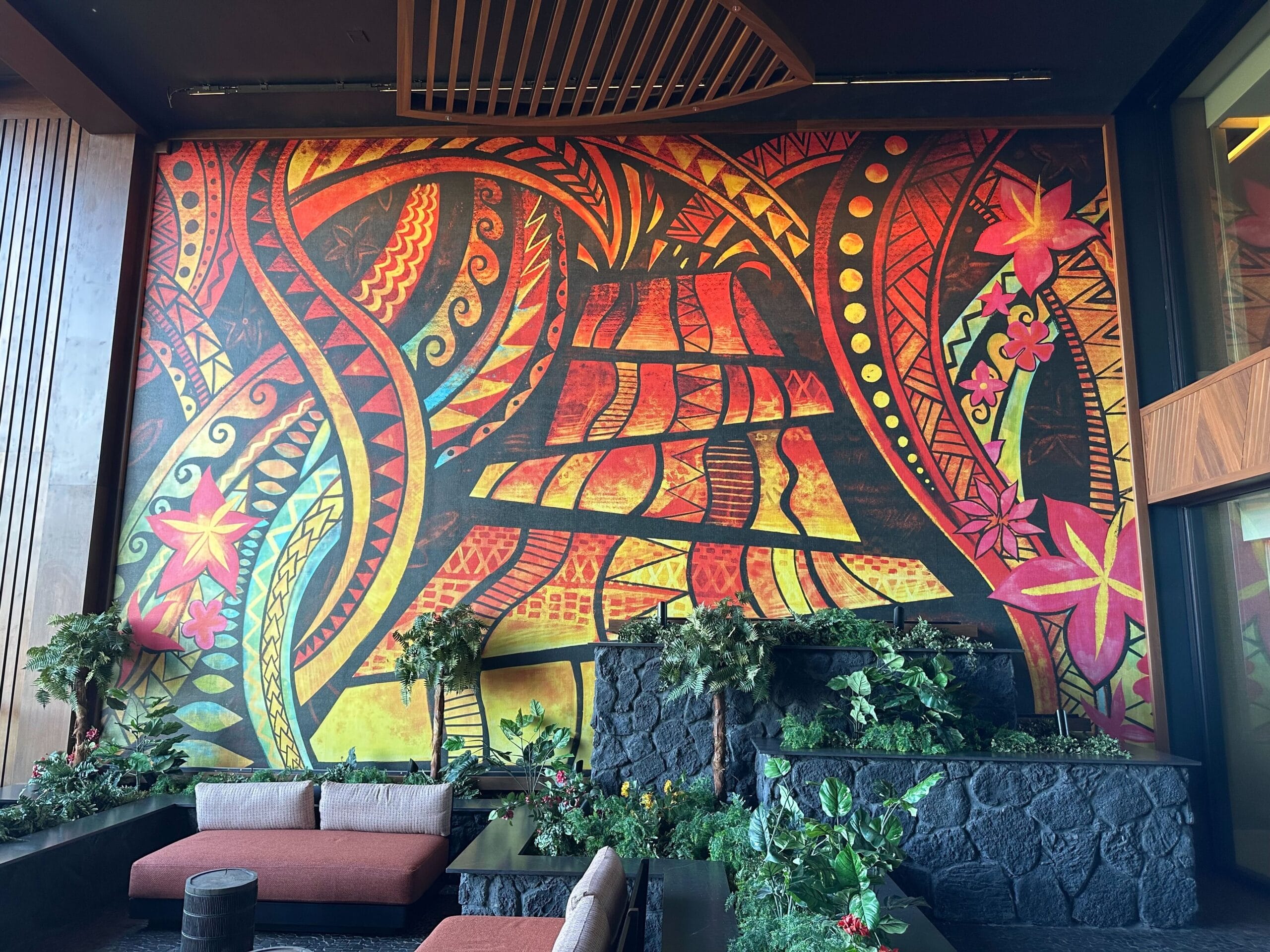On the south wall is a vibrant mural depicting an outrigger similar to Moana’s boat, palm trees, flowers, and birds. The sun shines down on the beachy scene.