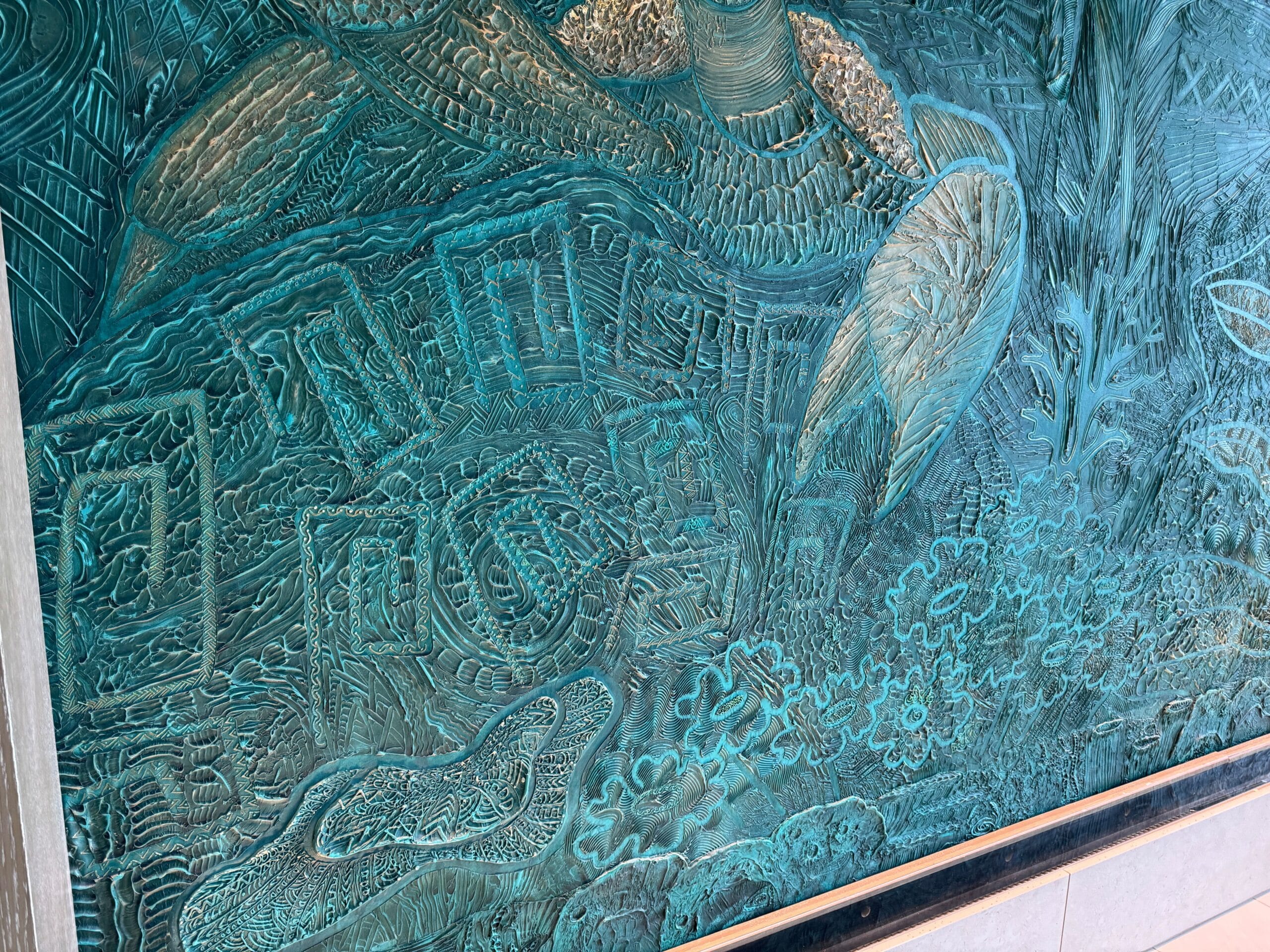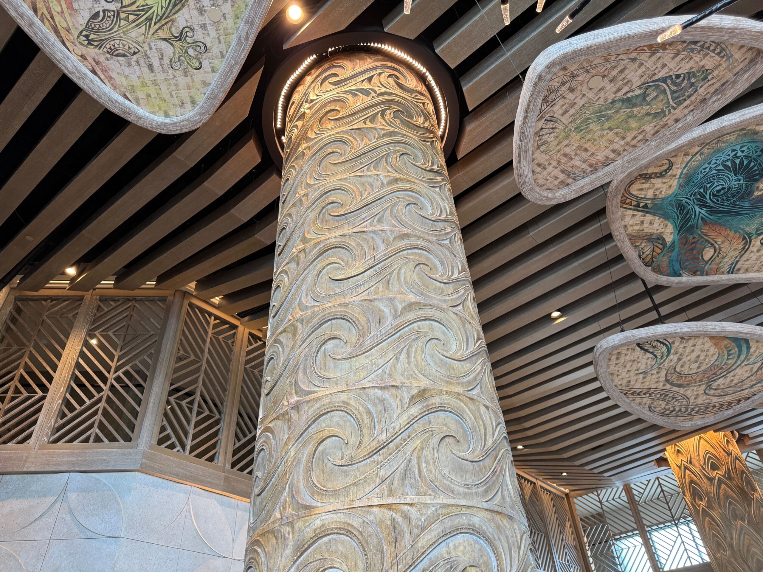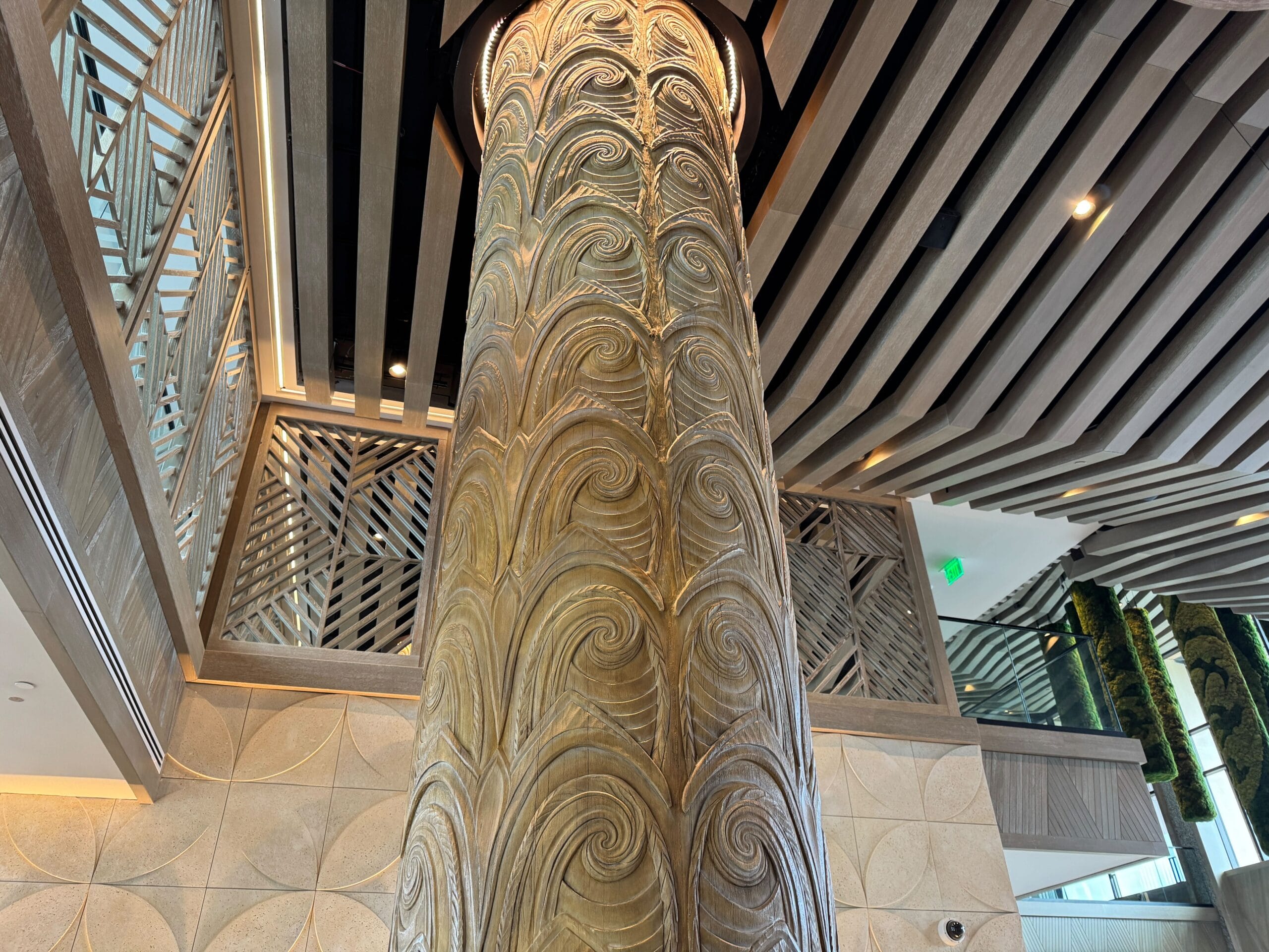 The tower’s theme is “wayfinding.” The carved columns feature different patterns inspired by the elements used in wayfinding: water, fire, wind, and earth.