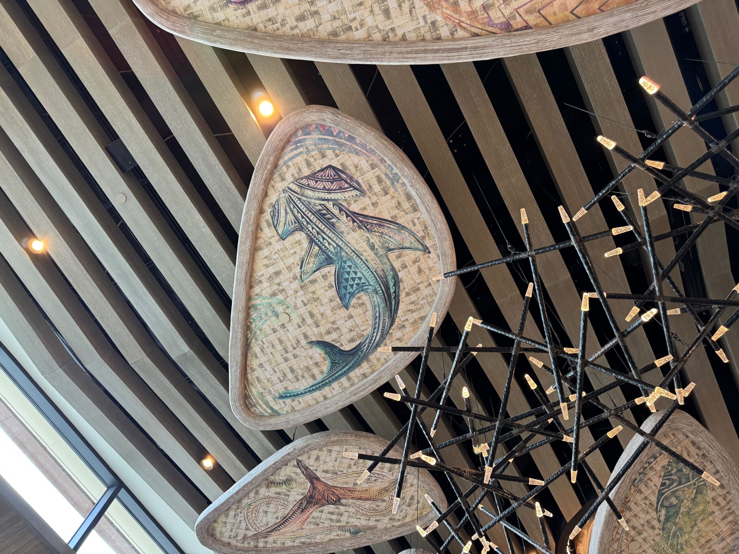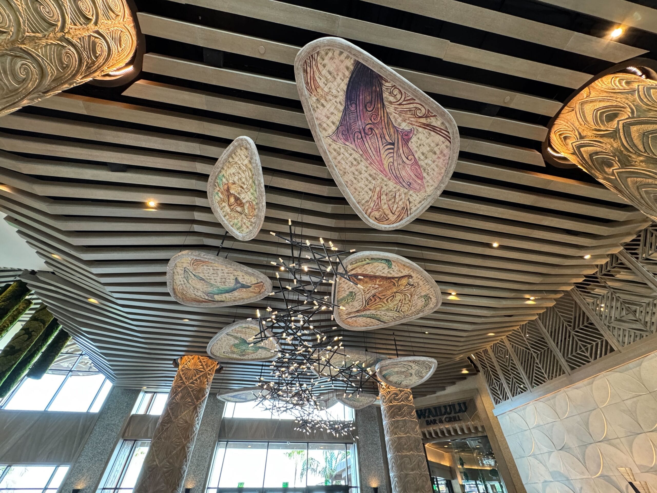 The image captures a ceiling adorned with artistic oval panels featuring fish designs, complemented by a star-like chandelier and tall decorative columns, echoing the tropical elegance of Disney's Polynesian Villas or the serene charm of bungalows at DVC Island Tower.