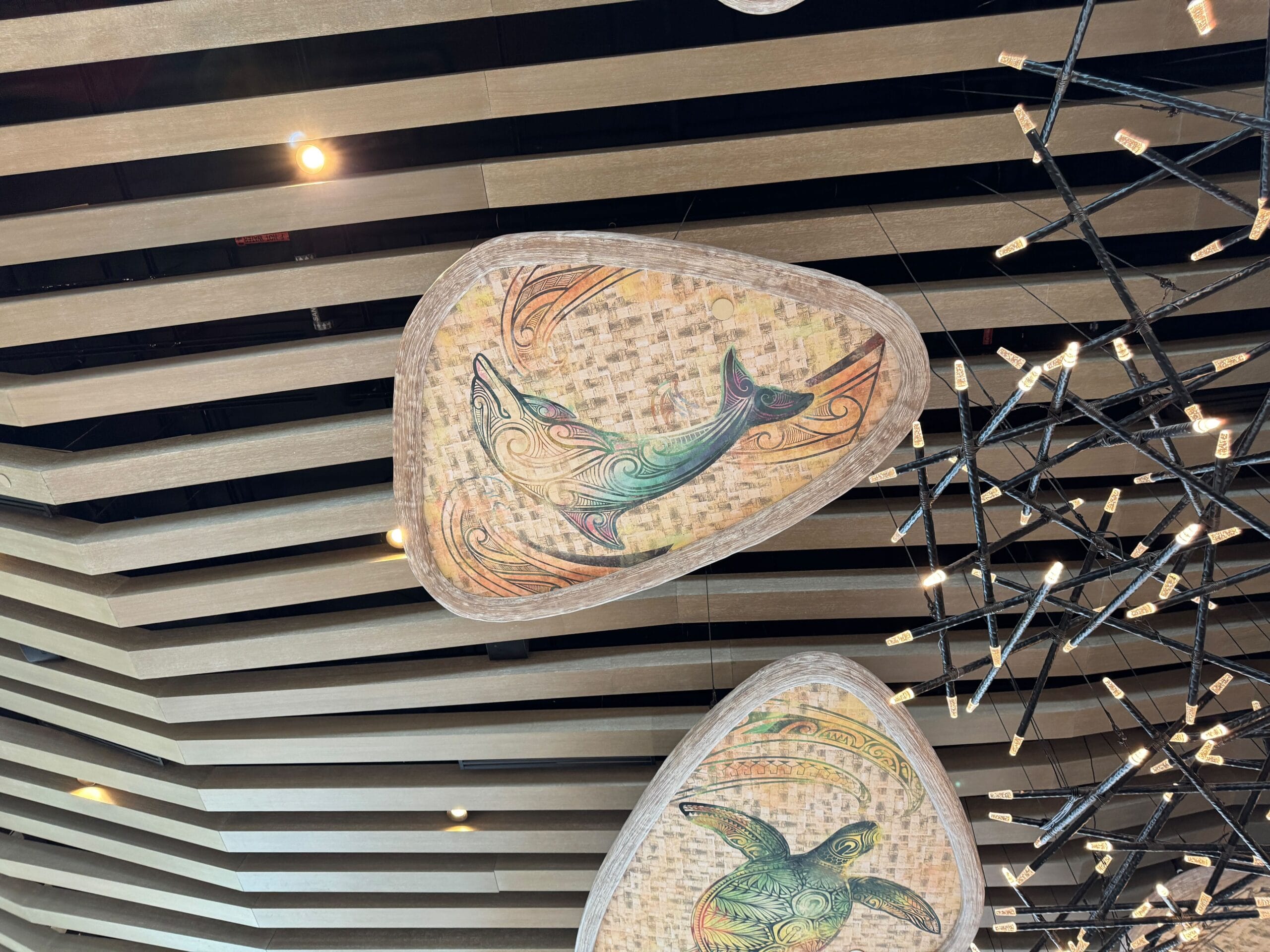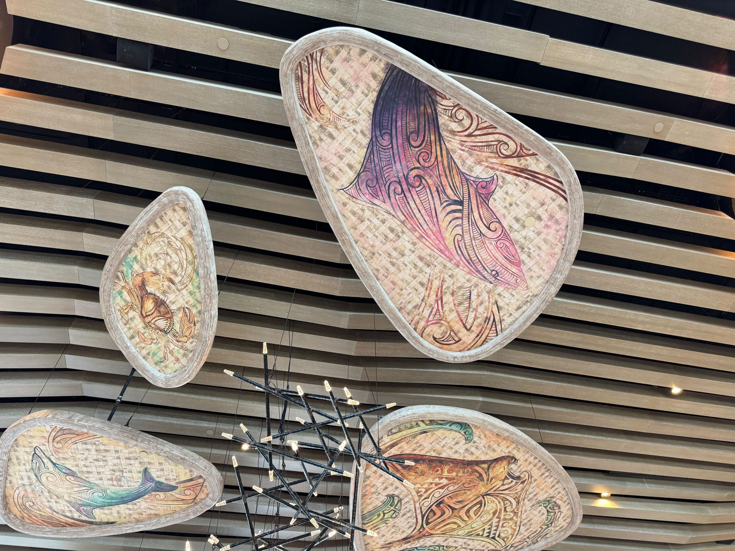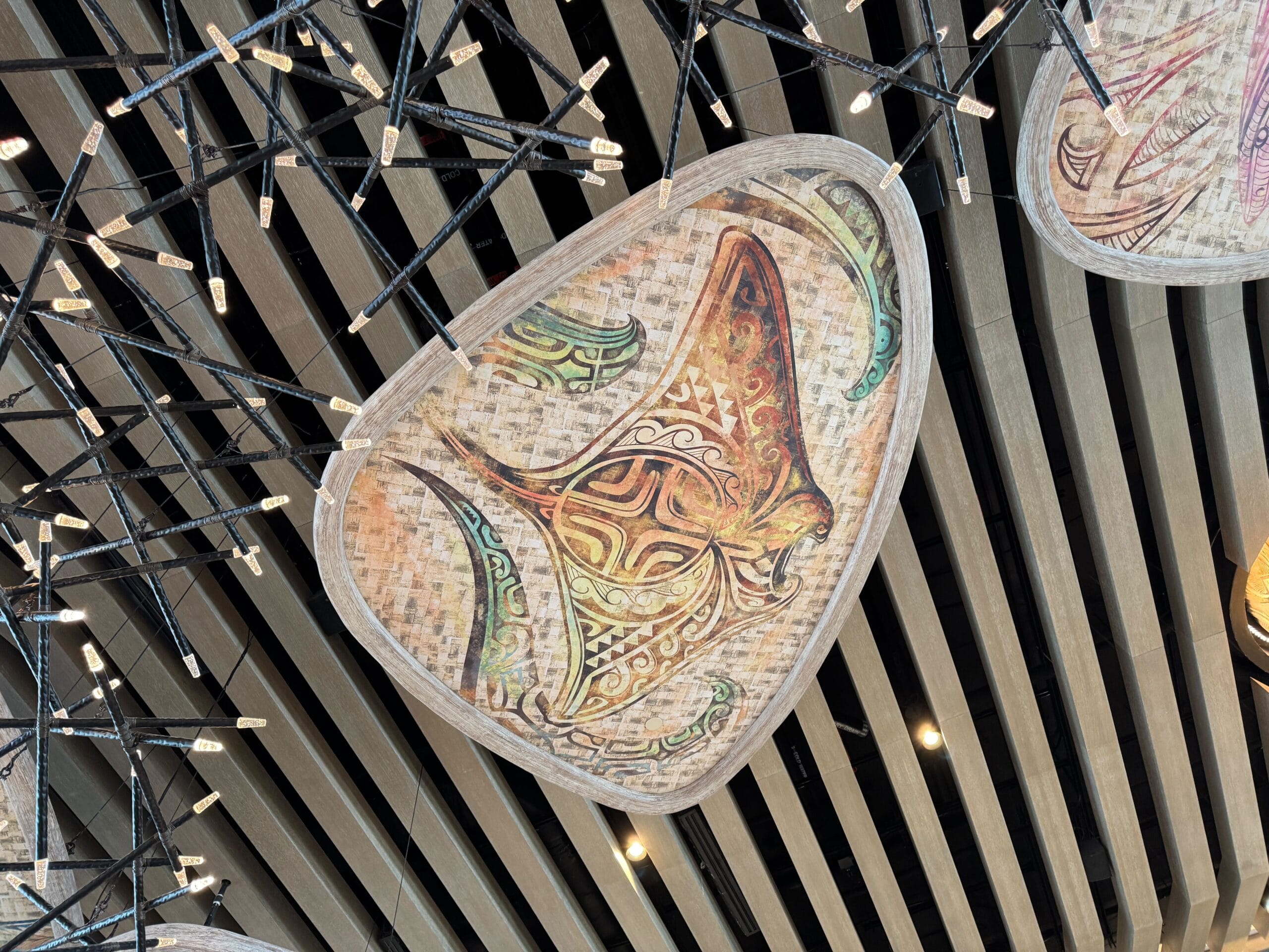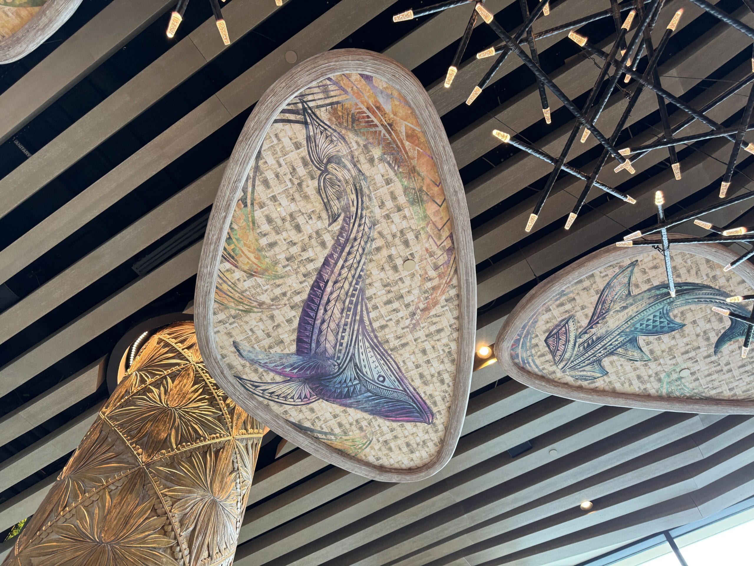 Each piece depicts a sea creature like whales, turtles, and a manta ray. The ray is a recurring element of the Island Tower partially inspired by Gramma Tala from “Moana.”