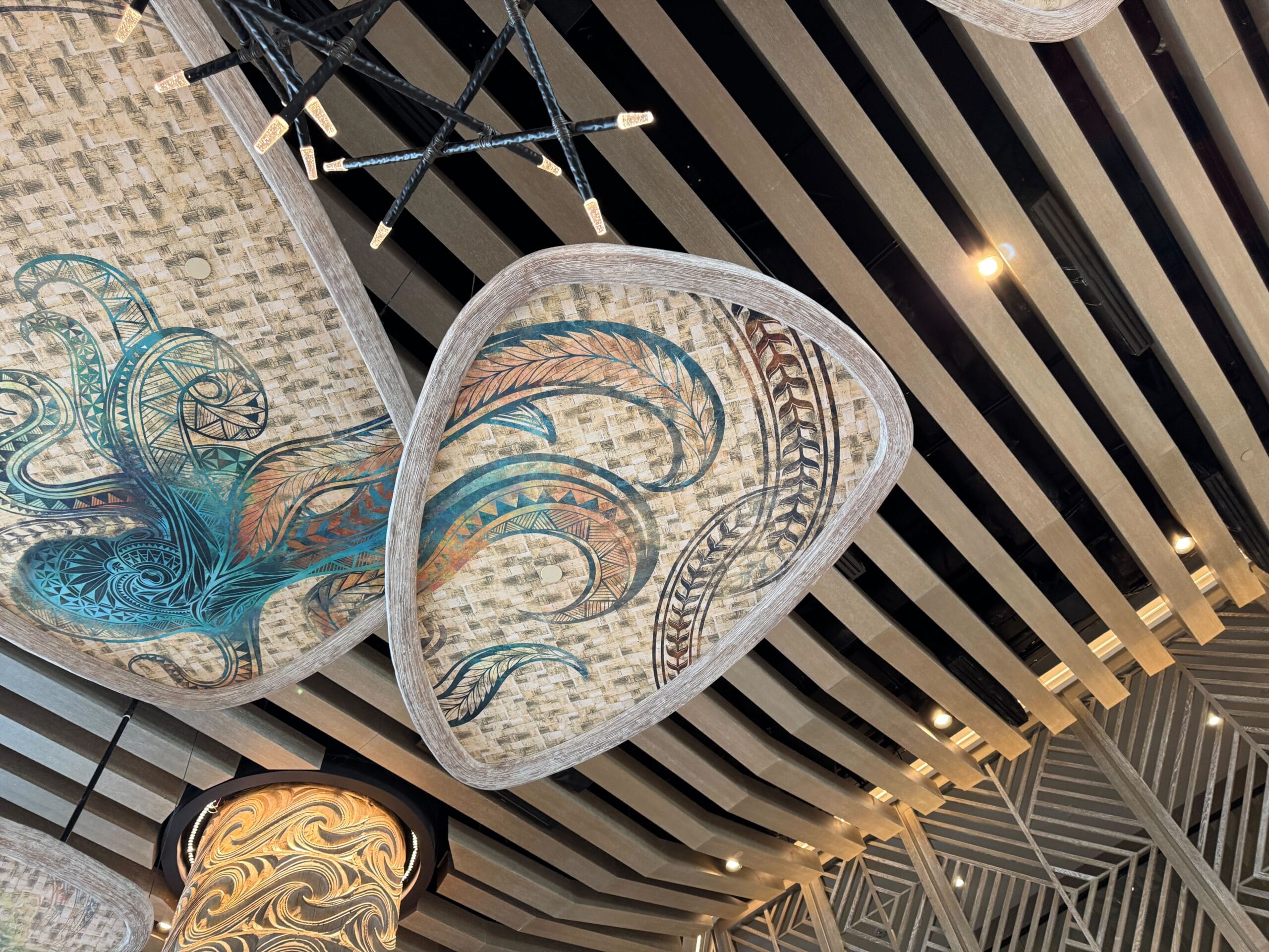 The elevator bank has another piece of artwork depicting Polynesian sailboats, set against a dark blue wall. On the ceiling are chandeliers with strings of beads.