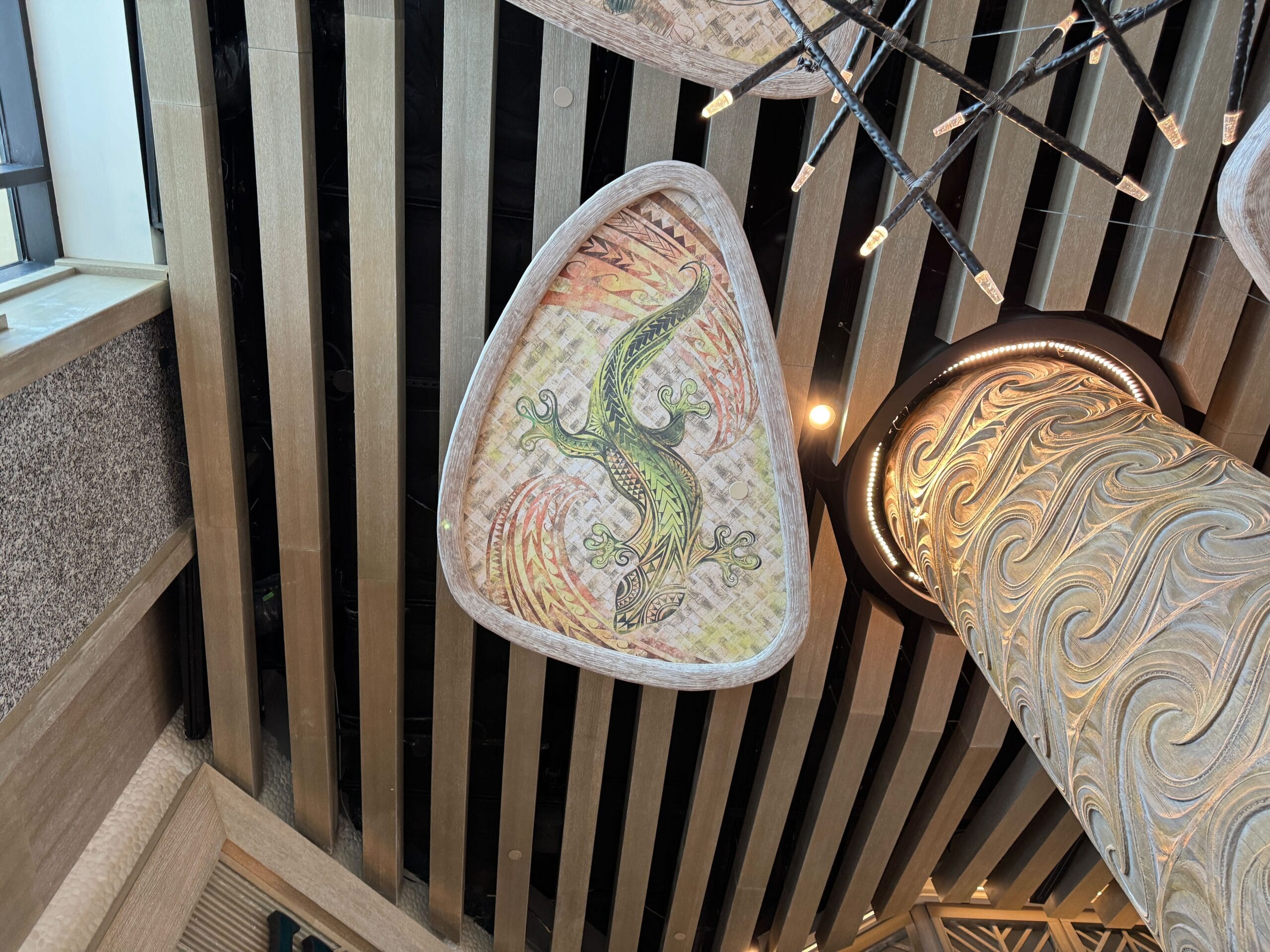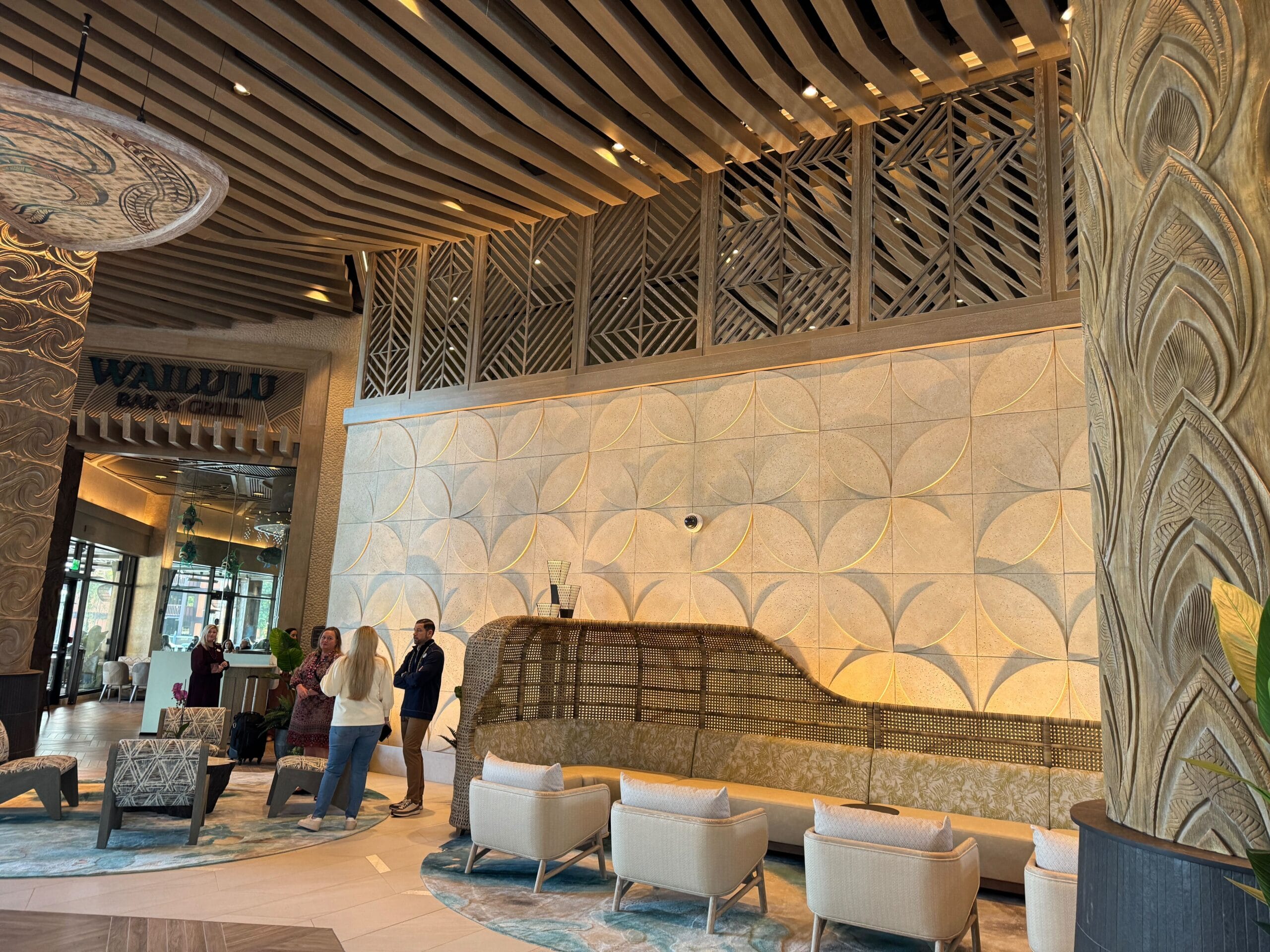 The Island Tower lobby has a zig-zagging pathway of brown wood cutting between white tiles. On the ceiling are island-shaped panels created by sculptor Nick Petronzio. These lead from the tower entrance to Wailulu Bar & Grill.