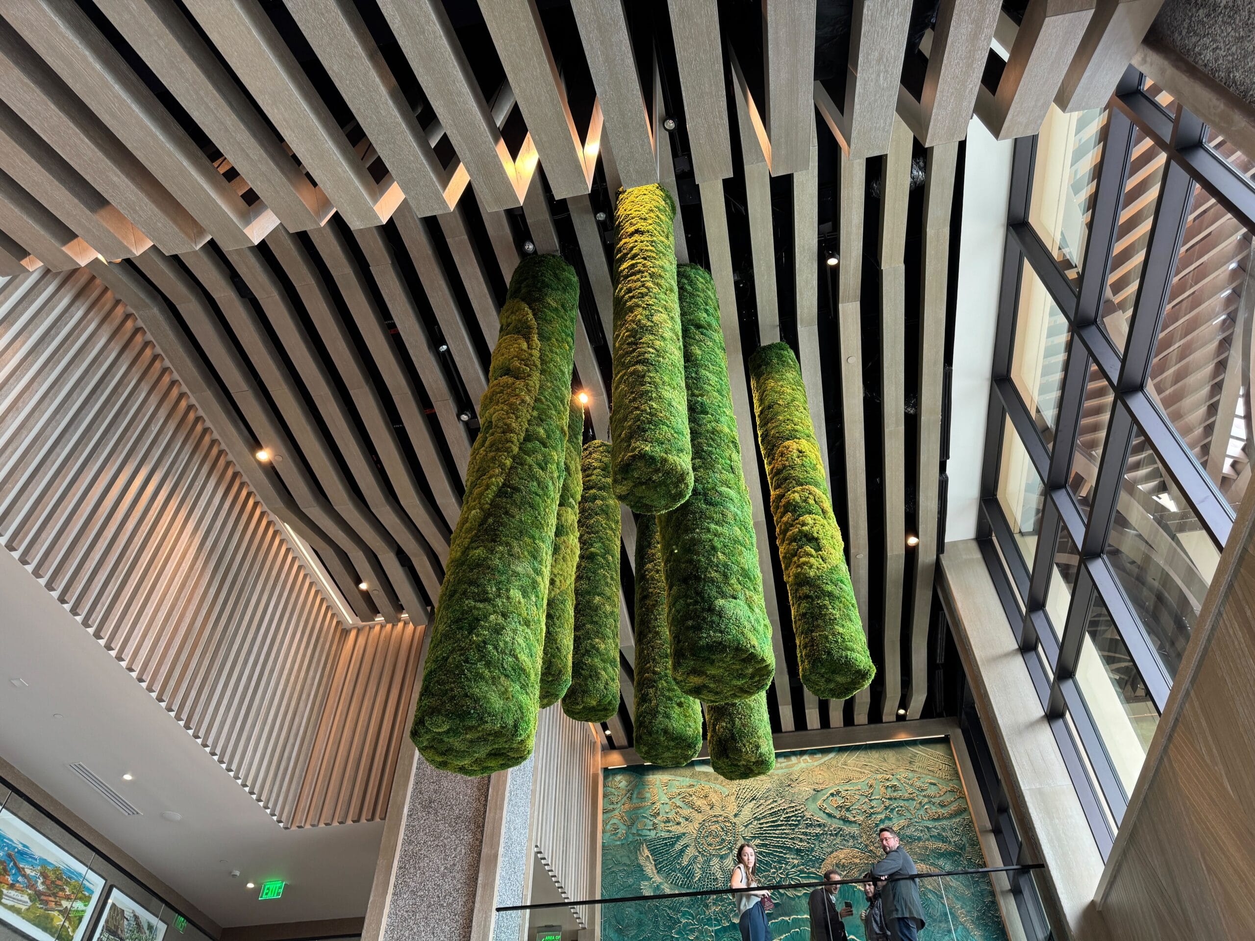 Mossy pillars hang from the wavy slatted ceiling above a seating area. Tall windows at the back of the lobby bring sunlight into this space.