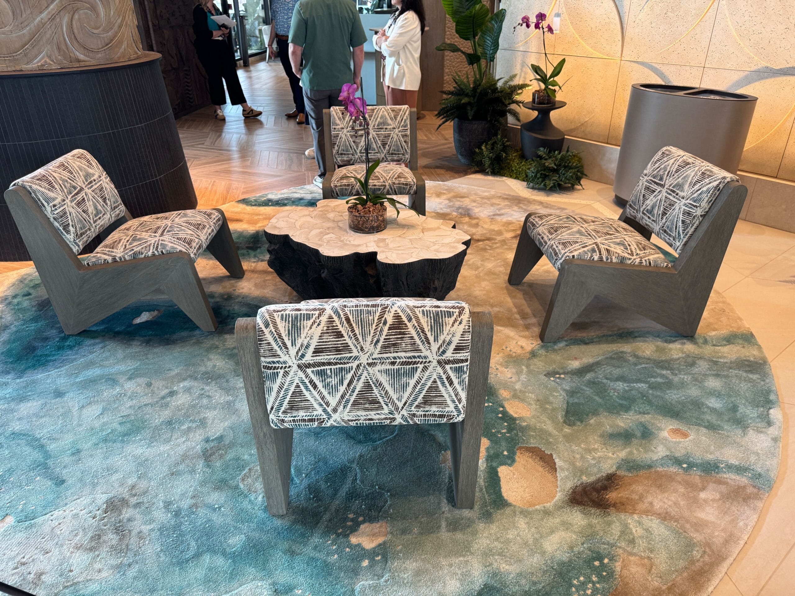 Hotel lobby with patterned walls, ceiling designs, and four white chairs. A group of people stand talking. A sign reads "Waikiki Beach Club.