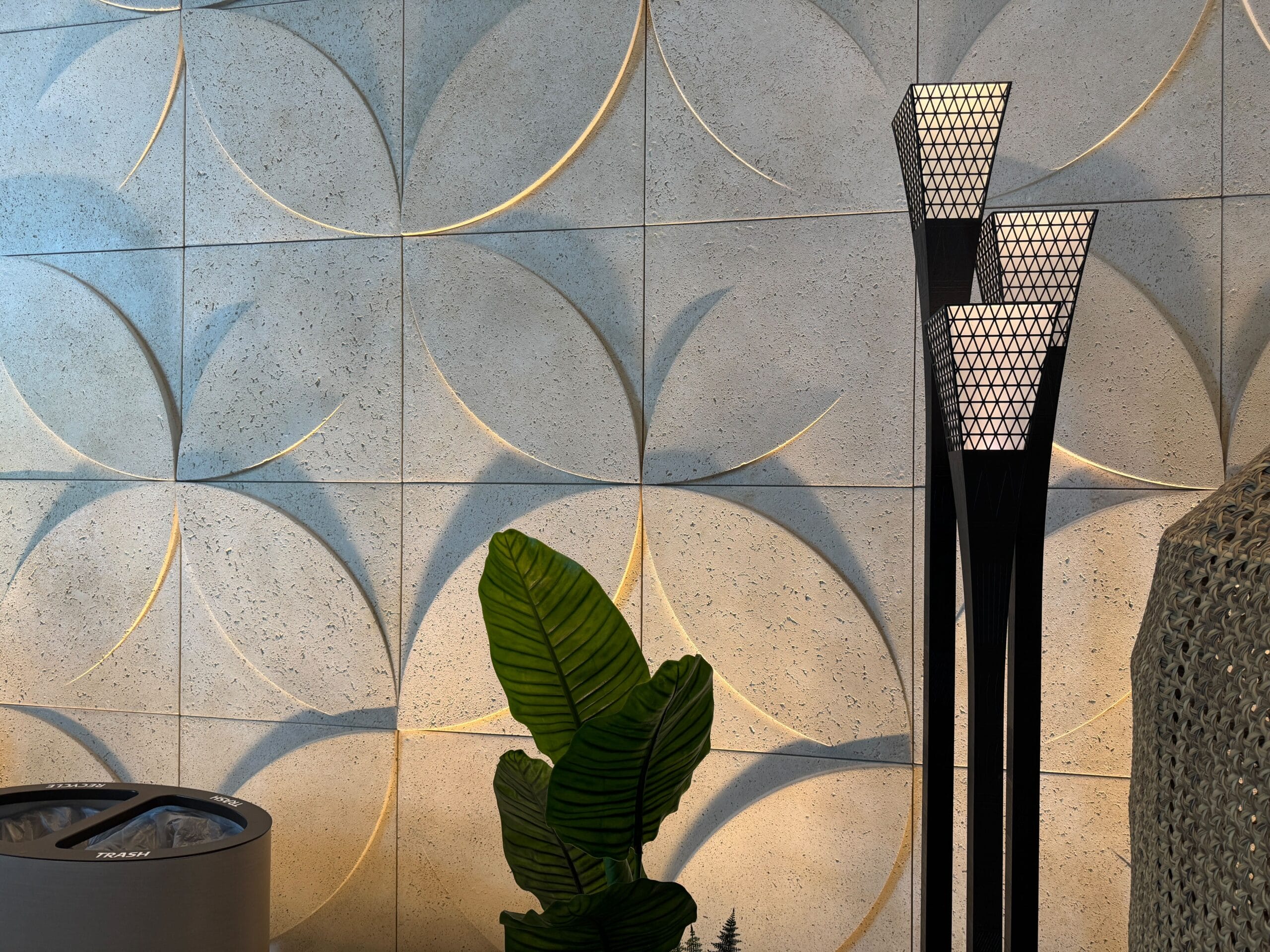 On the walls are dimensional pointed ovals, creating circle and diamond shapes. Lights below cast shadows across the panels, which create the illusion of more depth.