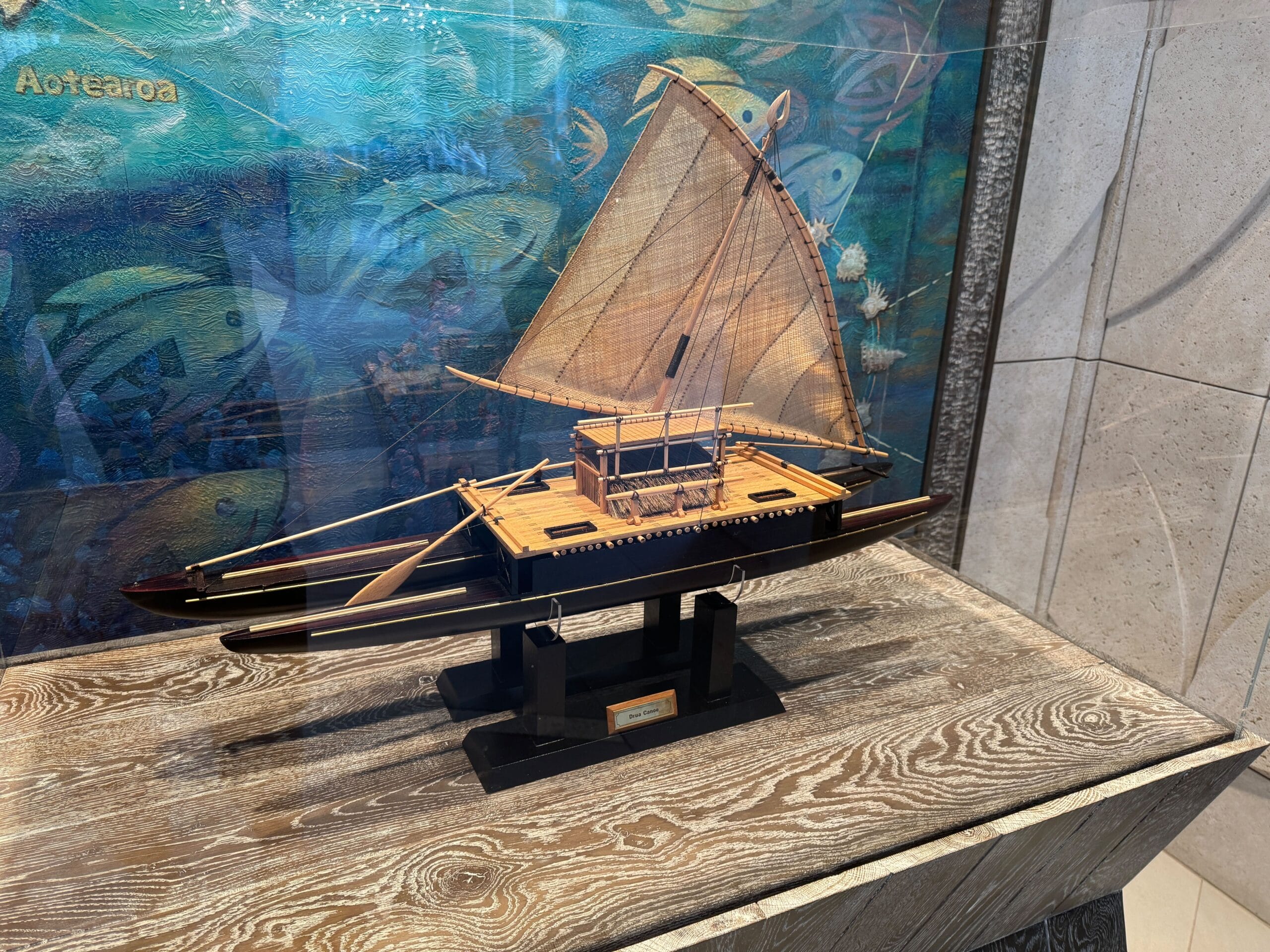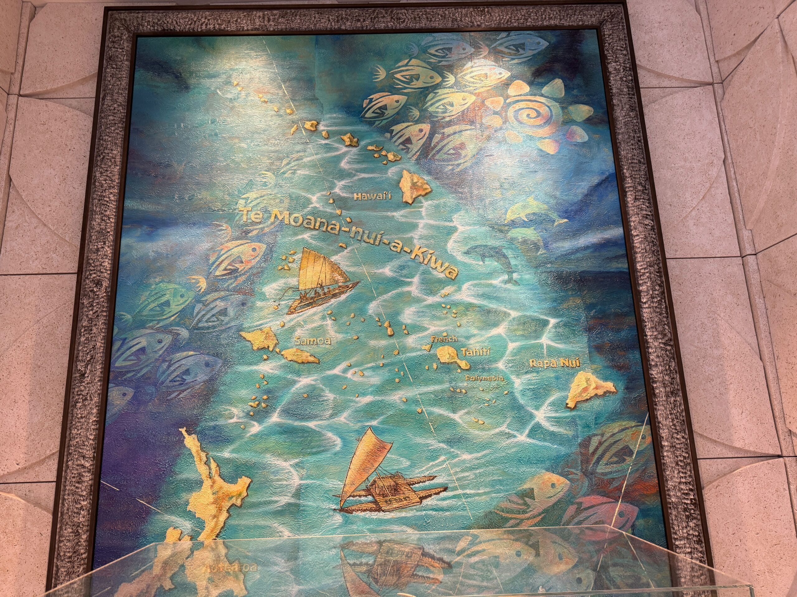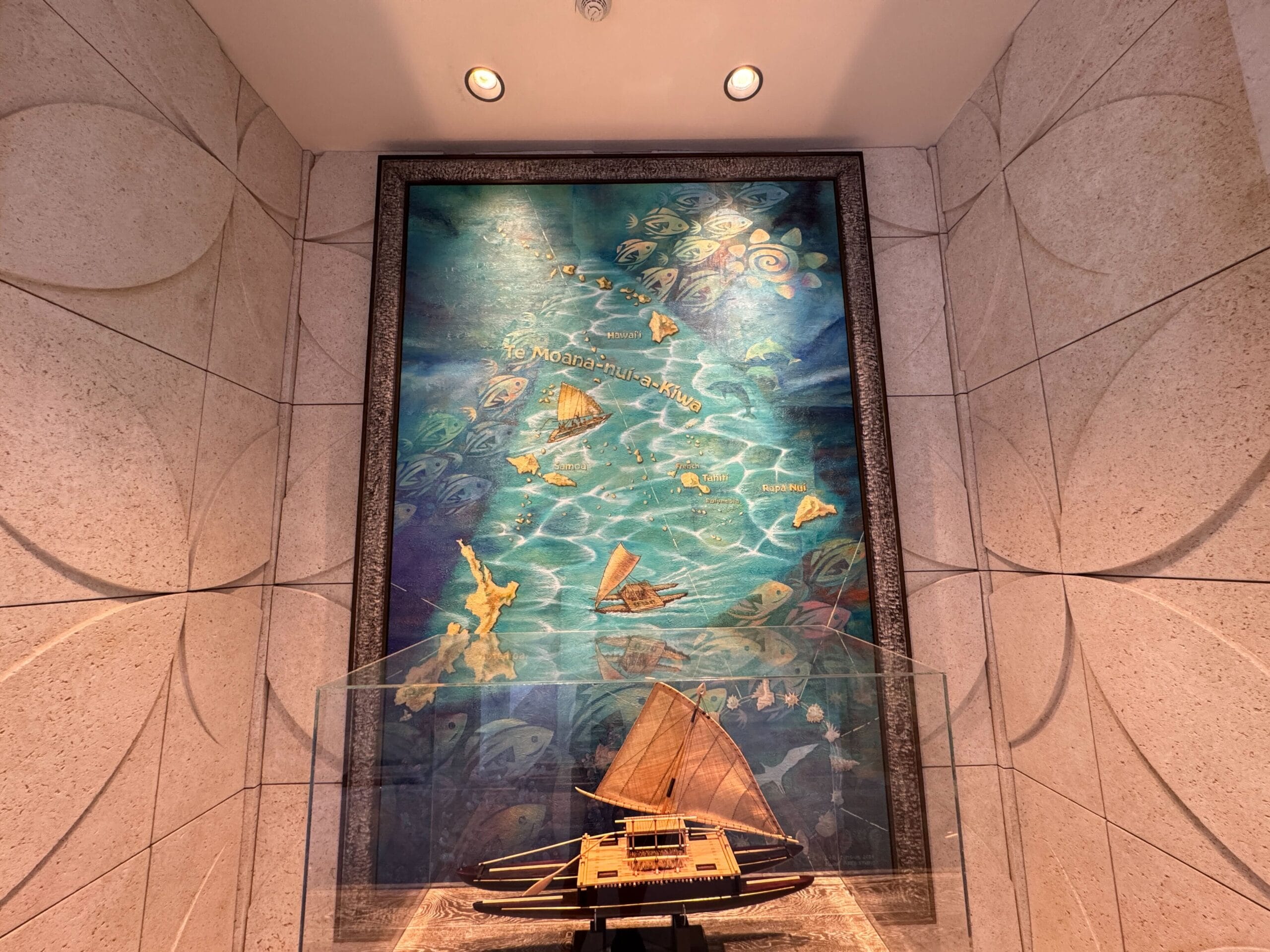 This alcove features a stylized painted map of Polynesia. Sitting on a table in front of the framed painting is a model of a drua canoe, a Polynesian sailing boat.