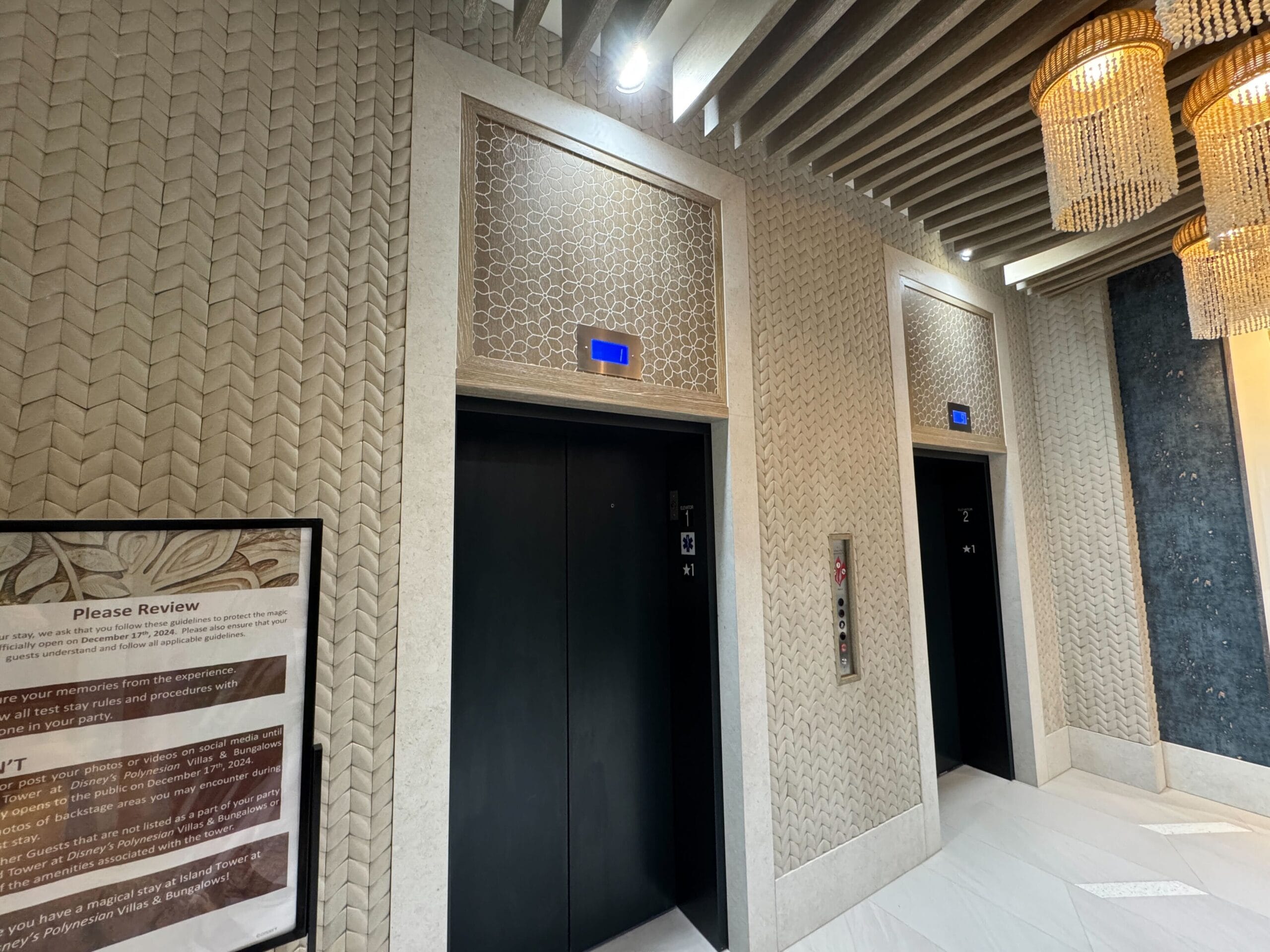 Two closed elevator doors in a stylish lobby of Disney's Polynesian Villas, with patterned walls and overhead chandeliers. A sign with guidelines is visible on the left, echoing the elegance of the nearby DVC Island Tower.