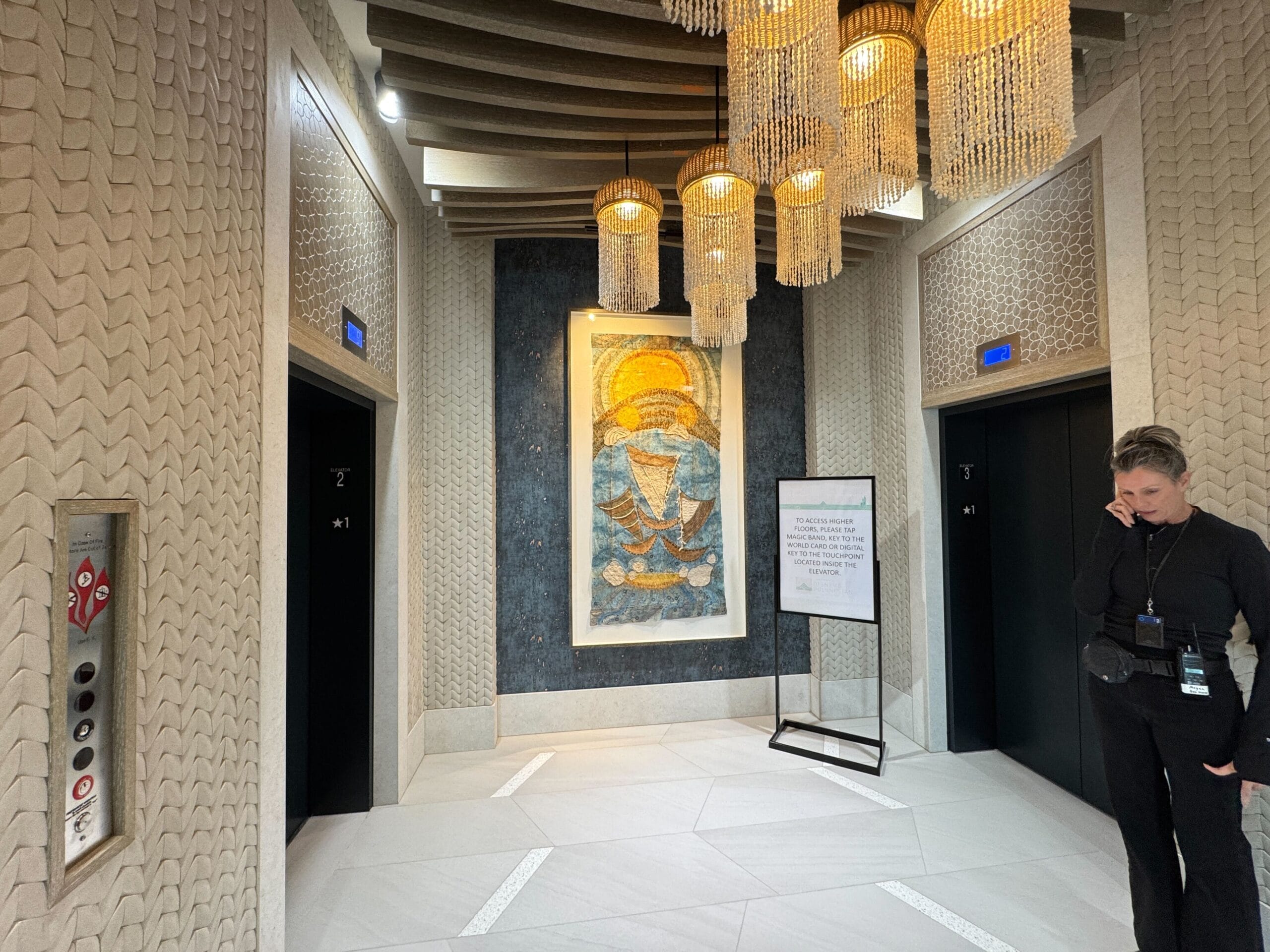 A hotel elevator lobby with two elevators, a decorative mosaic, and hanging chandeliers evokes the tropical charm of Disney's Polynesian Villas. A person in black stands near the elevators, while a sign on an easel is displayed in front of the mosaic.