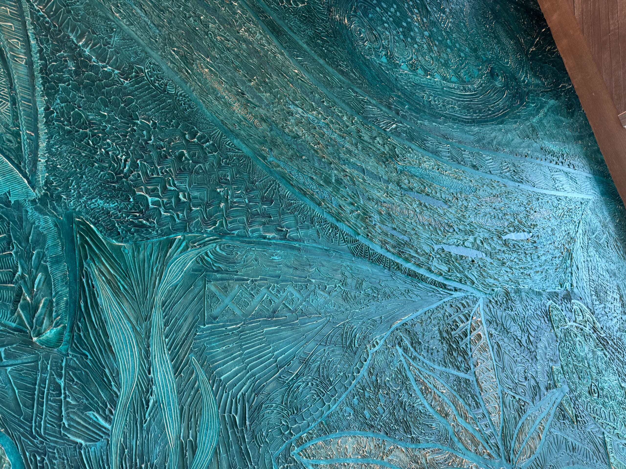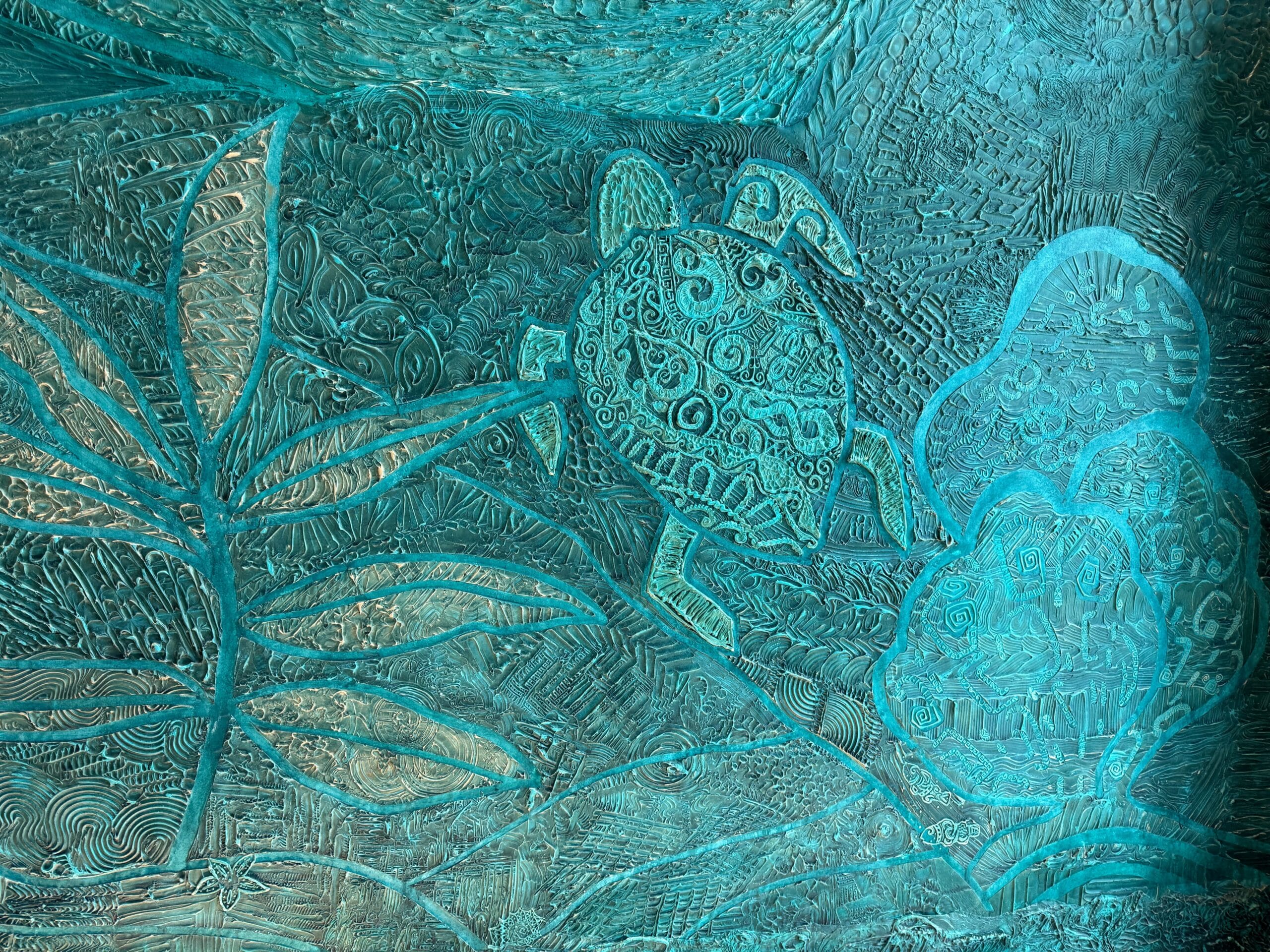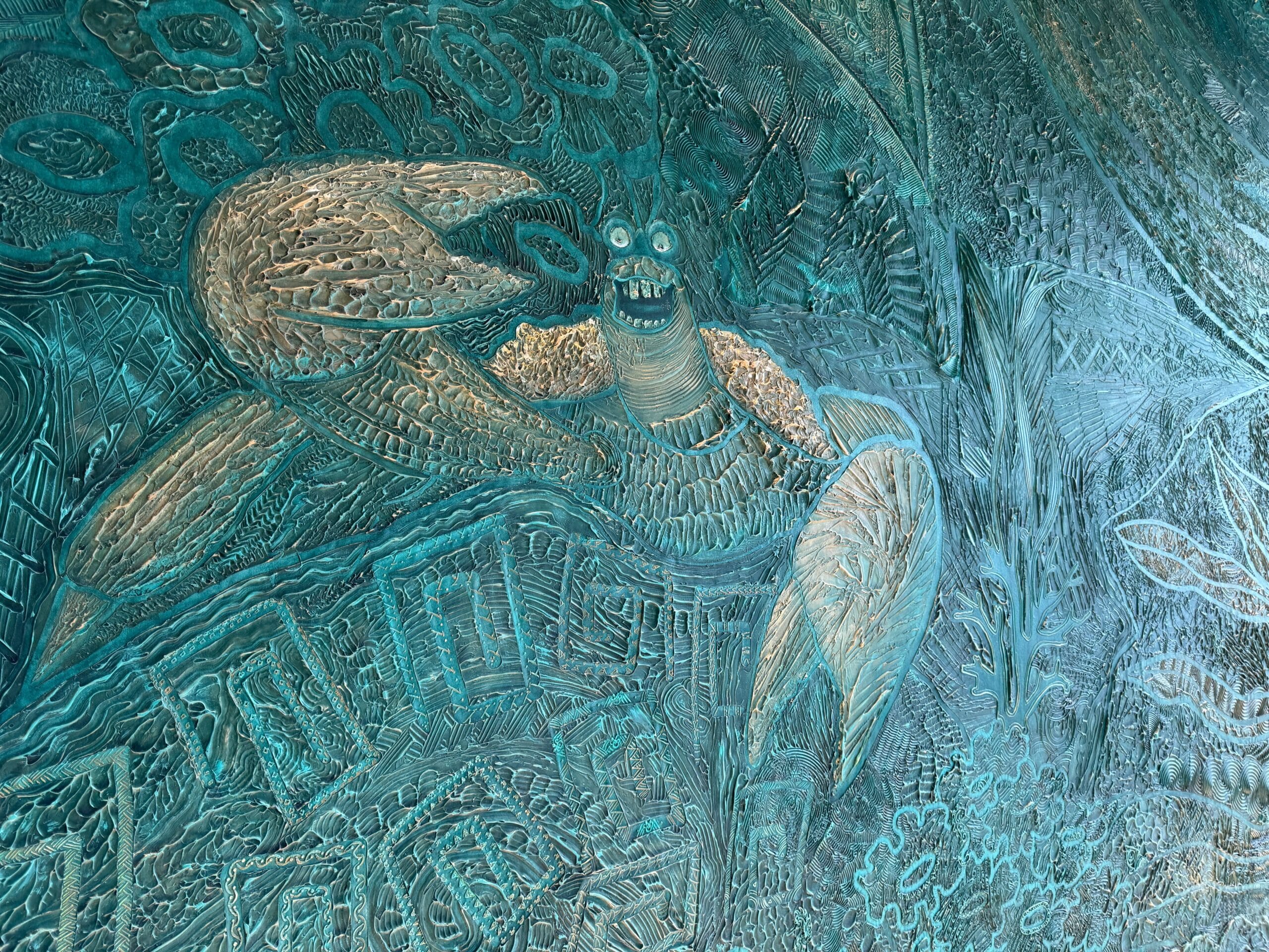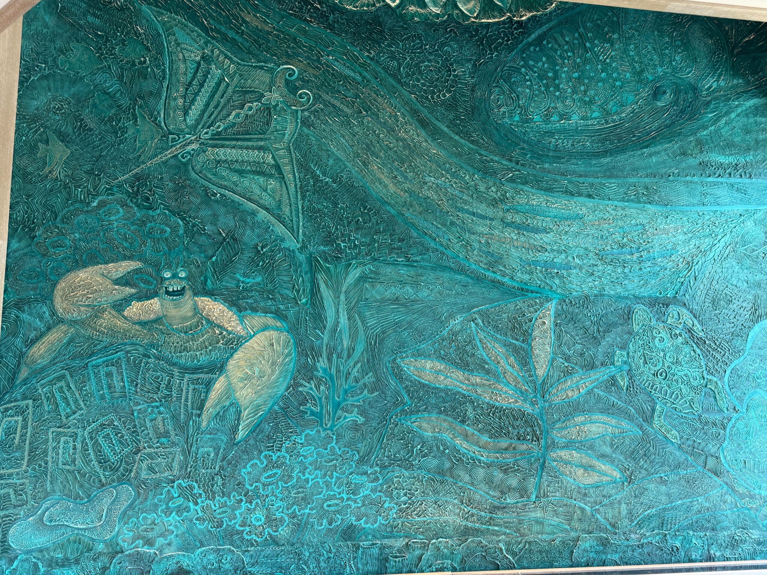 An intricate artwork depicts an underwater scene with a large sea creature, a crab, and various marine plants, all in shades of green and turquoise.