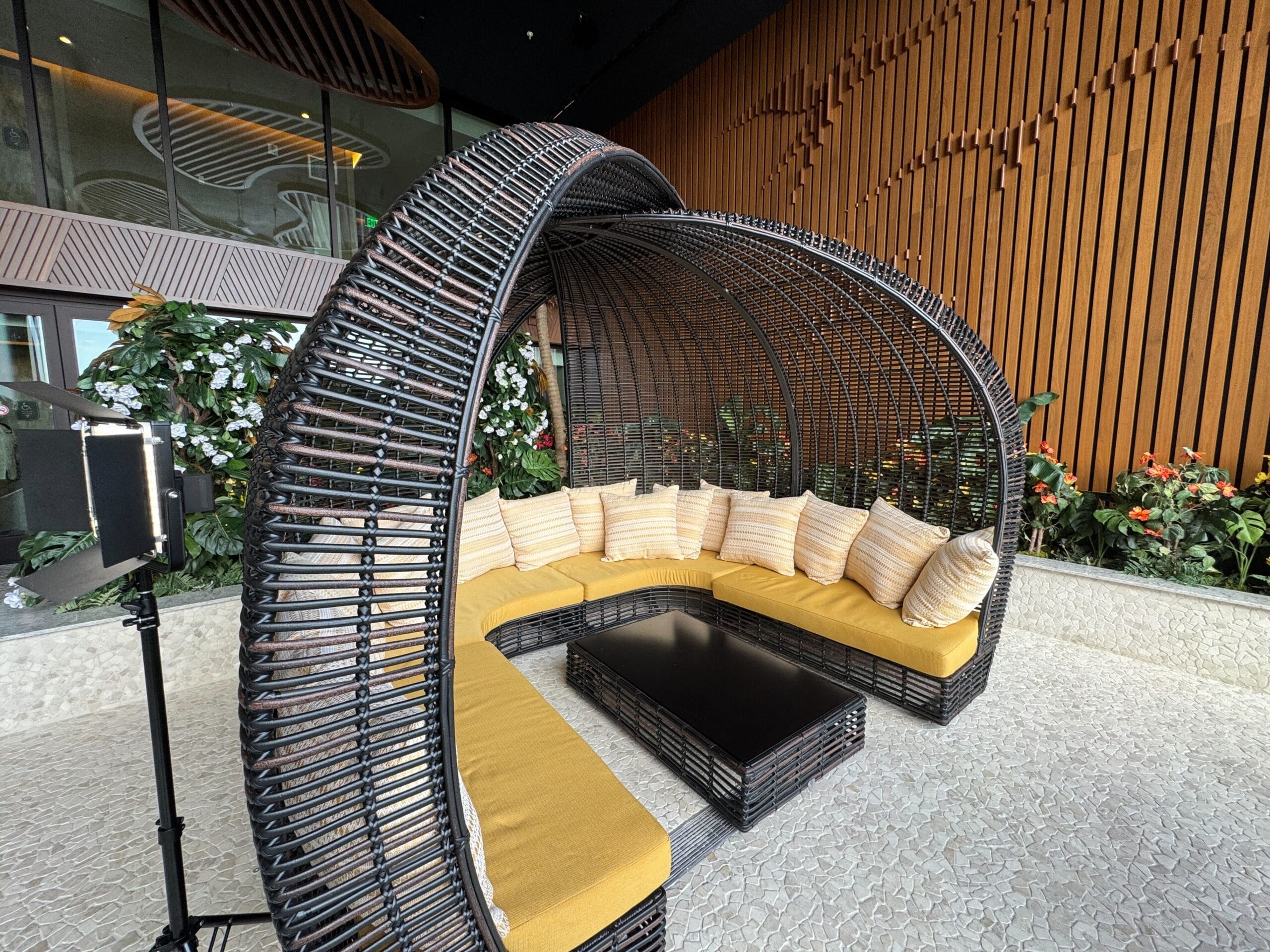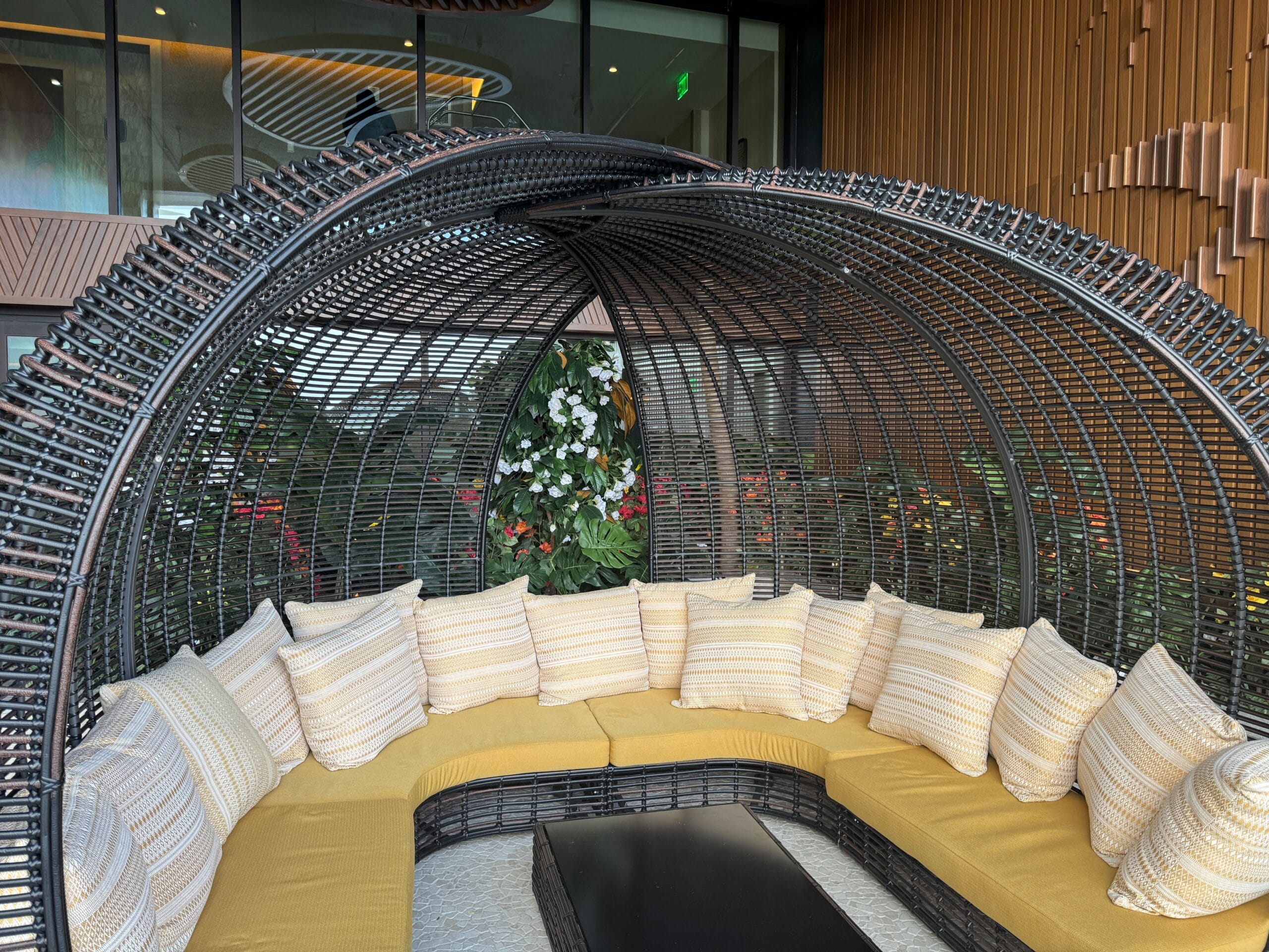 A semi-circular wicker seating area with yellow cushions and striped pillows, set in a modern space reminiscent of Disney's Polynesian Villas, featuring glass windows and lush greenery in the background.
