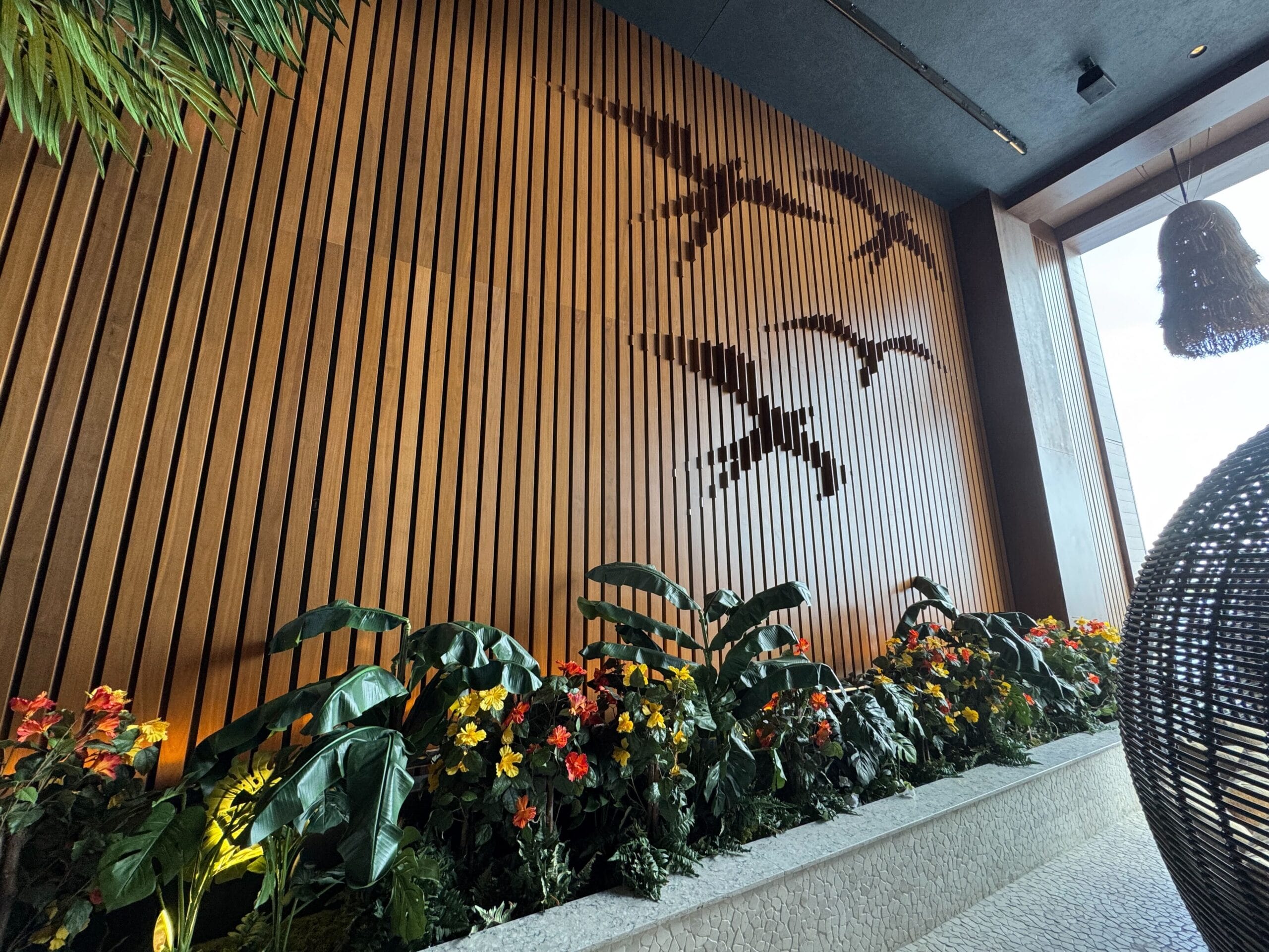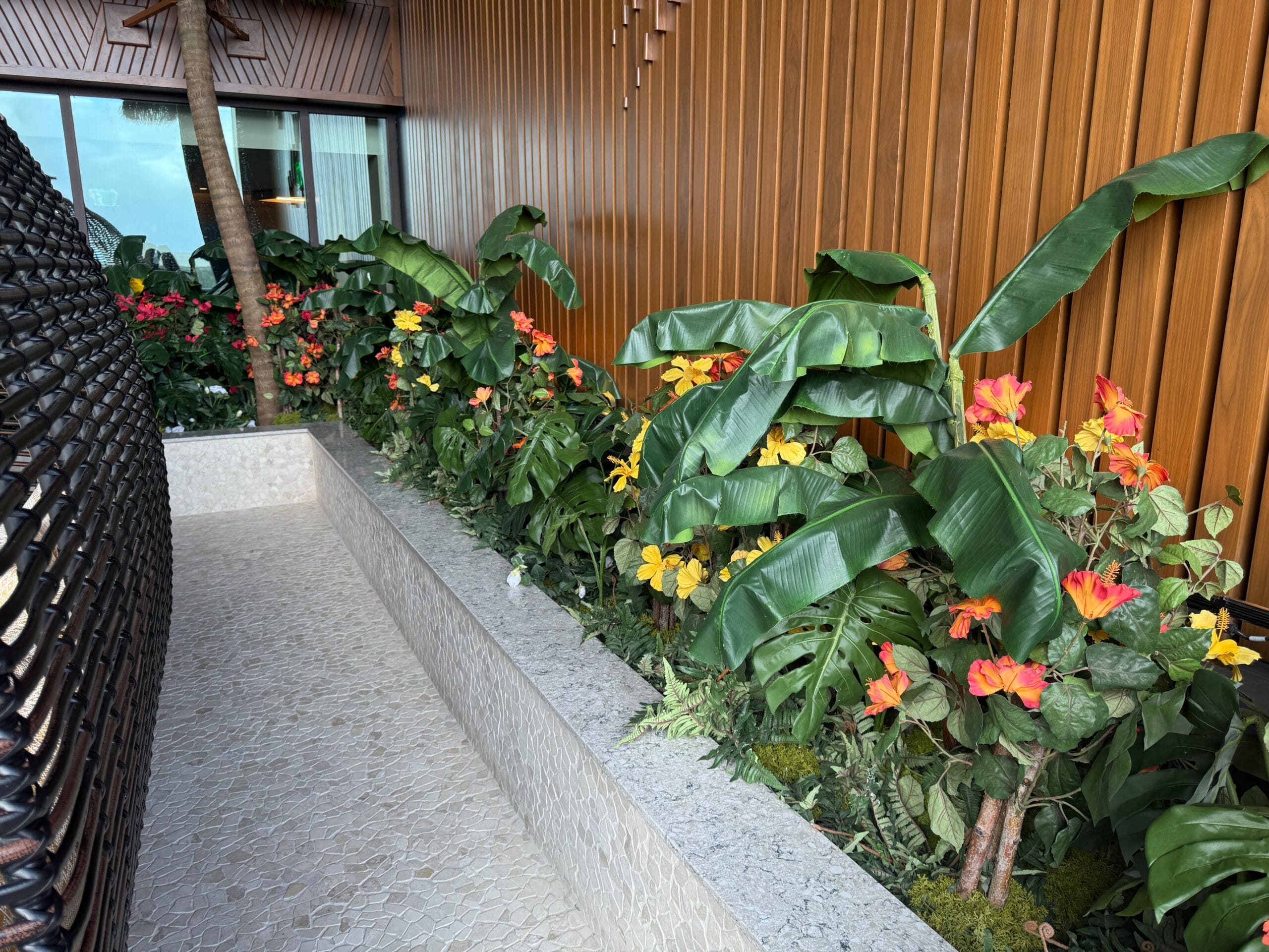 The gardens are two stories tall with windows on the inner walls so guests can also look out from inside. The ceiling is black with large island-shaped slatted decorations.